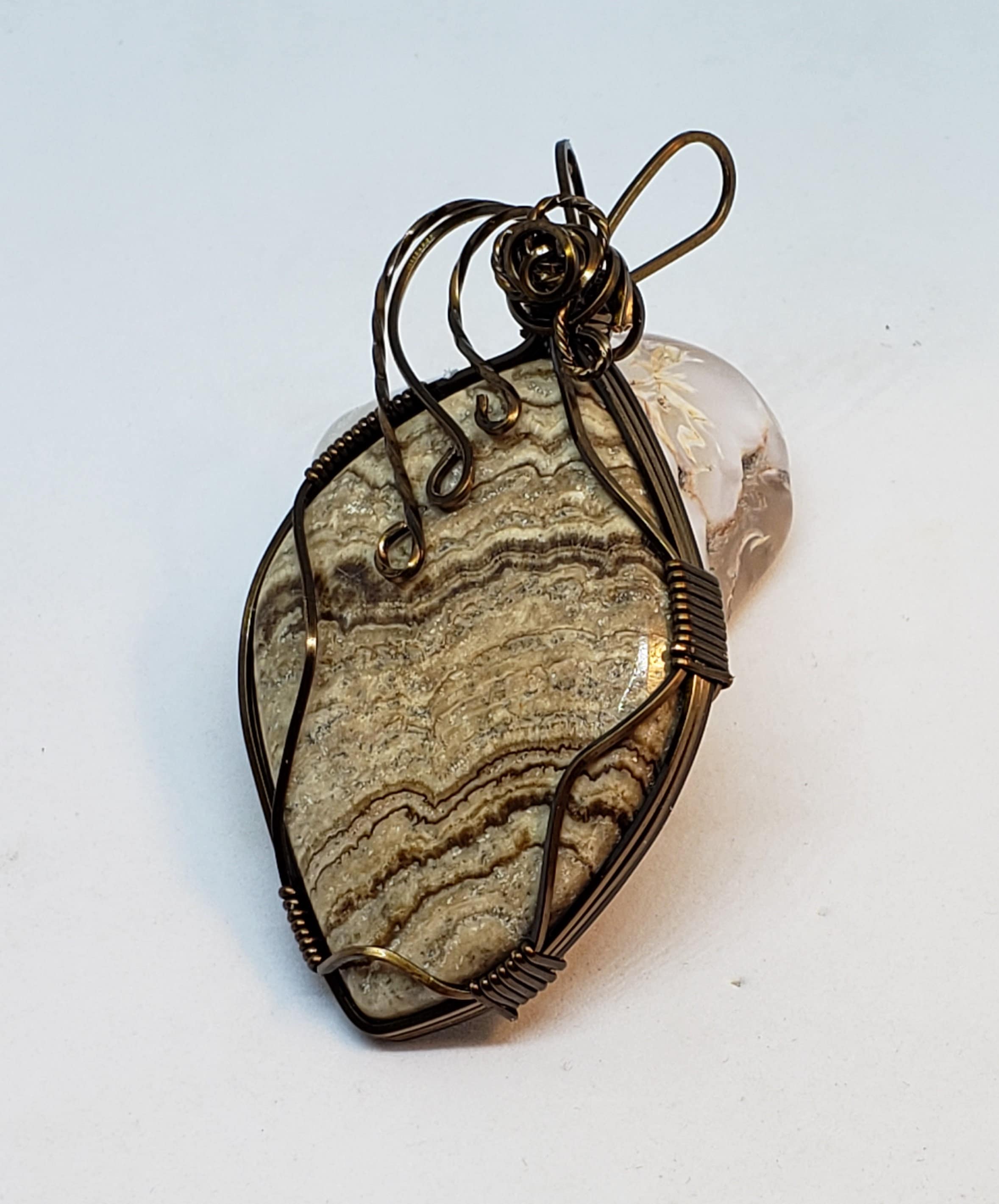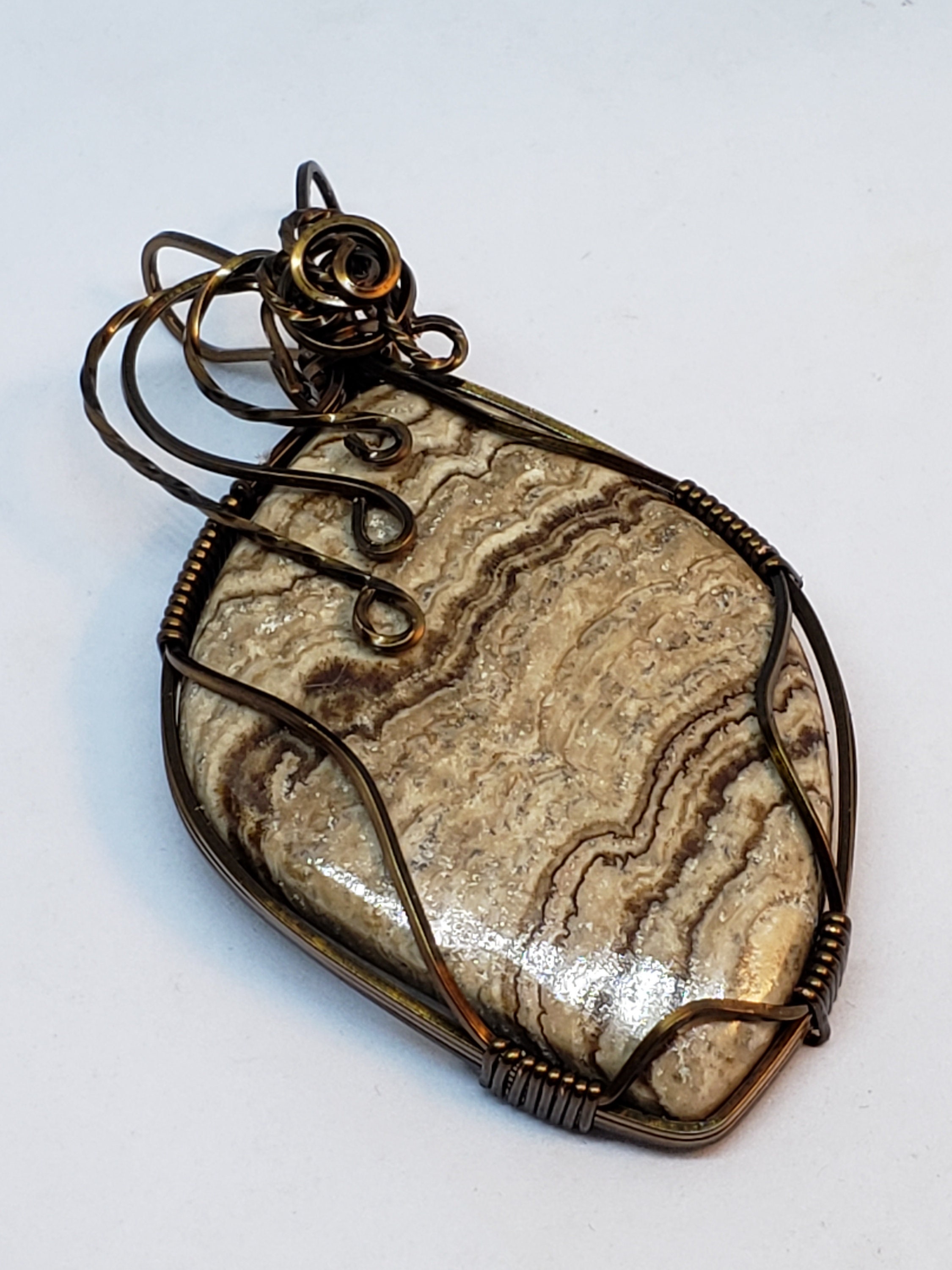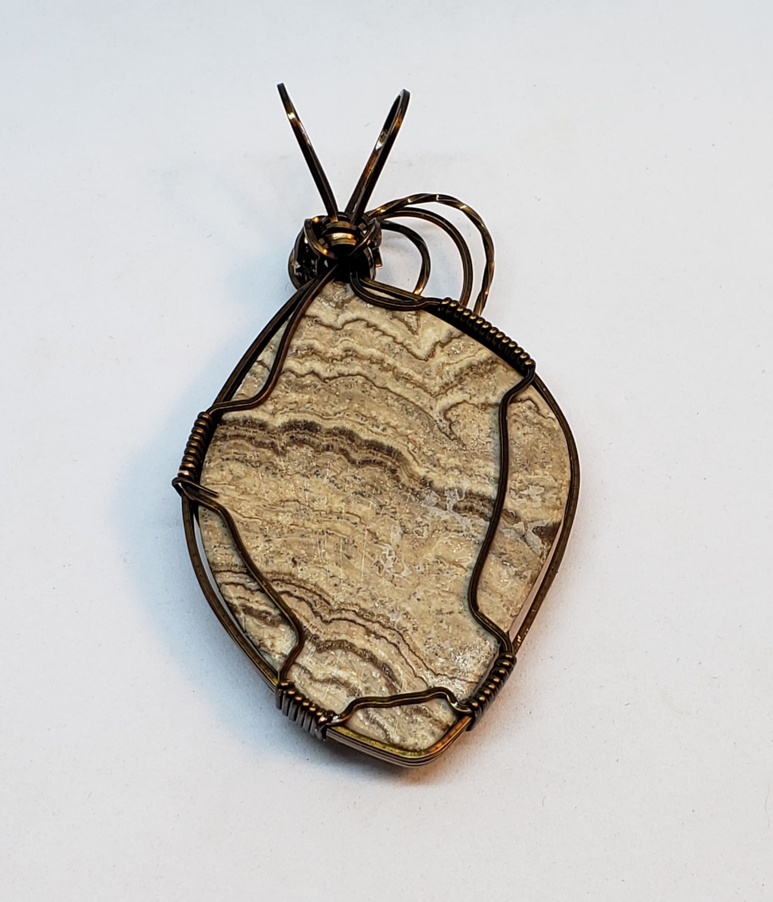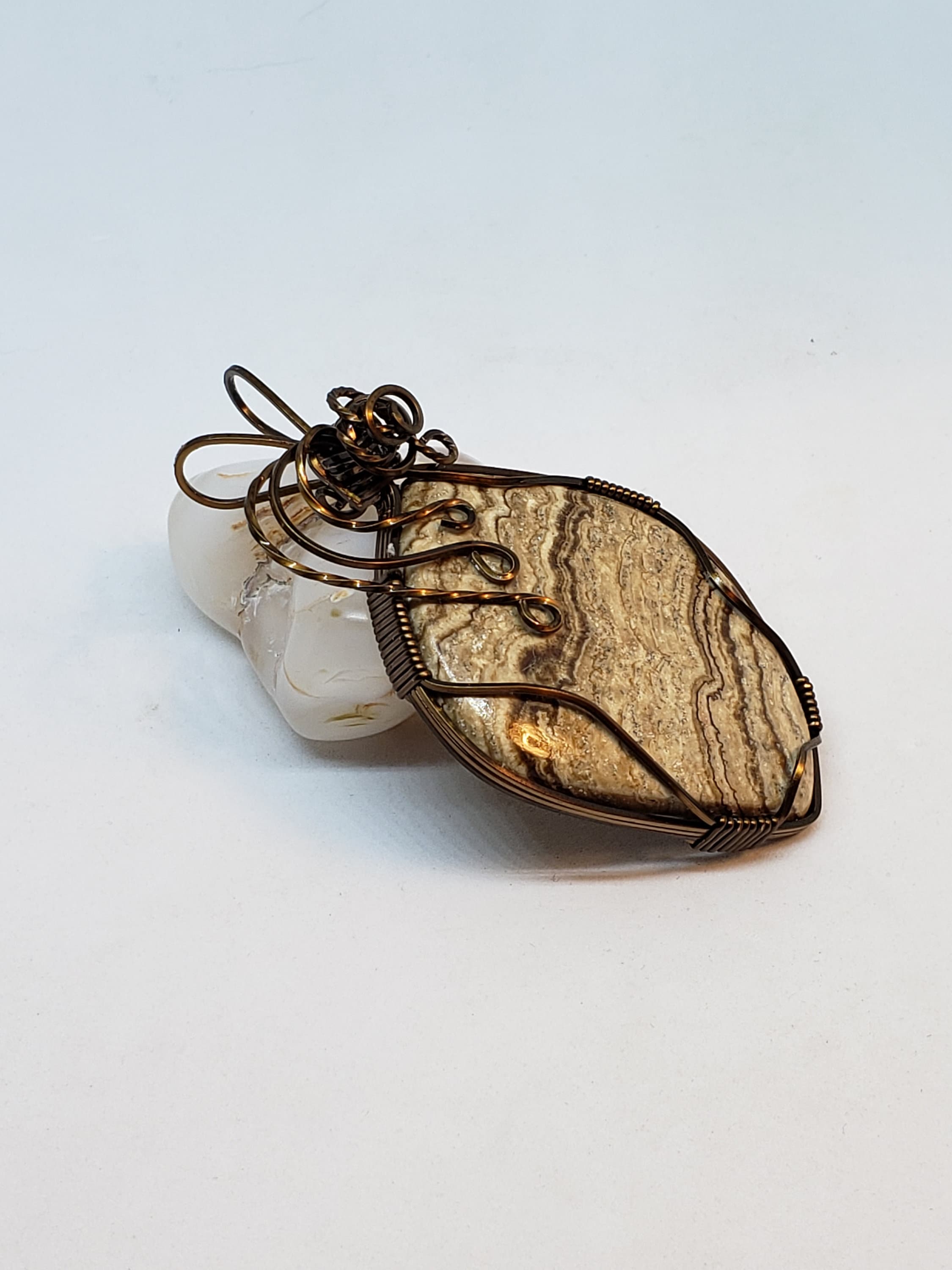 Wire Wrapped Picture Jasper pendant. This beautiful free form Picture Jasper is wrapped in antique bronze wire. Each piece looks like a different desert scene. This is a very large pendant measuring 2.5 inches long and has a bail large enough for a wide omega chain.