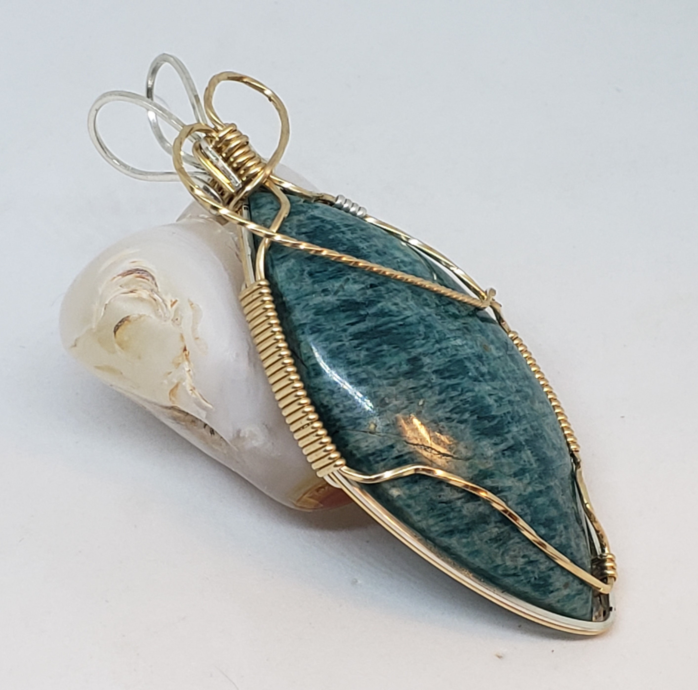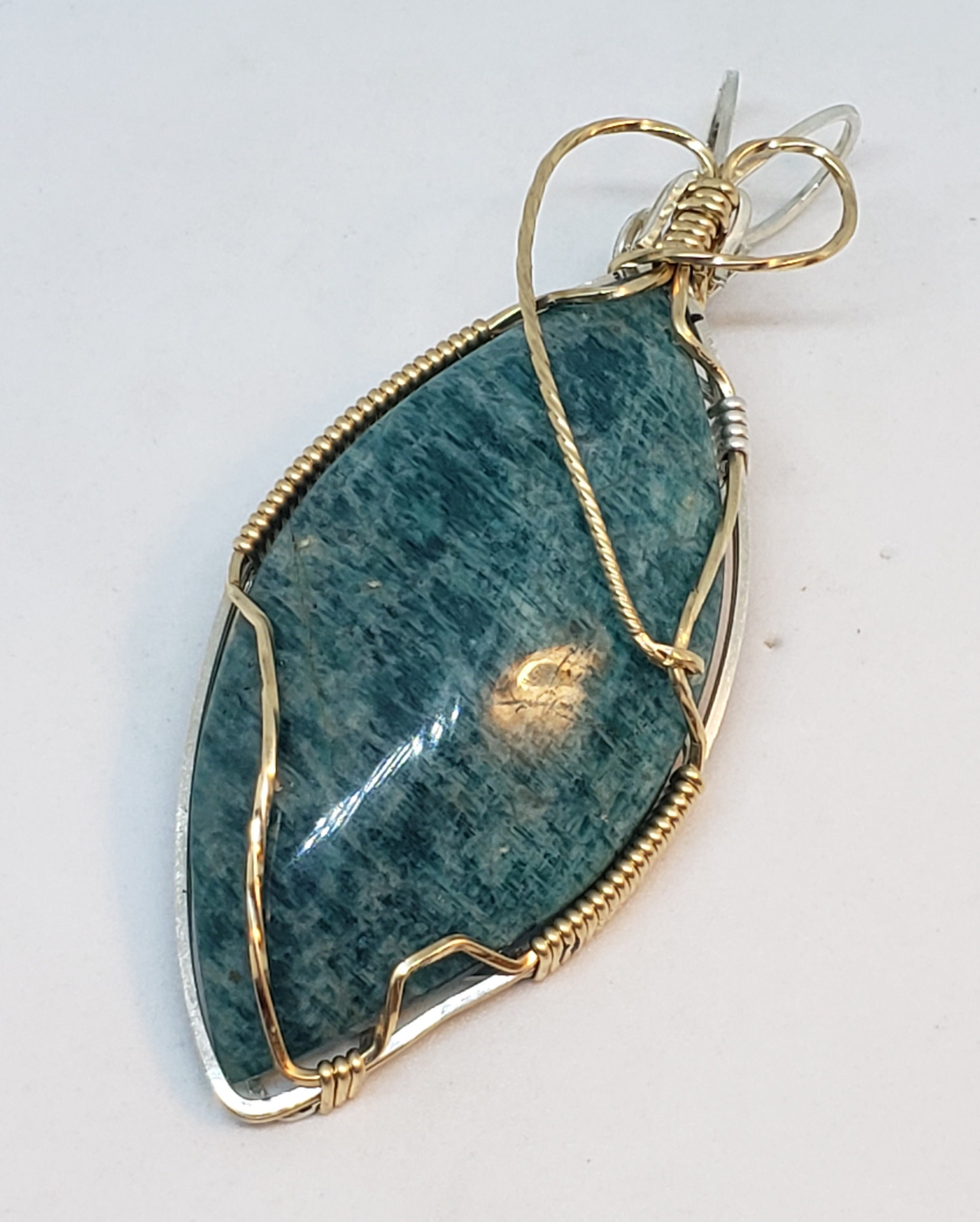 This large blue Apatite cabochon is wire wrapped in both gold filled and sterling silver wire.