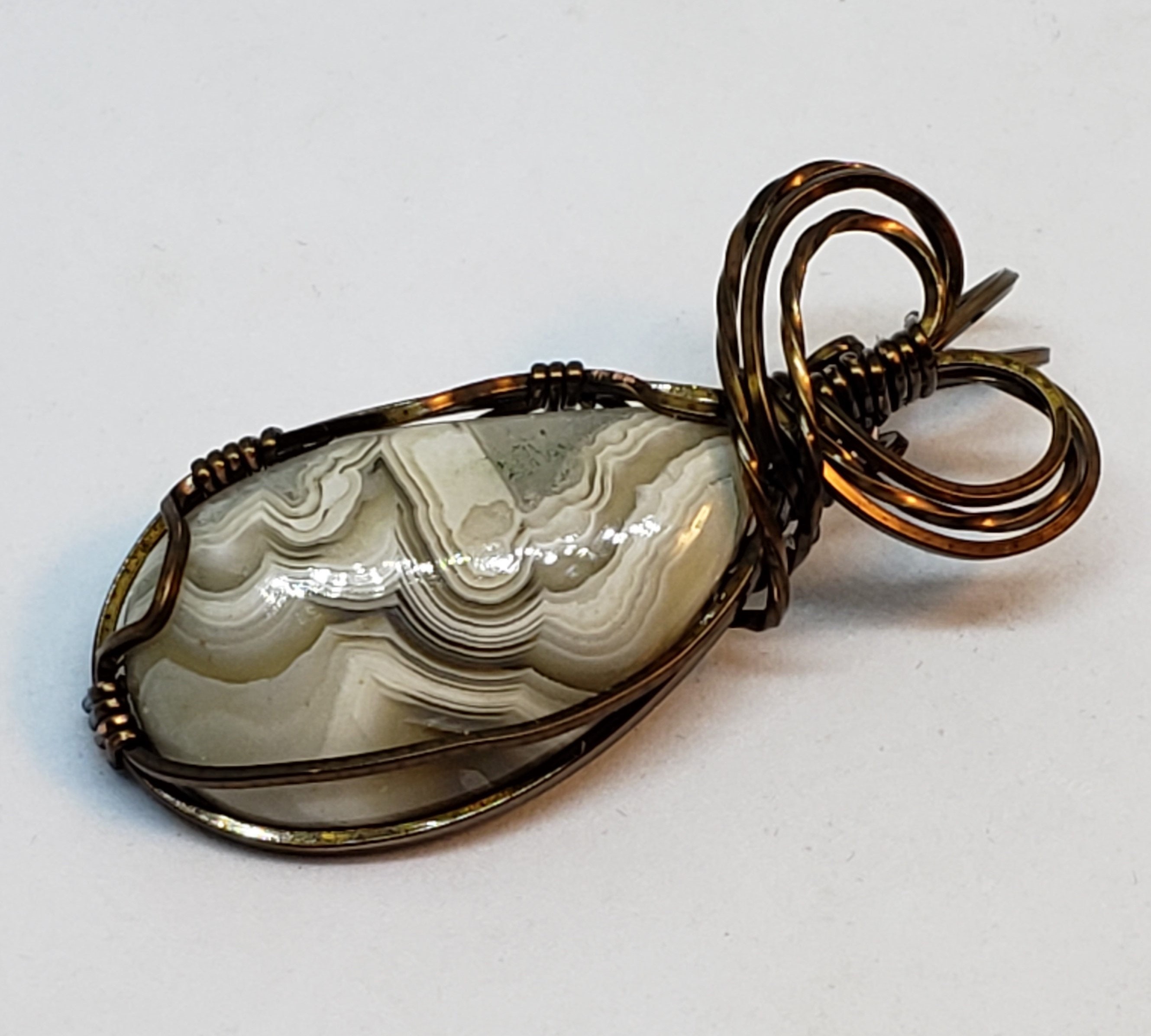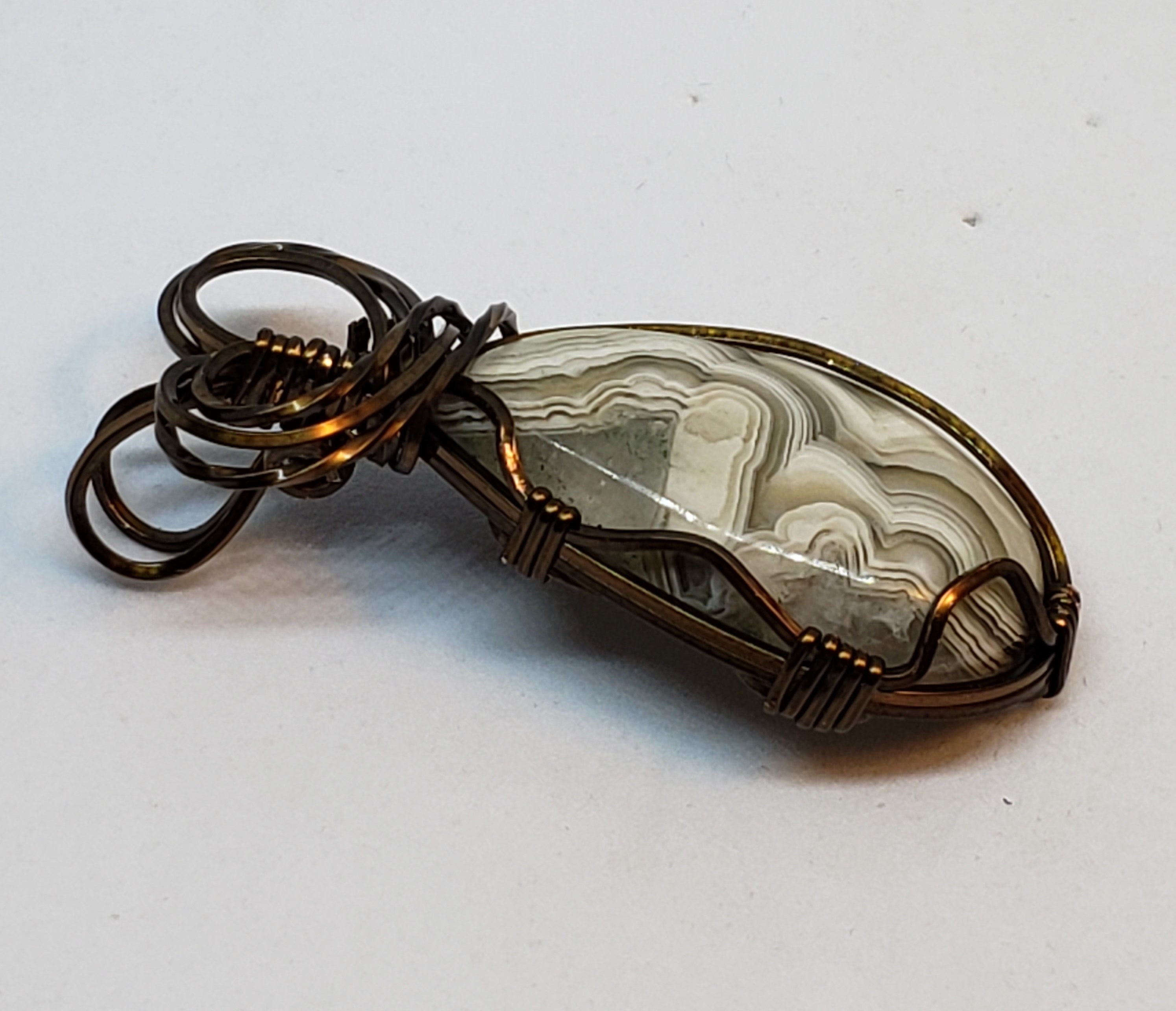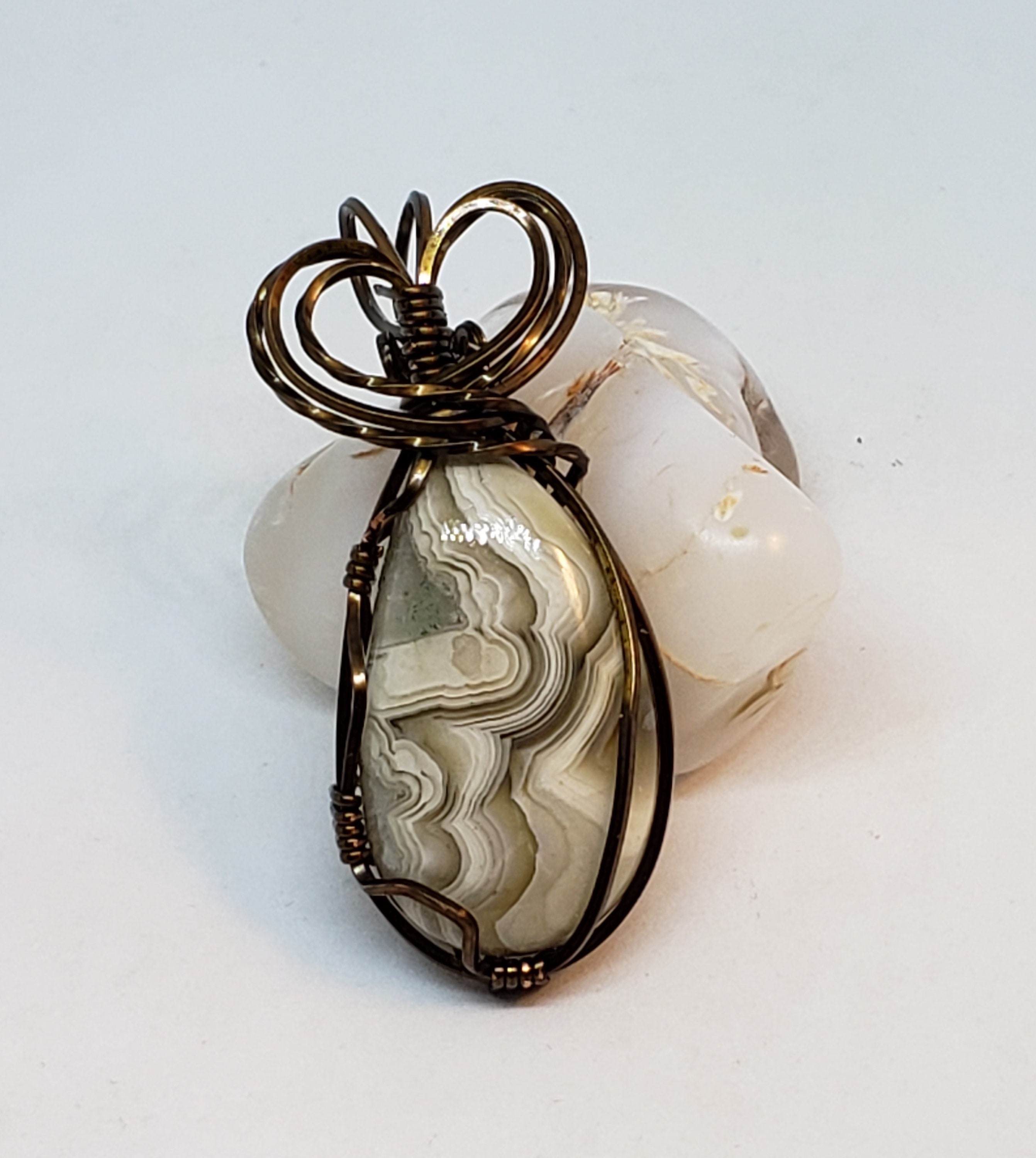 This crazy lace agate cabochon is wrapped in antique bronze wire. The piece measure 1.5" x .75". This would pair nicely with and antique bronze chain or brown leather cord.