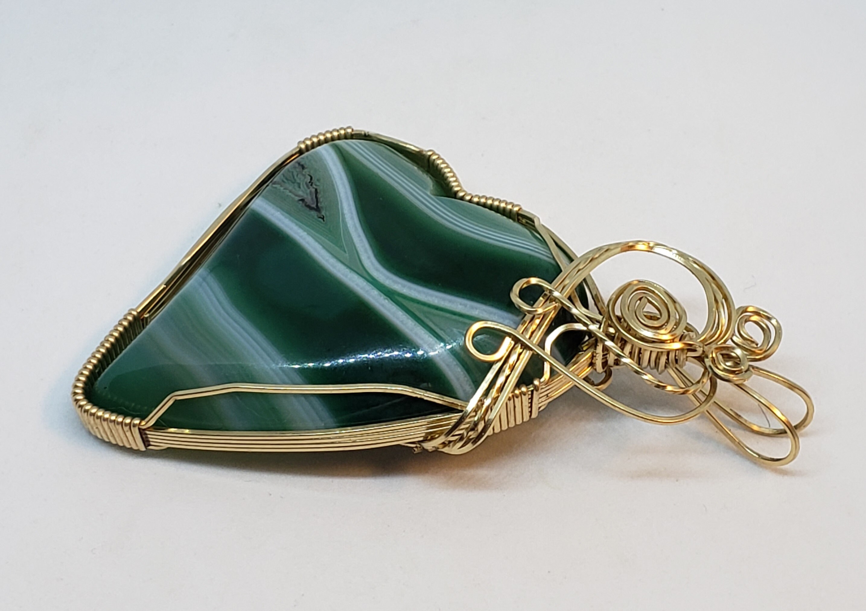 This green and white banded heart shaped agate cabochon is wrapped in gold filled wire wire. The piece measure 2.5" x 1.75". This a large statement piece.