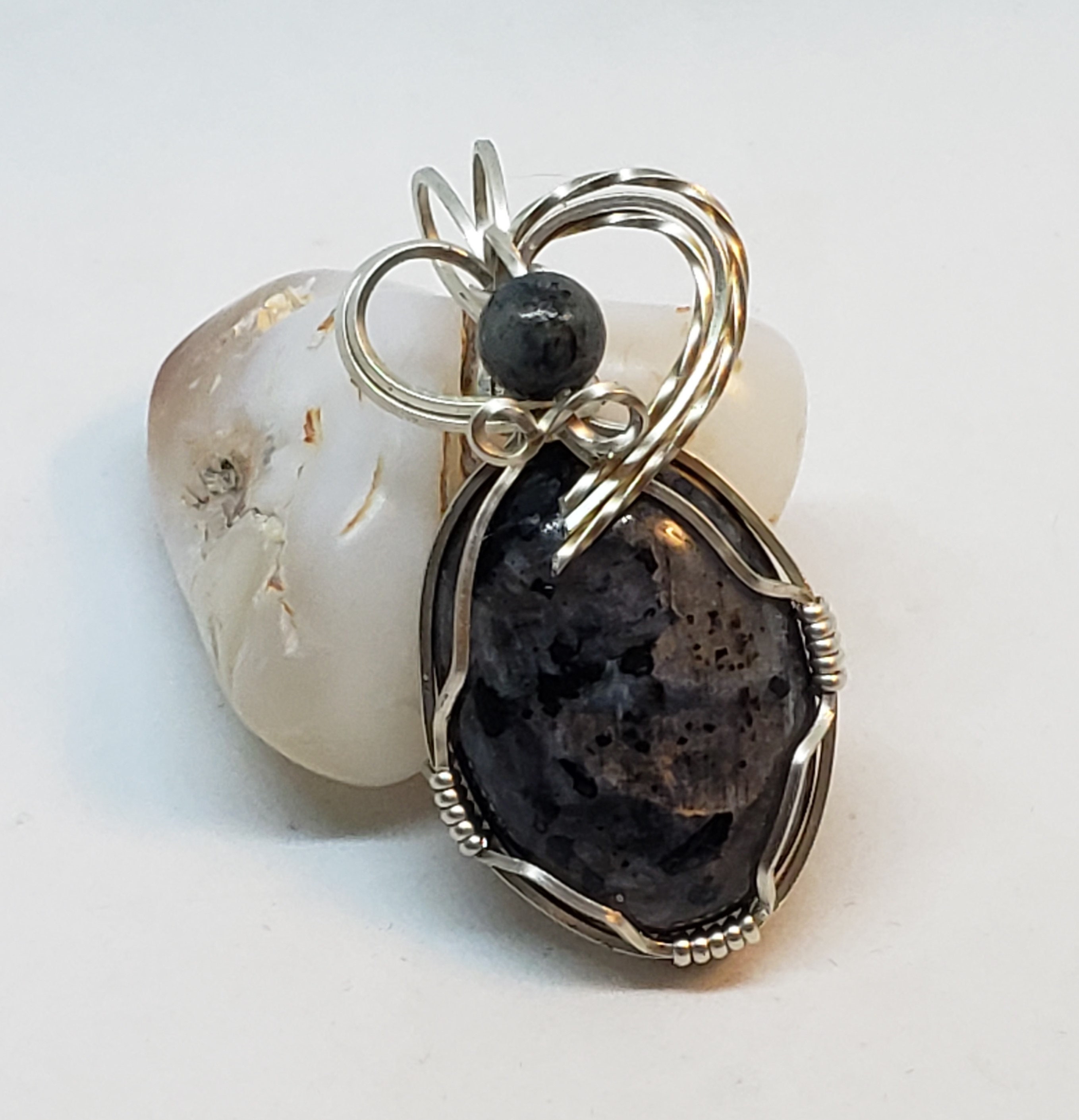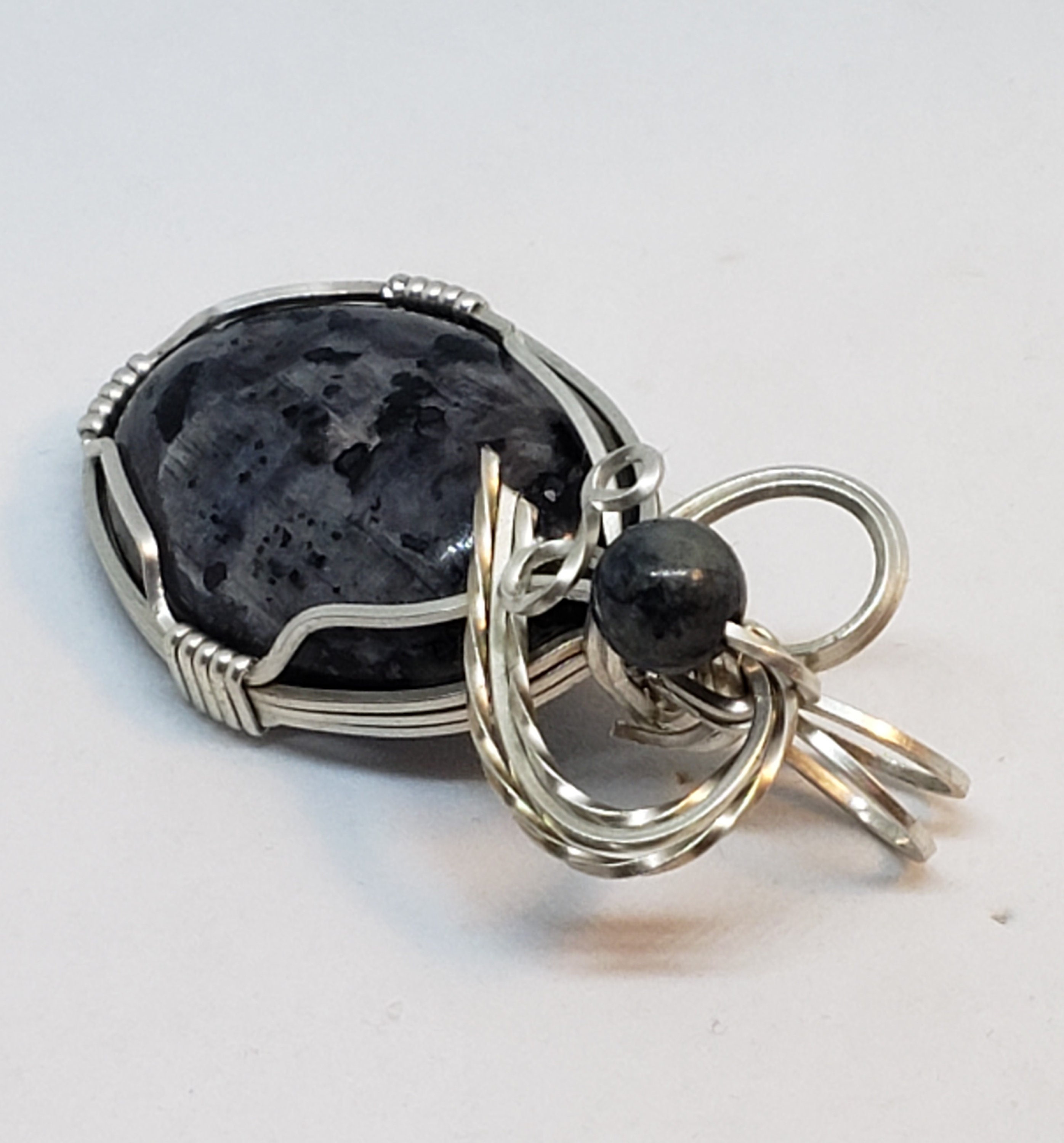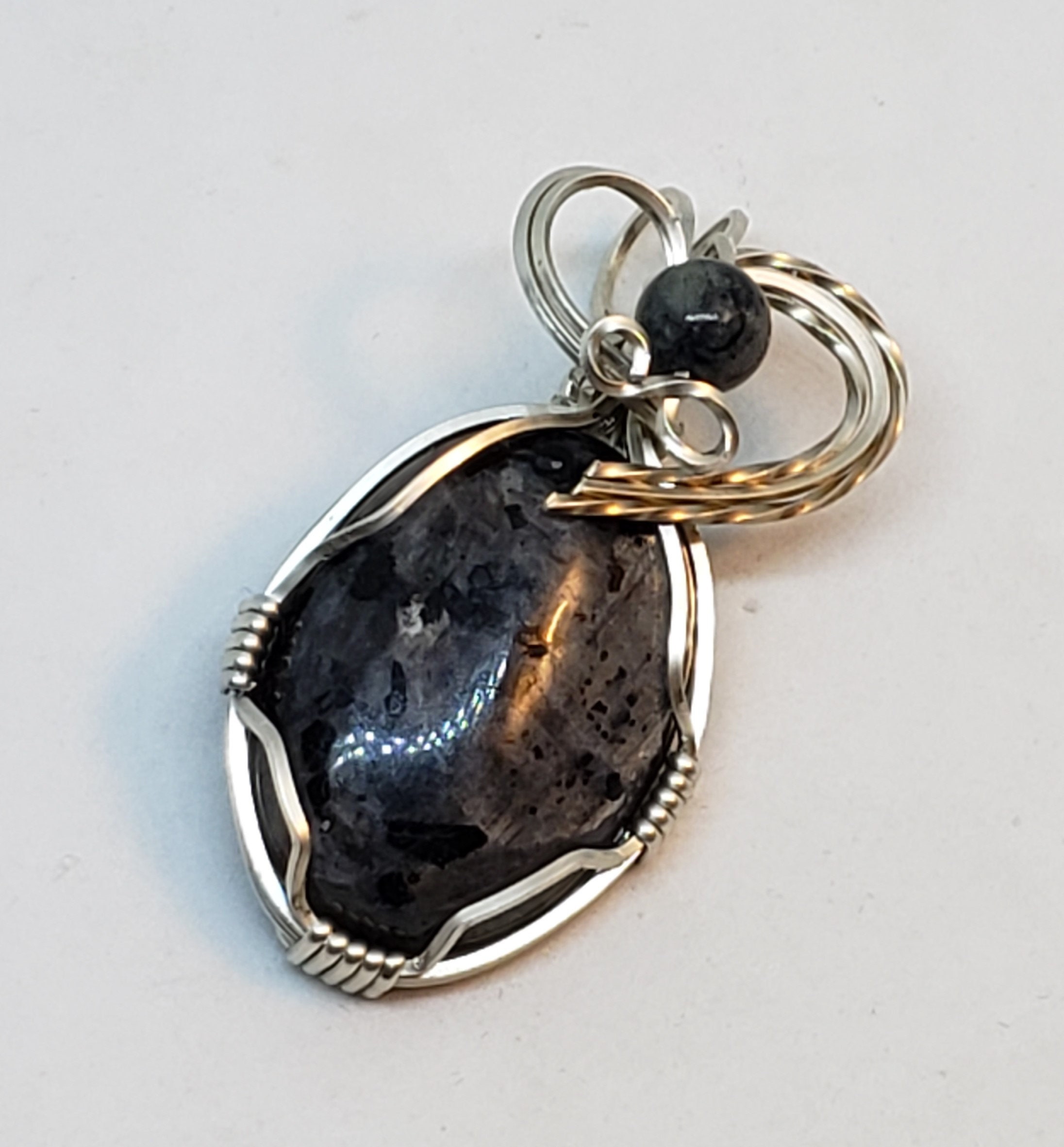 This pretty iridescent Larvakite ( Norwegian Moonstone) cabochon is wrapped in sterling silver wire and has a lavakite accent bead. It measures 1.75" long.