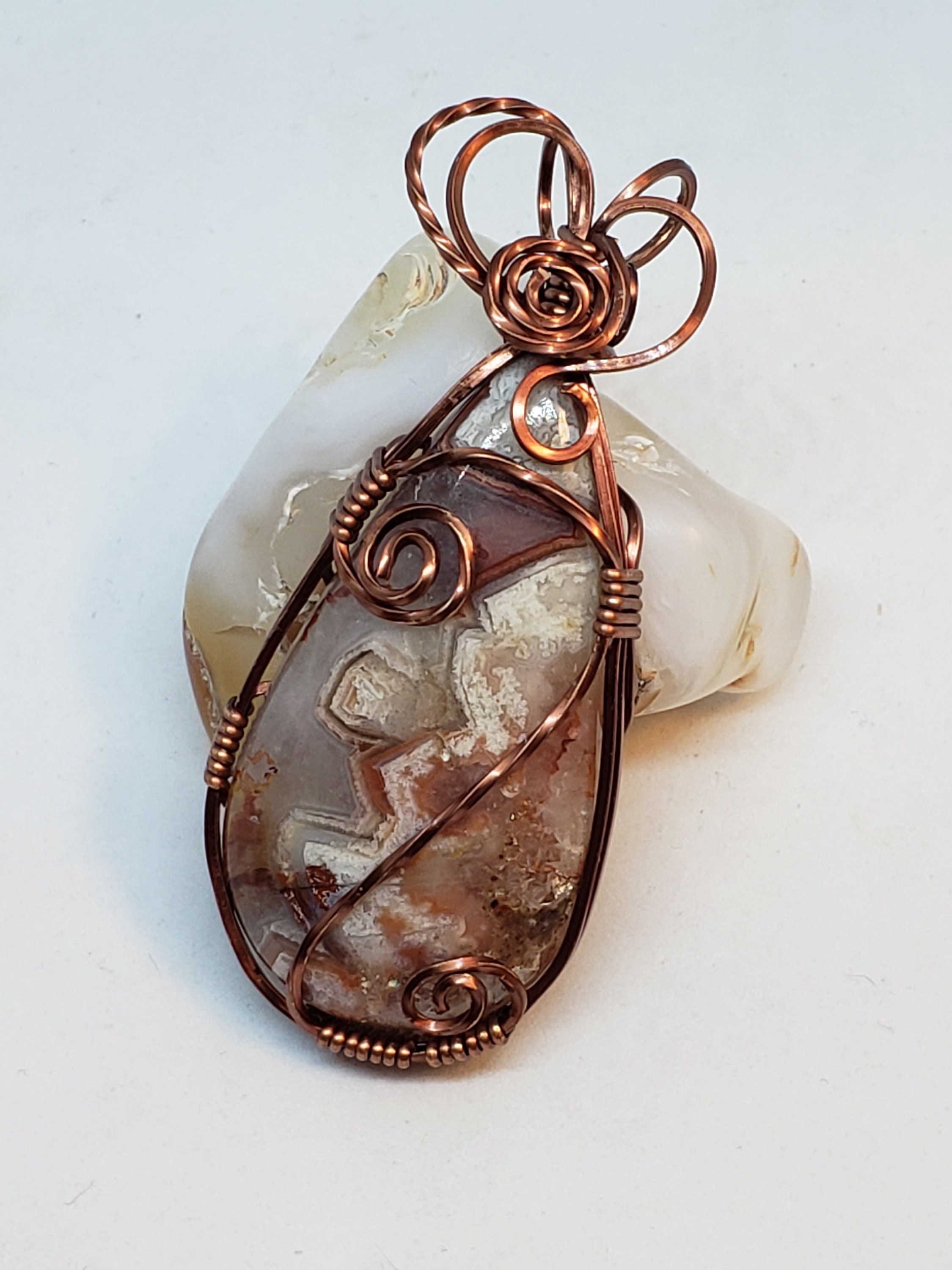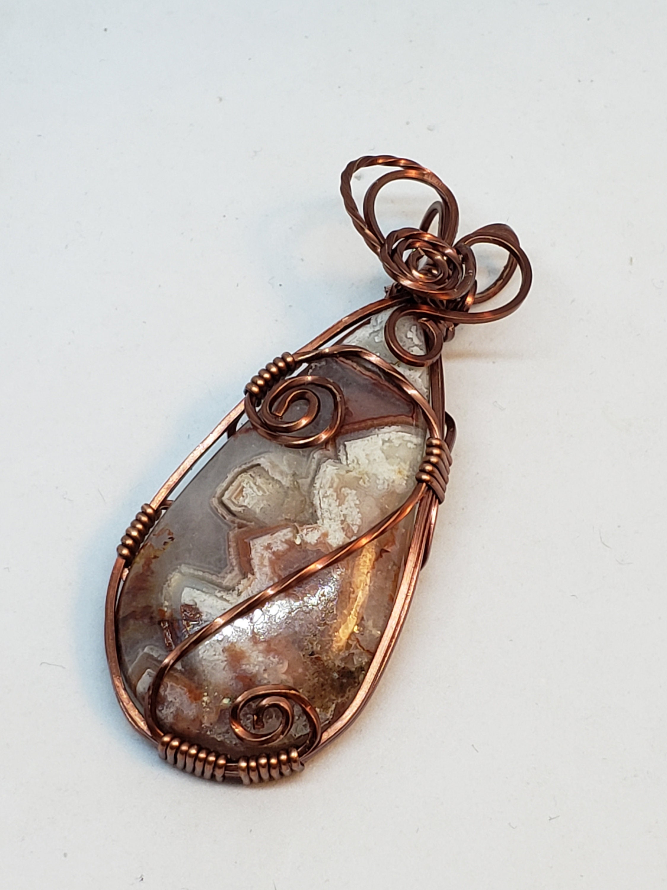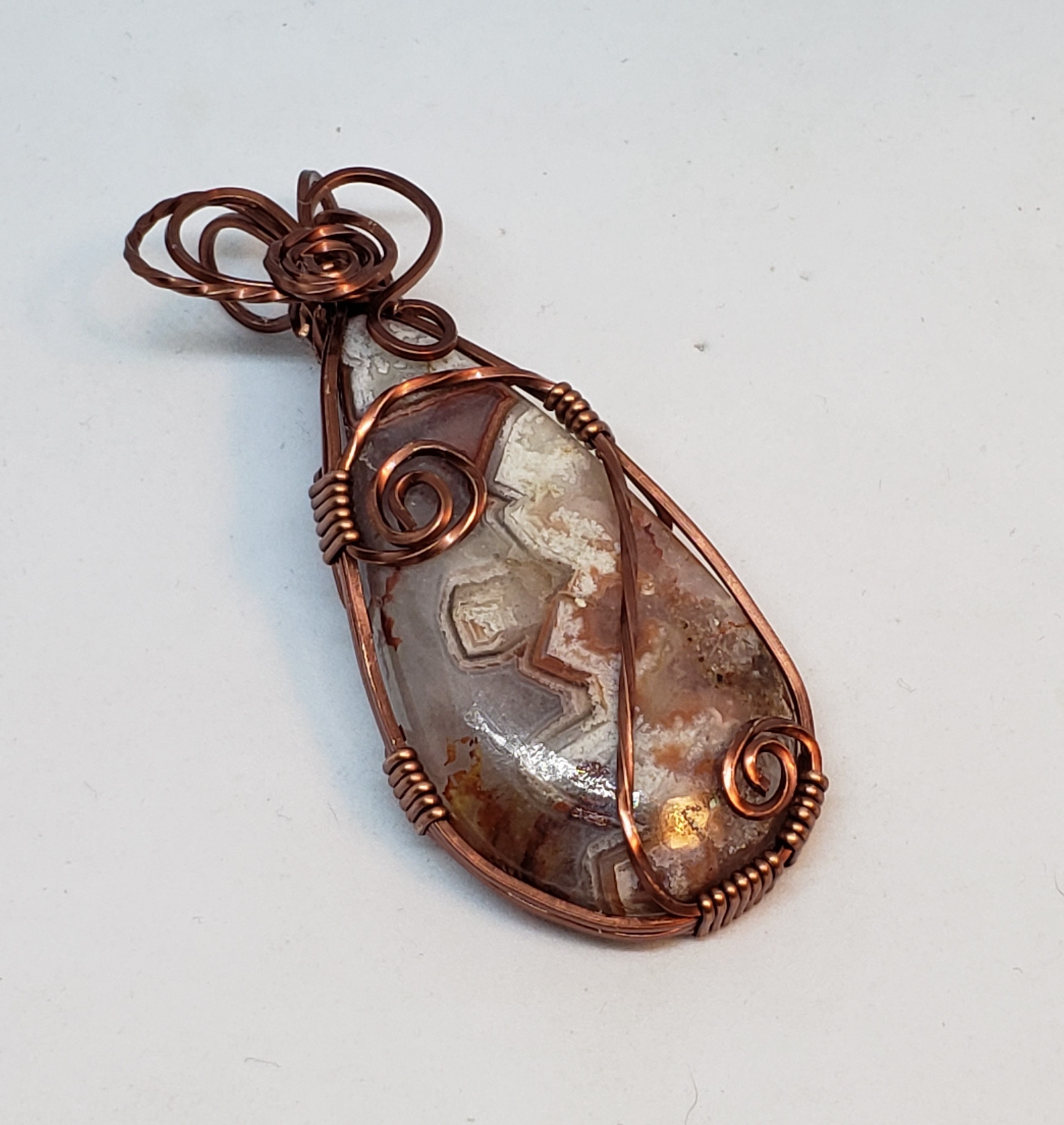 Crazy lace Agate Pendant wrapped in copper wire. Pendant measures 2" x1"