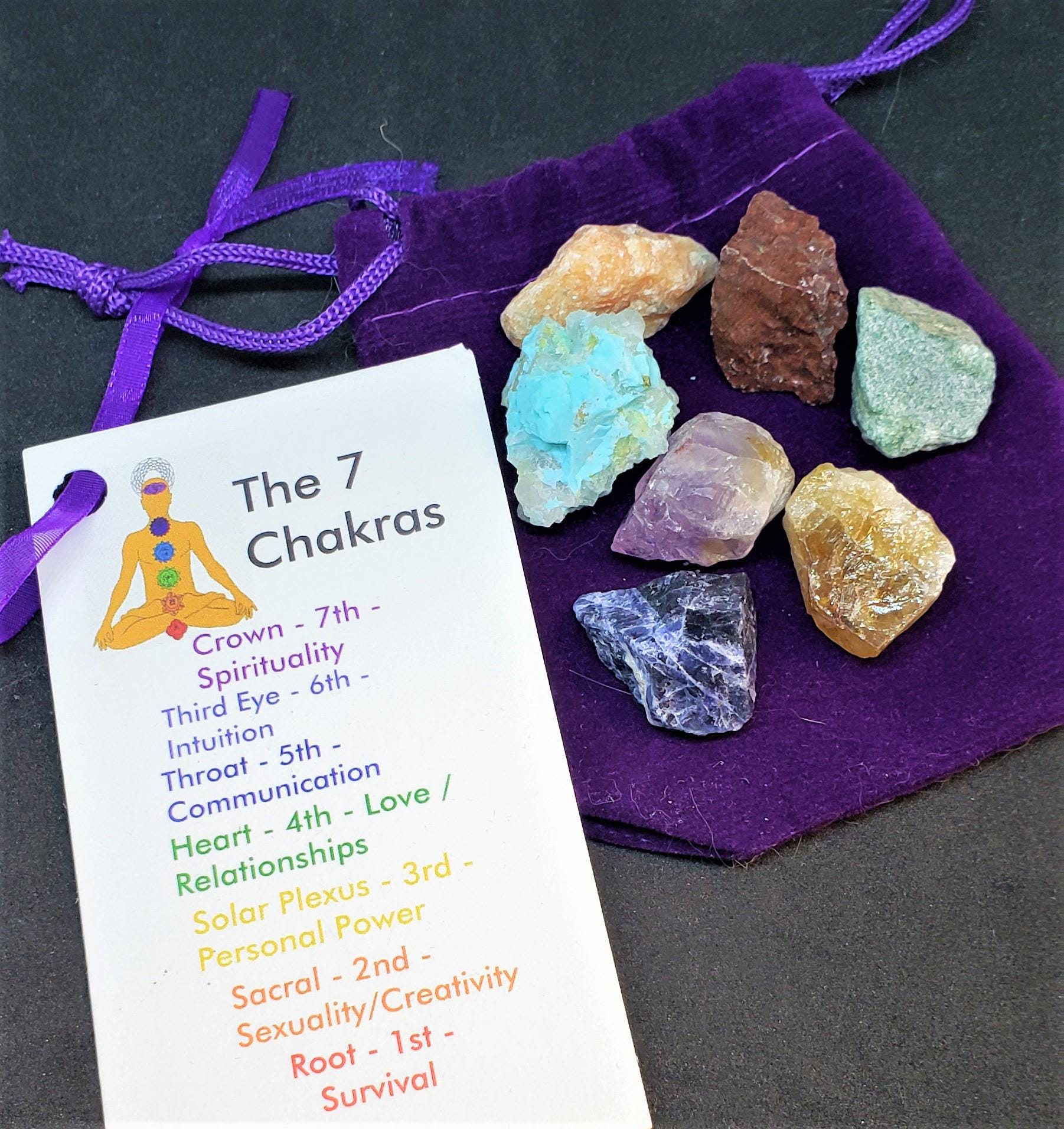 Each Chakra pouch contains seven stones in seven different colors, one for each of the seven main chakras. Each kit comes in a purple velvet or voile pouch and includes a card showing the location of each of the chakras. Examples of stones include are: Amethyst, Iolite, Lapis, Blue Lace Agate, Aventurine, Carnelian, Garnet, Citrine, Amazonite, Tiger eye, Calcite, ect.