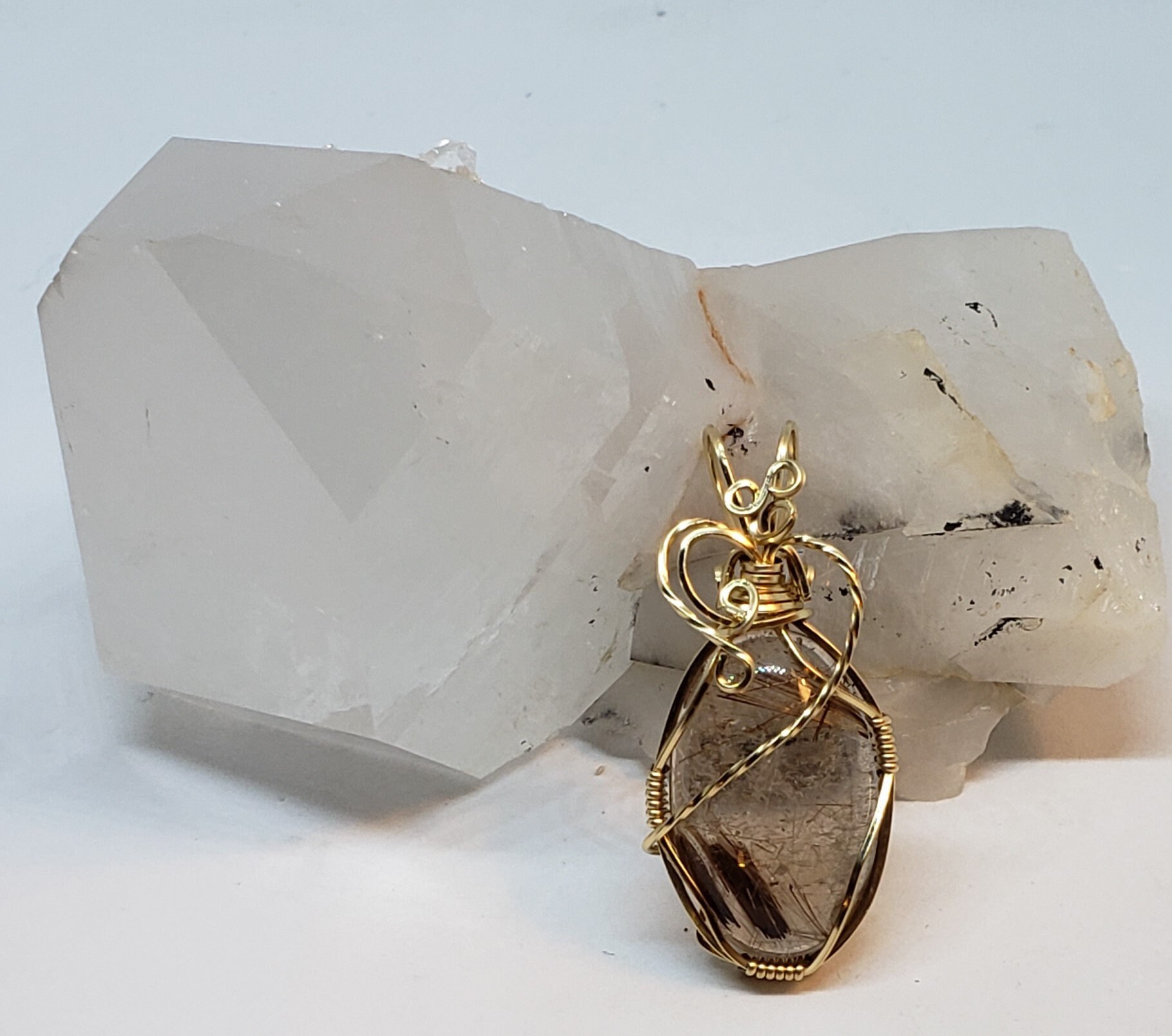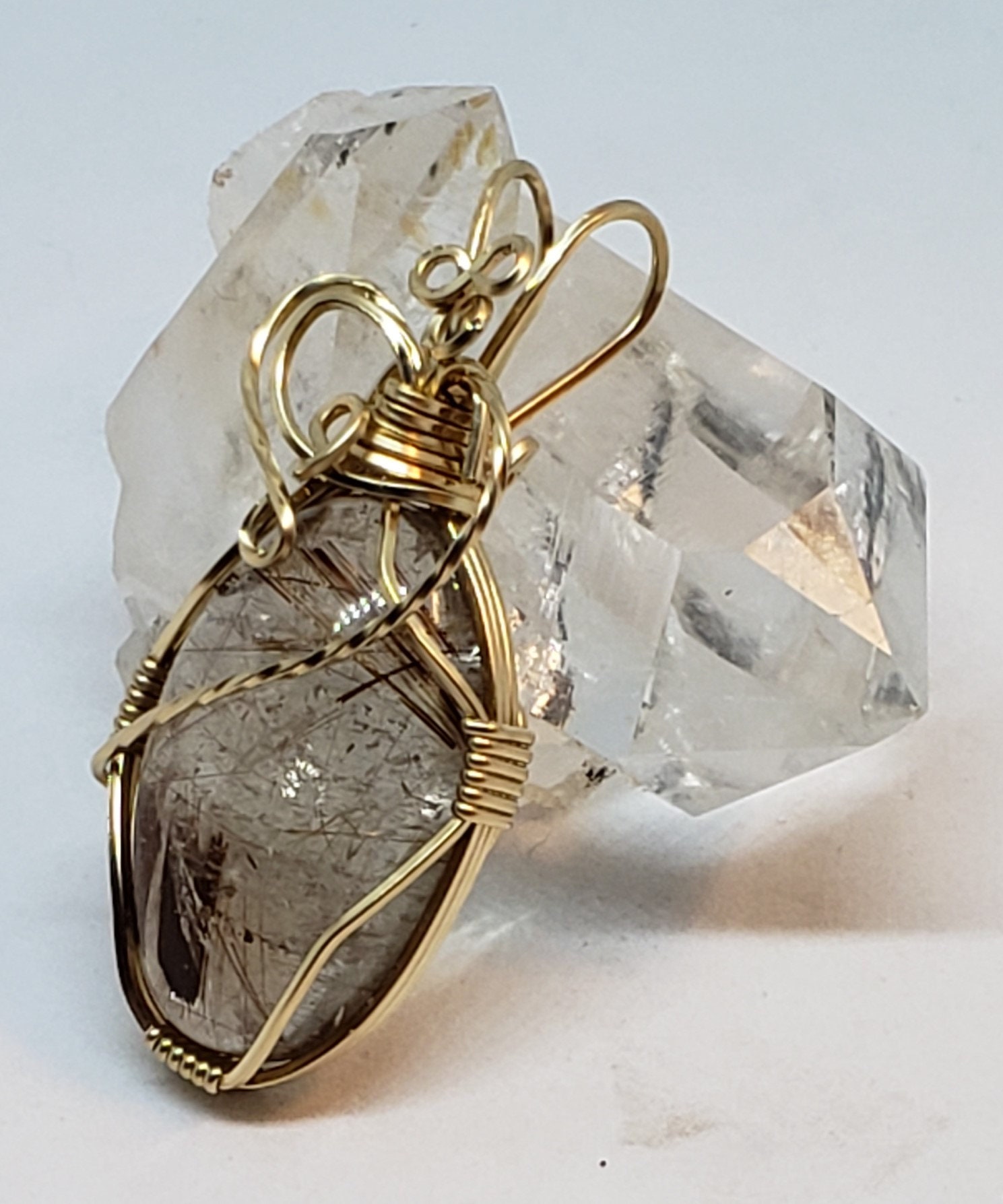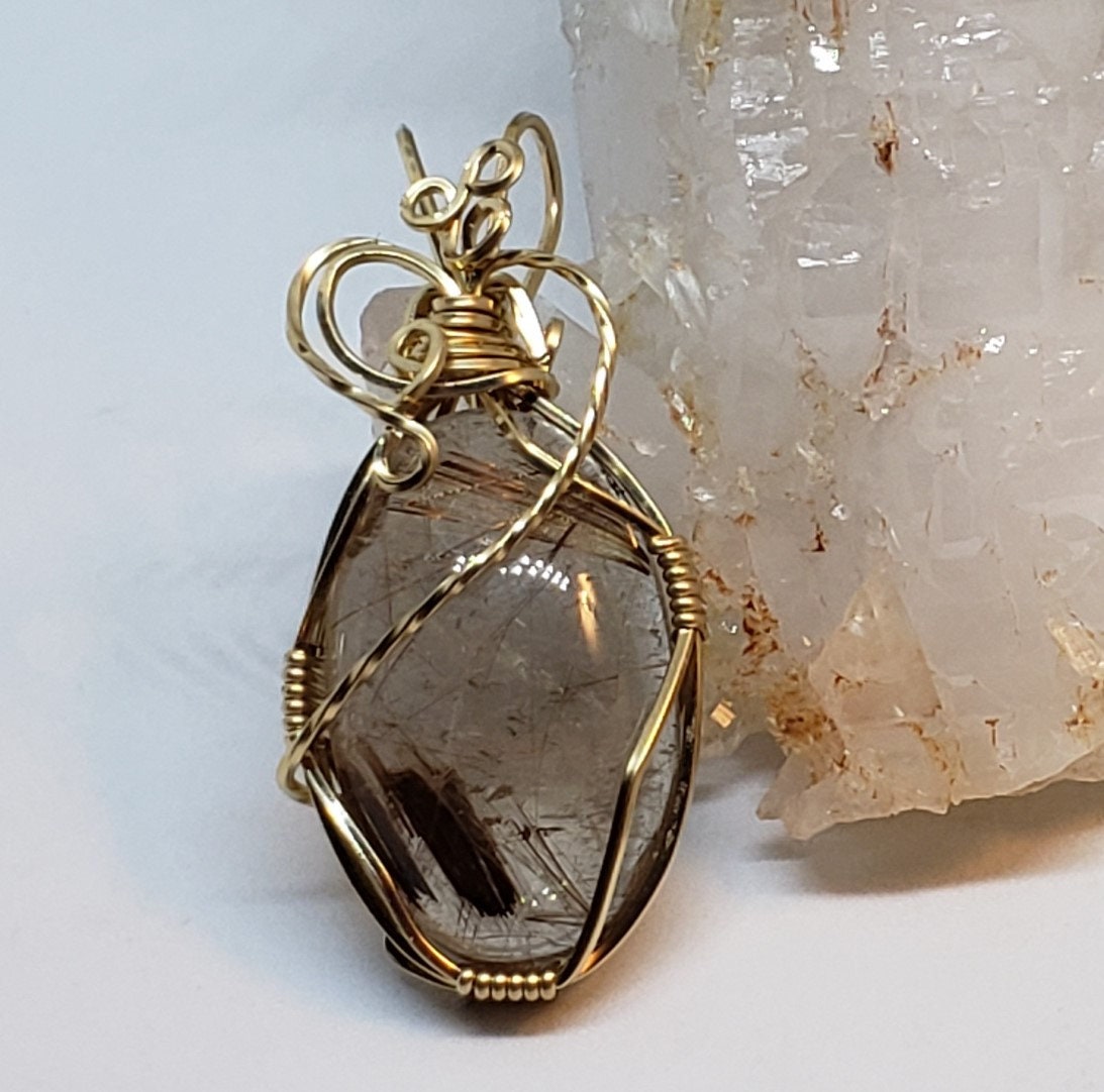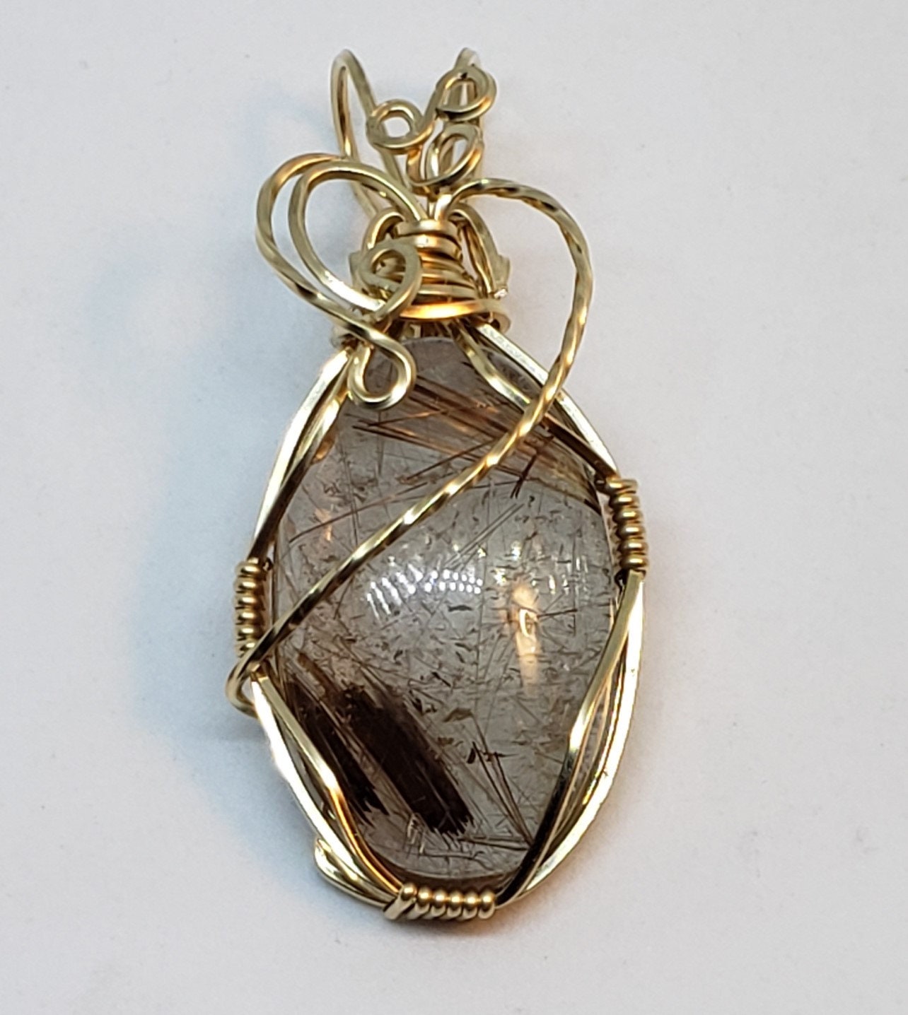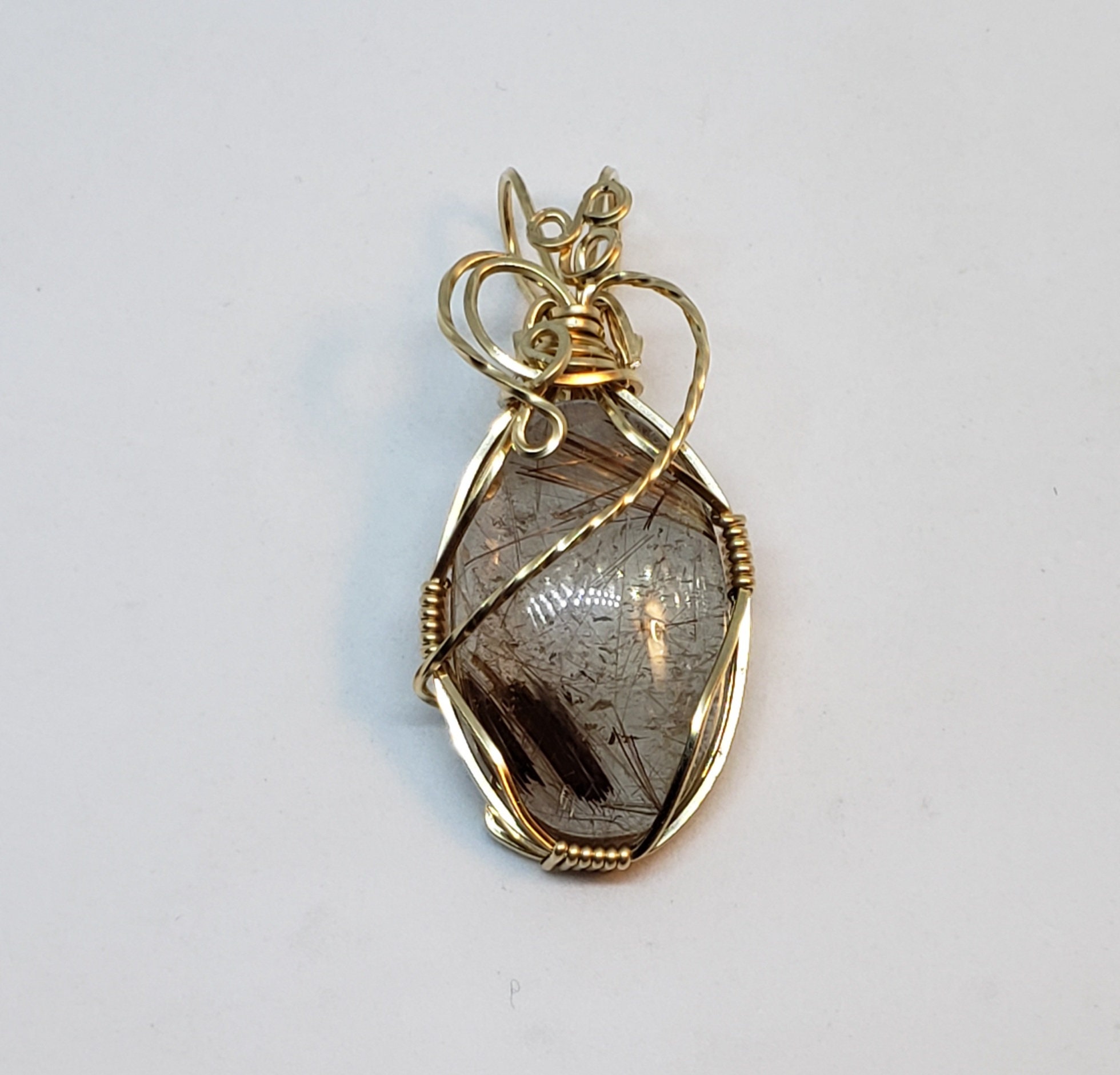 Rutilated Quartz cabochon Wrapped in gold filled wire.