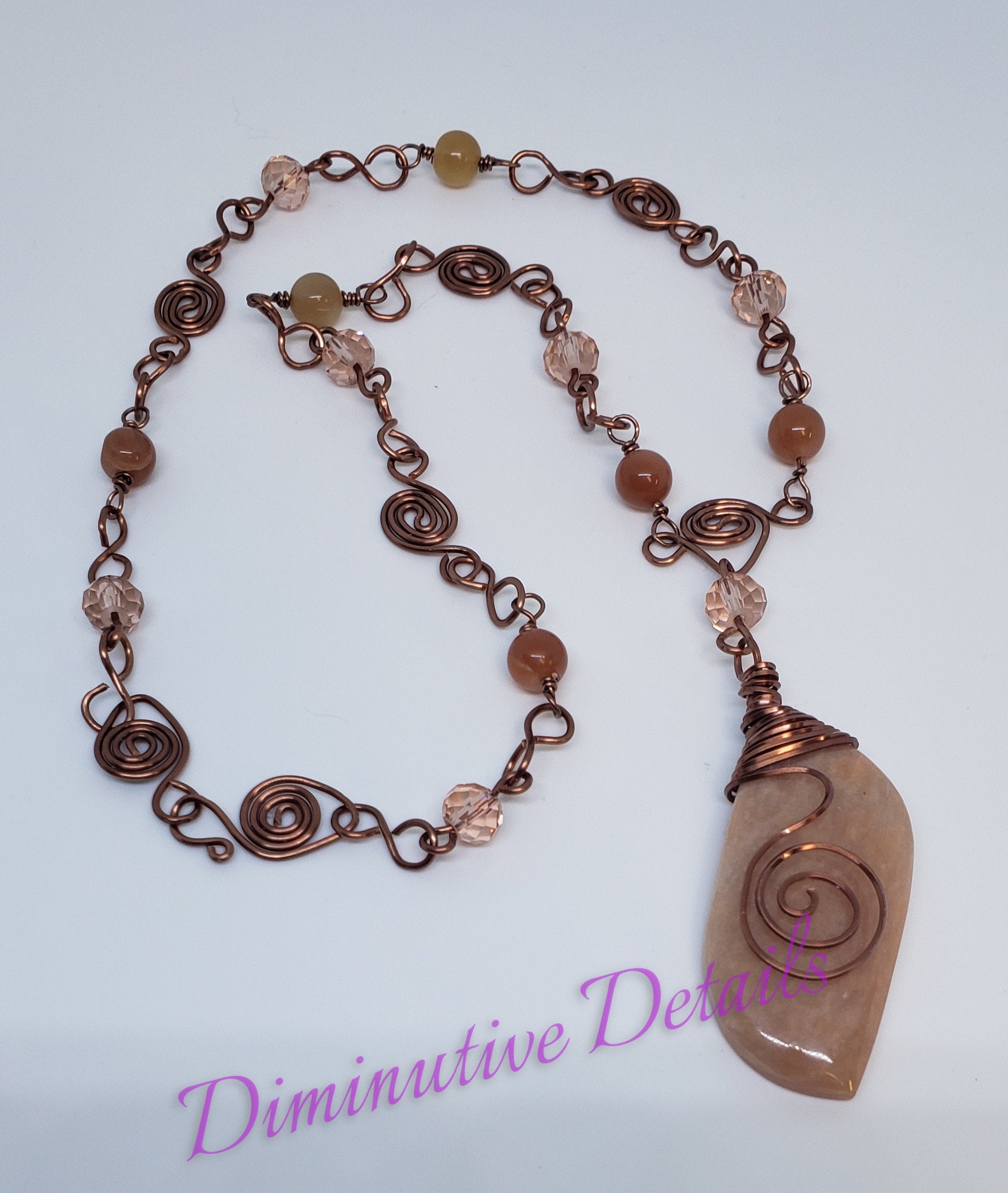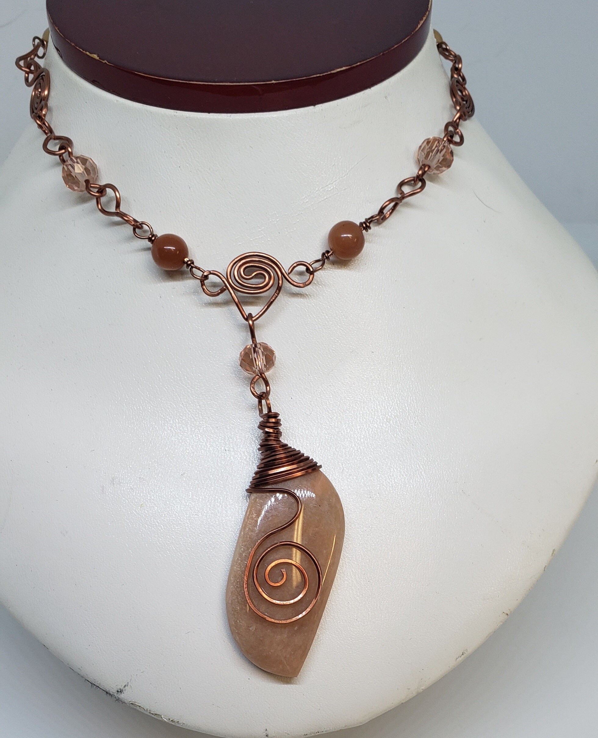 Wire wrapped Peach moonstone pendant suspended on a handmade wire figure 8 and spiral necklace with peach crystals and round peach moonstone beads.