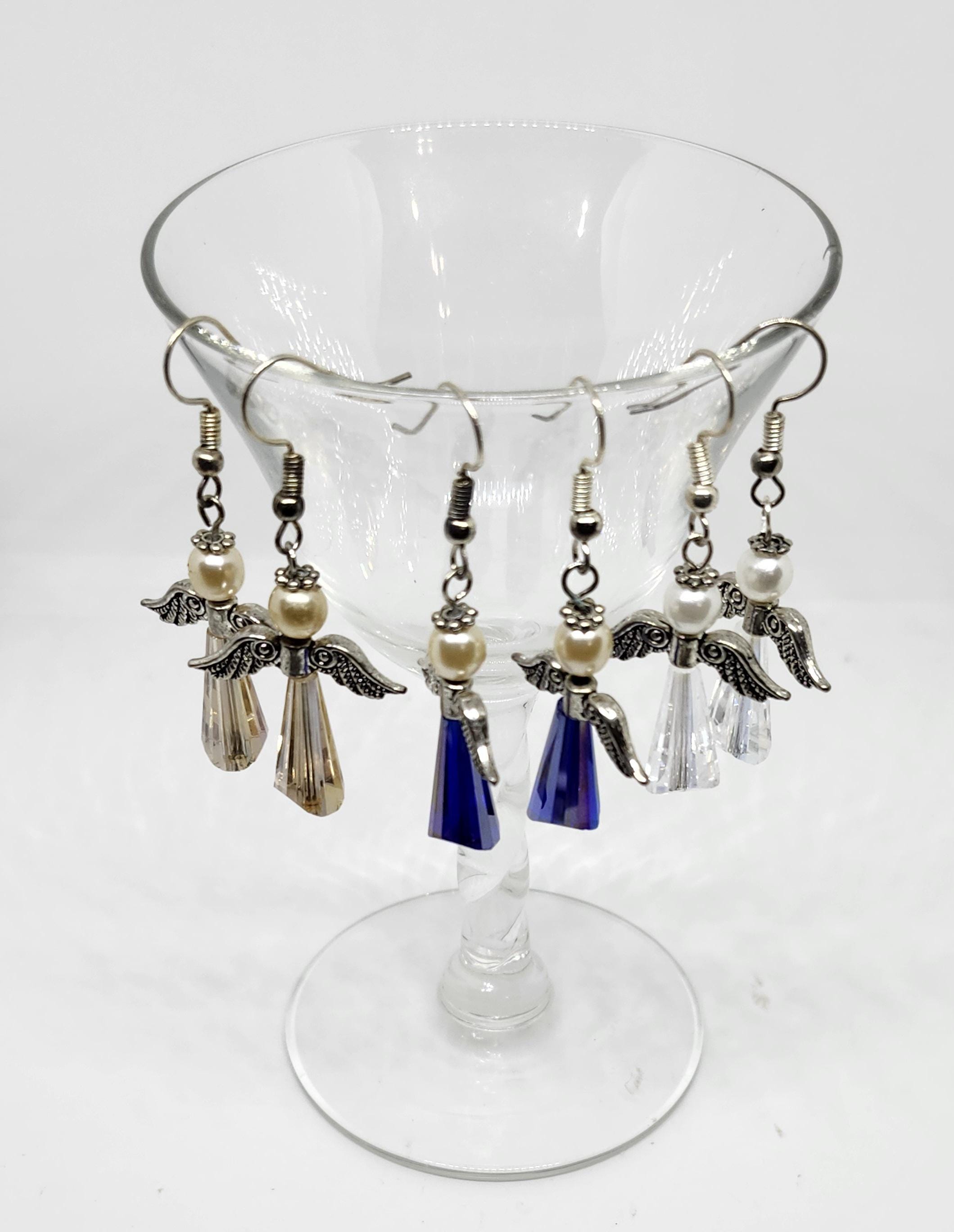 Crystal Angel earrings with metal wings and faux pearl on silver plated fishhook ear wires.