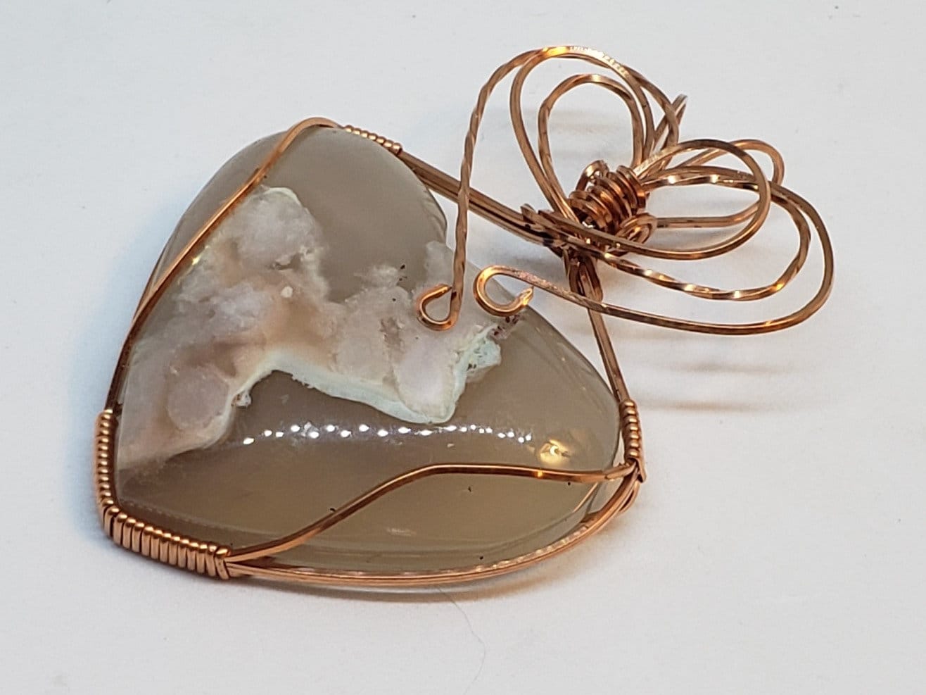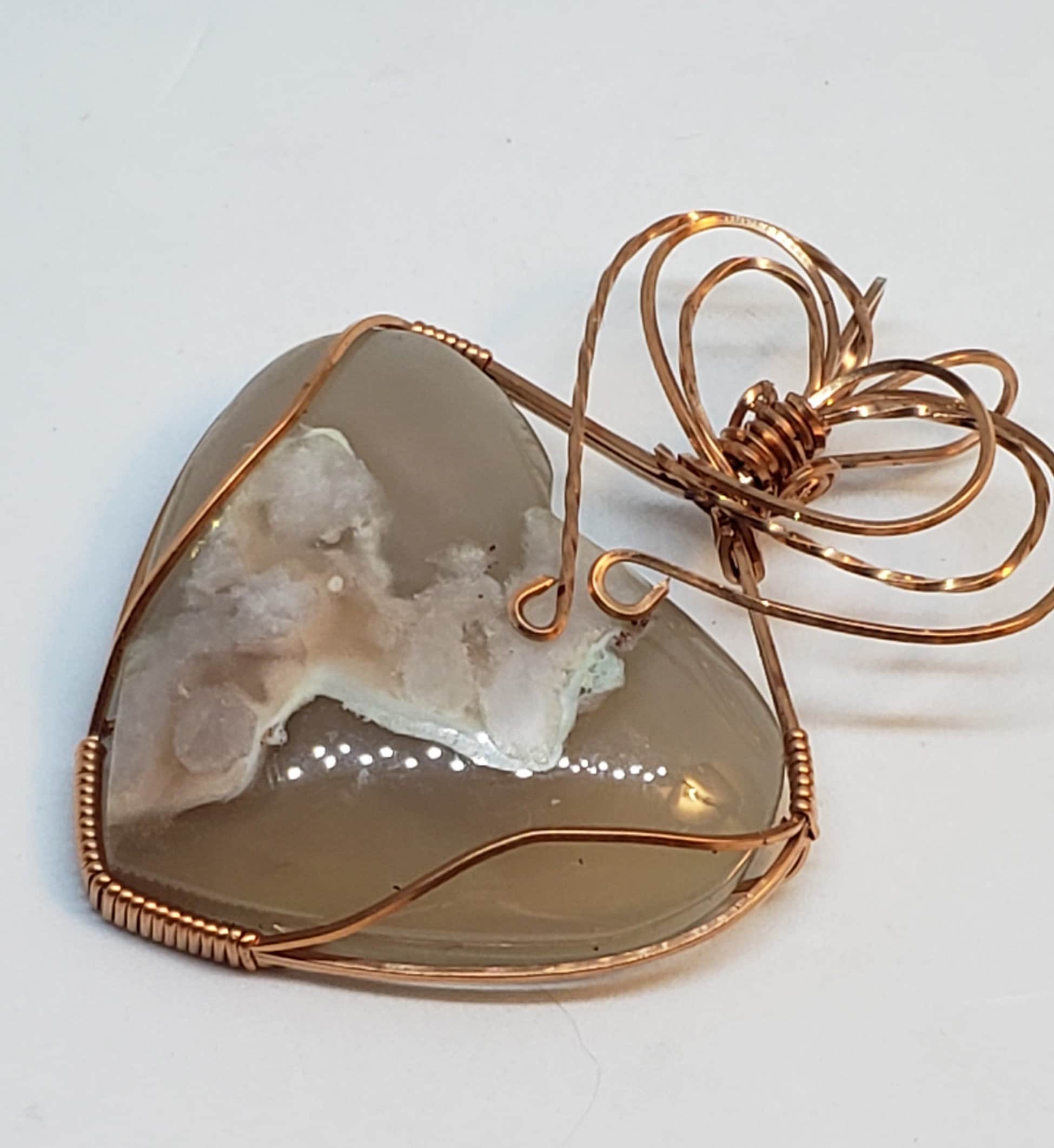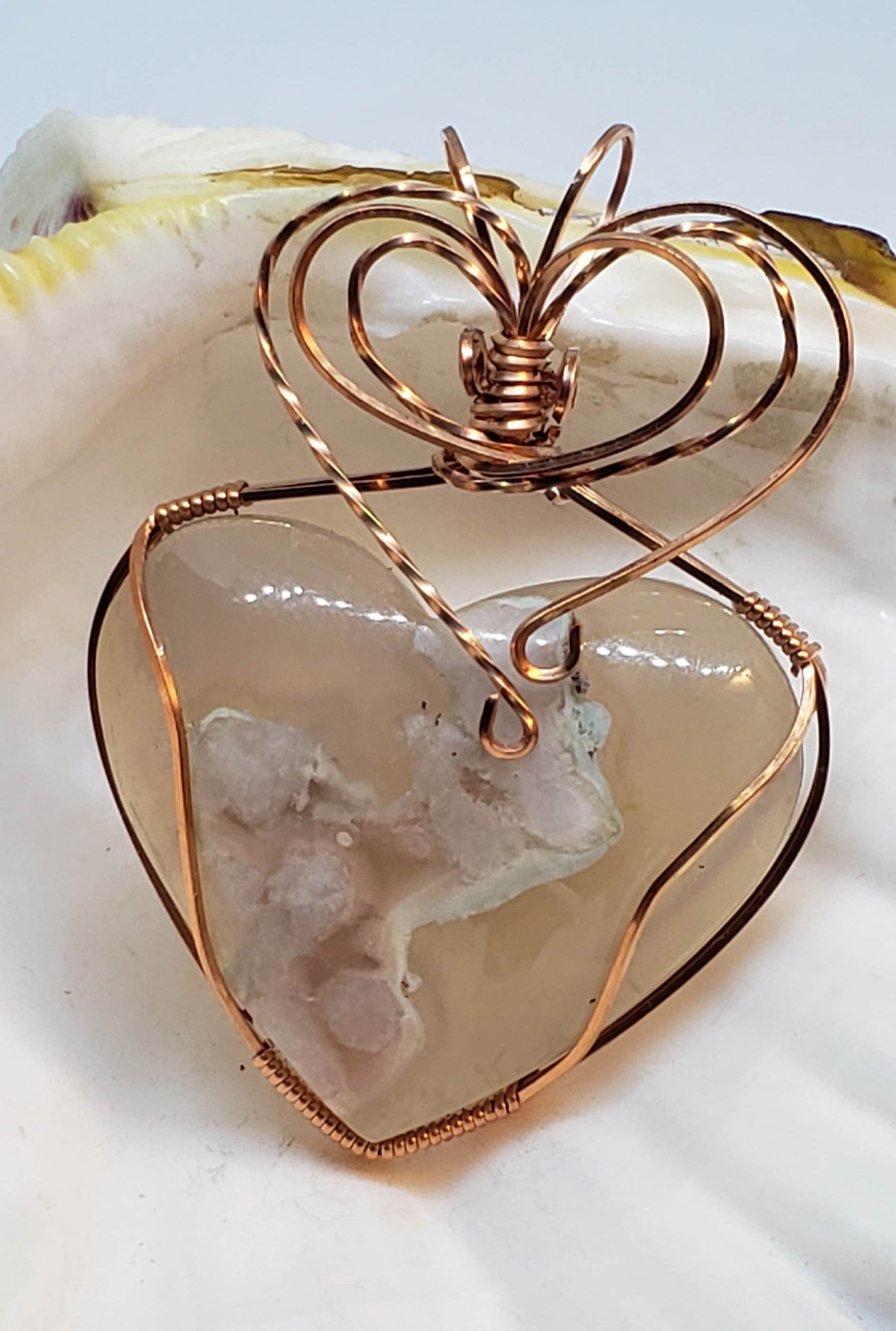 Wire Wrapped Peach Blossom Agate Heart Pendant in Copper wire