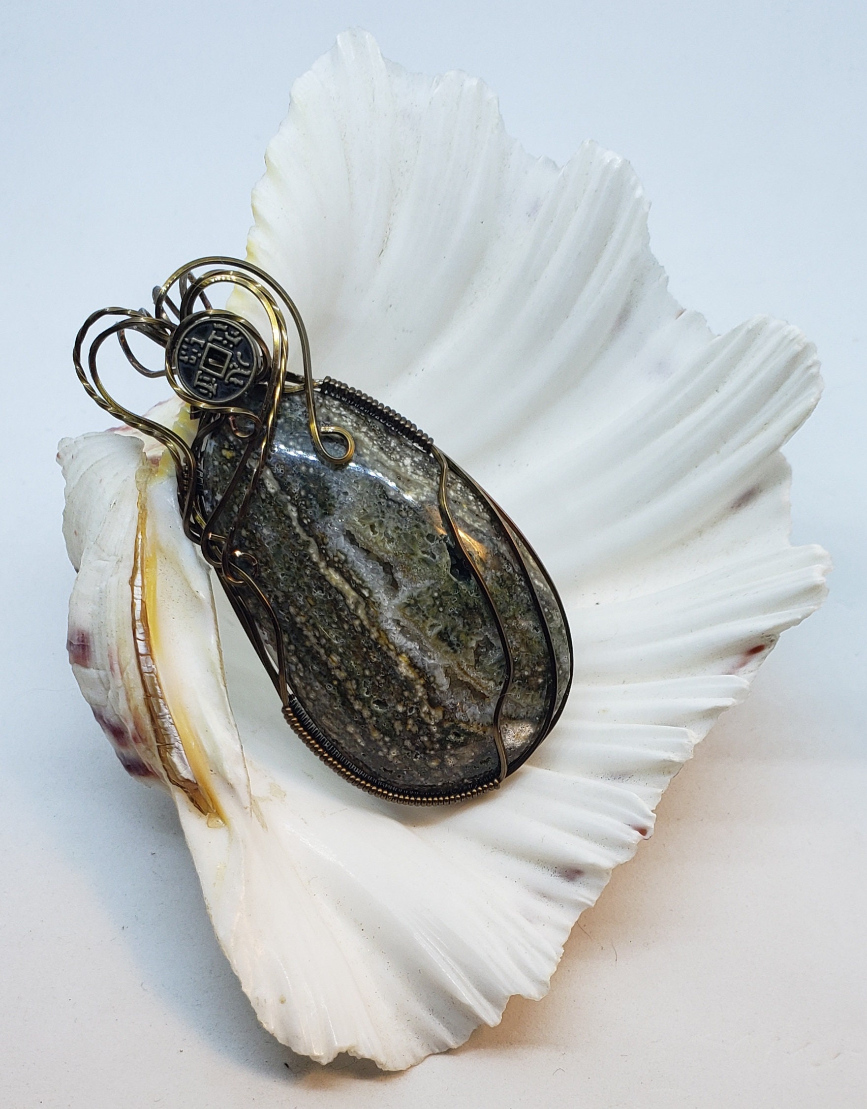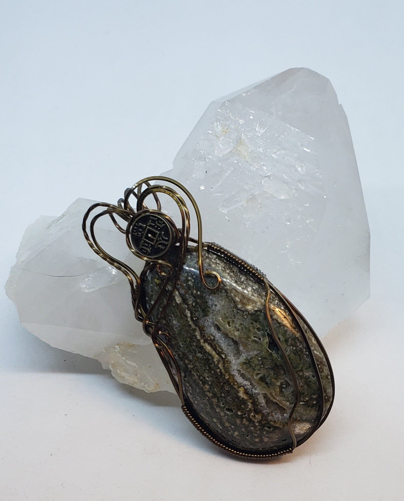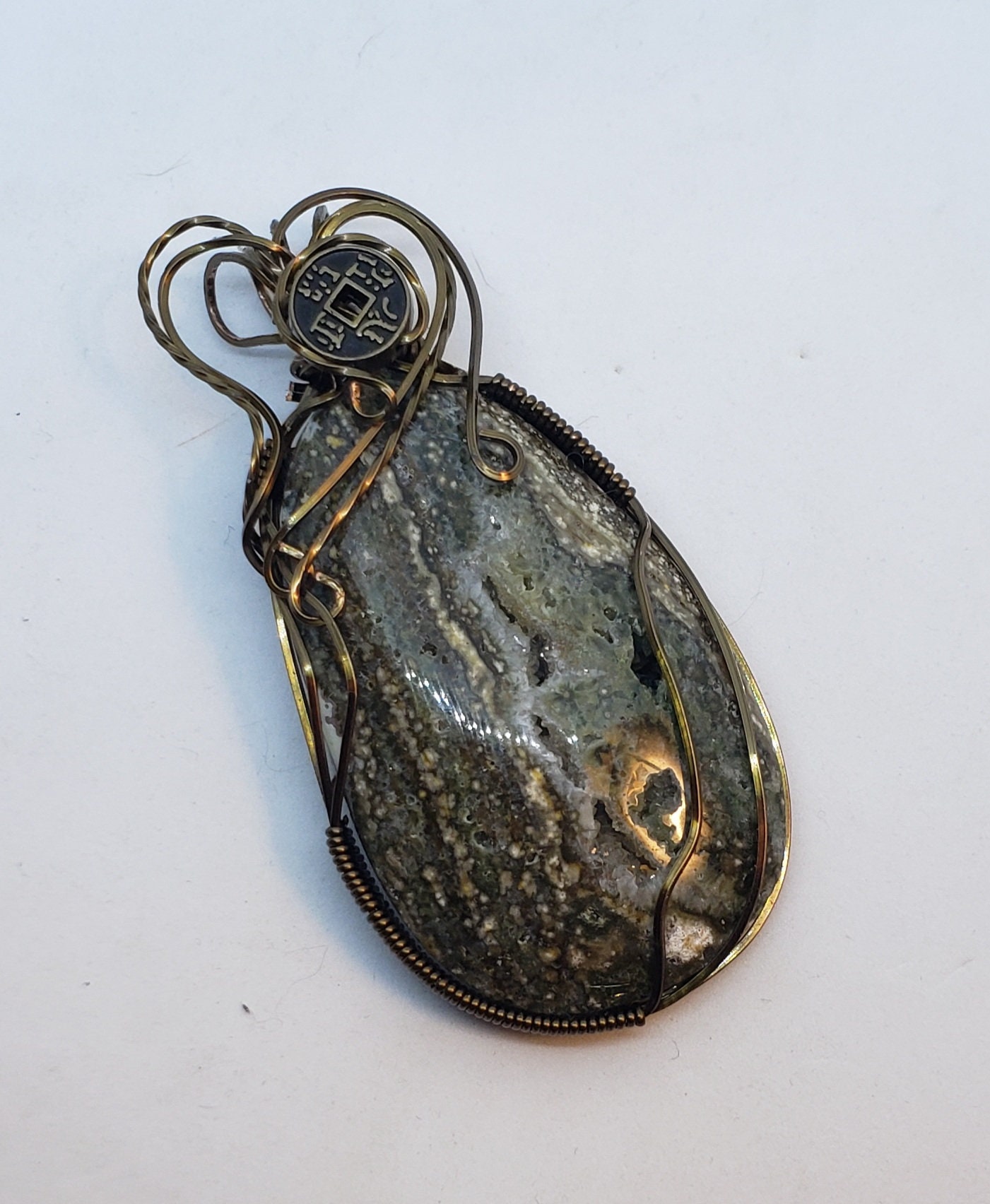 This large Ocean Jasper pendant is wrapped in antique bronze wire and is 3" long.