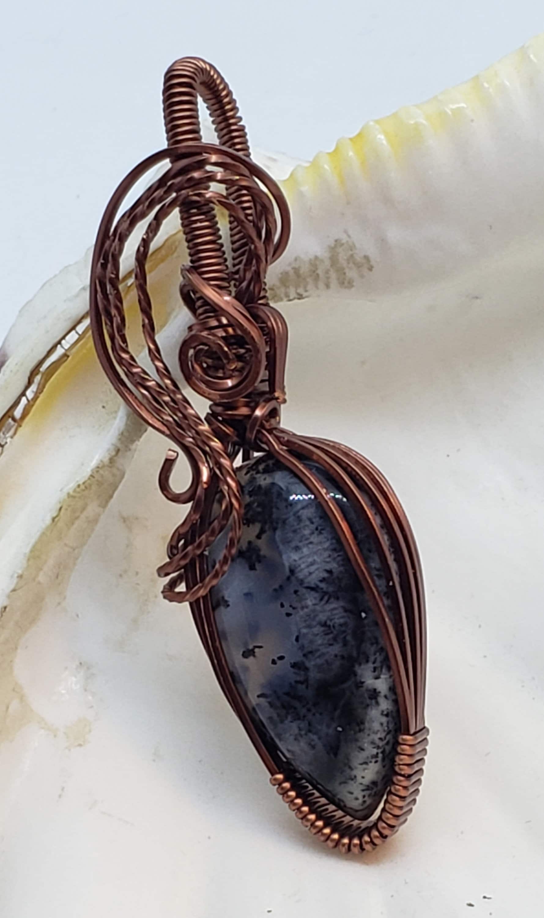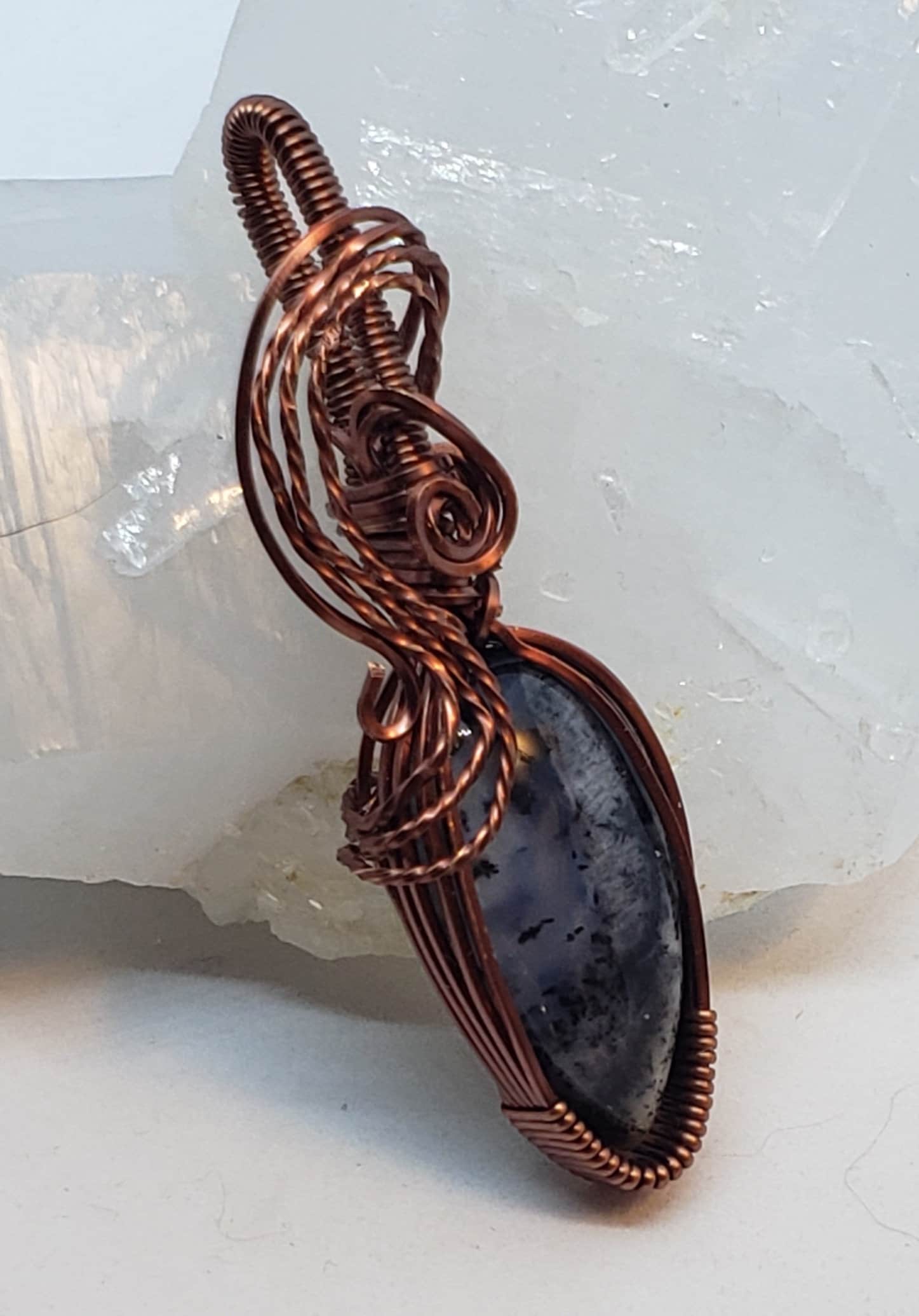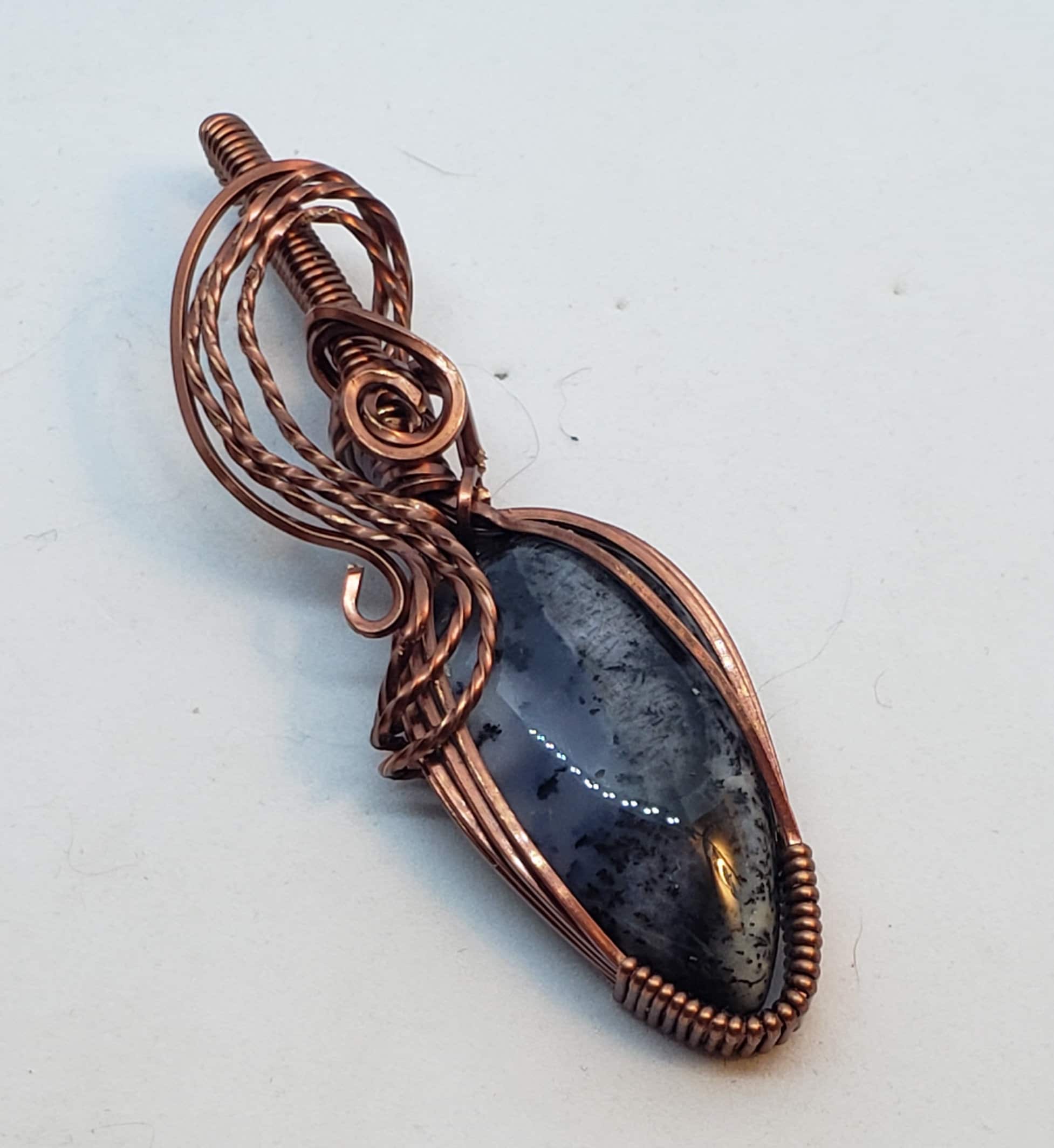 This pretty dendrite agate cabochon is wrapped in antique copper wire. It measures 2.5" long.