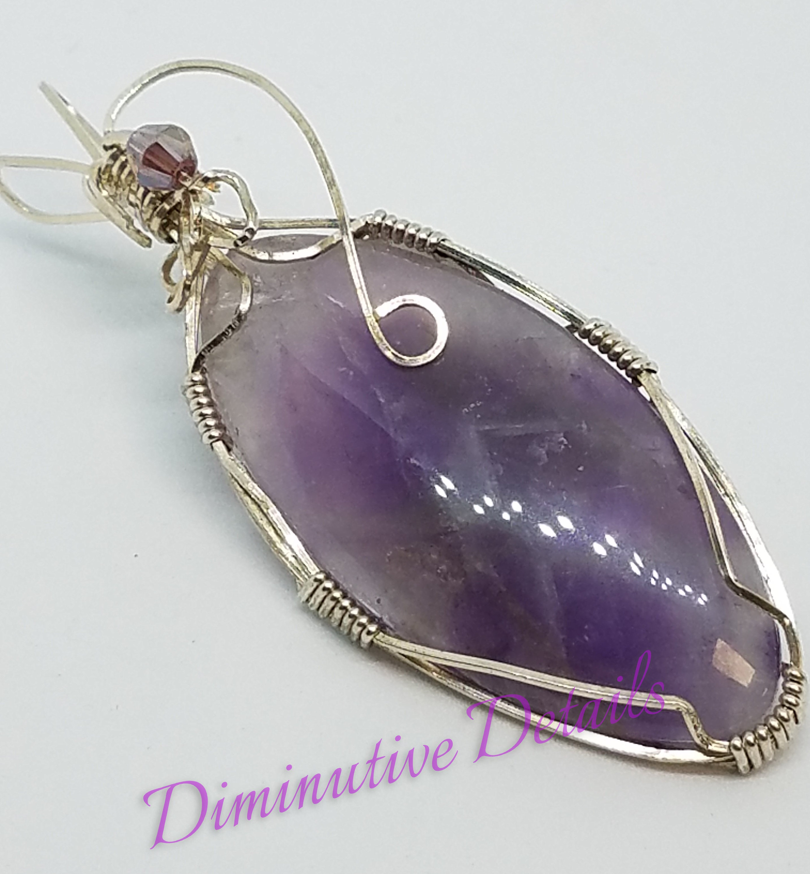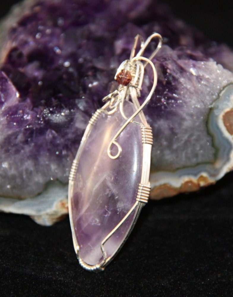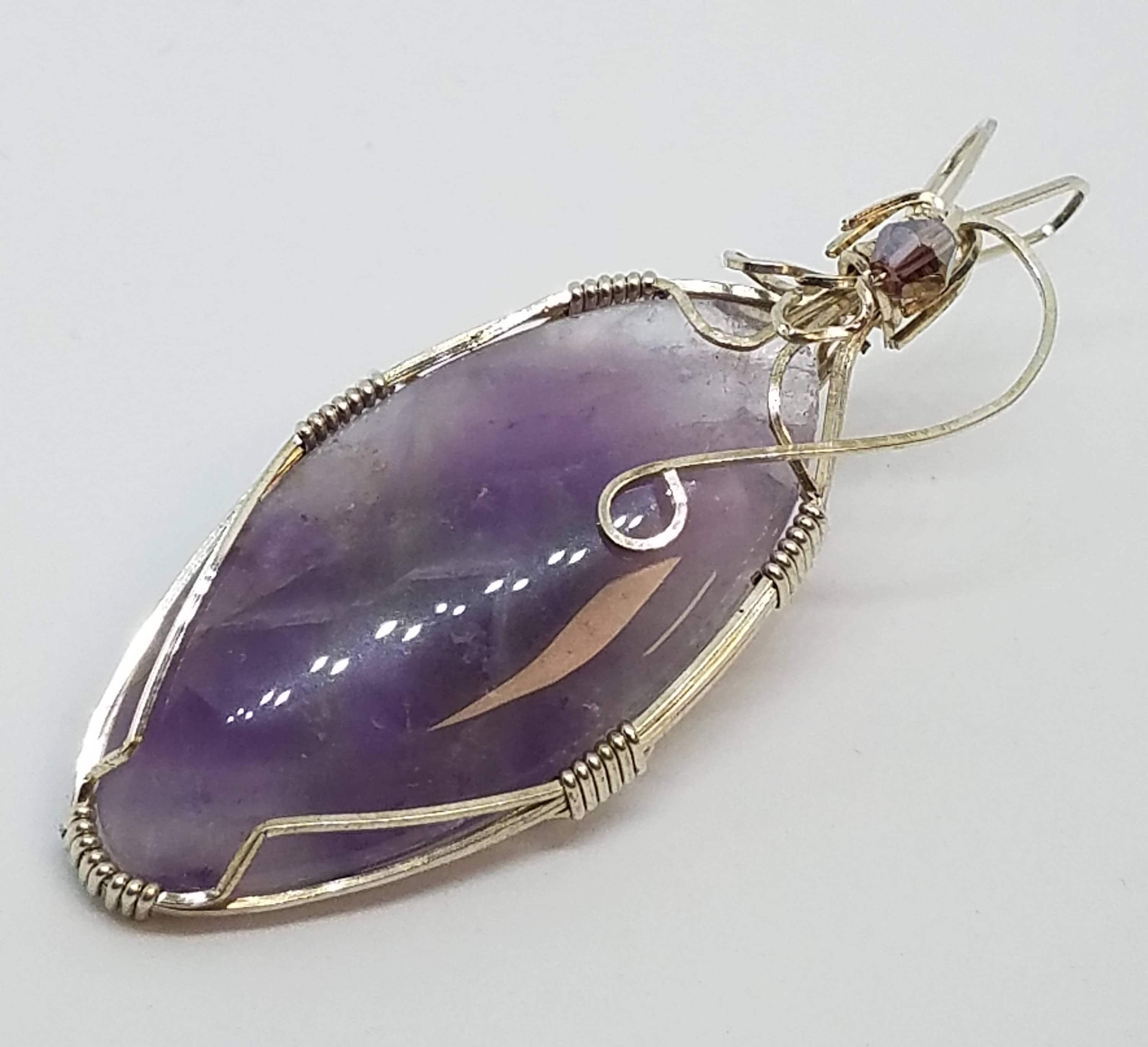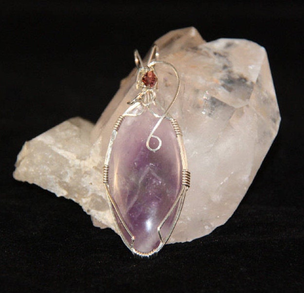 This lovely lavender Amethyst is wrapped in Argentium Silver Wire and has a lavender crystal accent. Argentium Silver is alloyed with less copper and so is purer silver than sterling. this makes it much more tarnish resistant as it is the copper in sterling that causes it to oxidize.