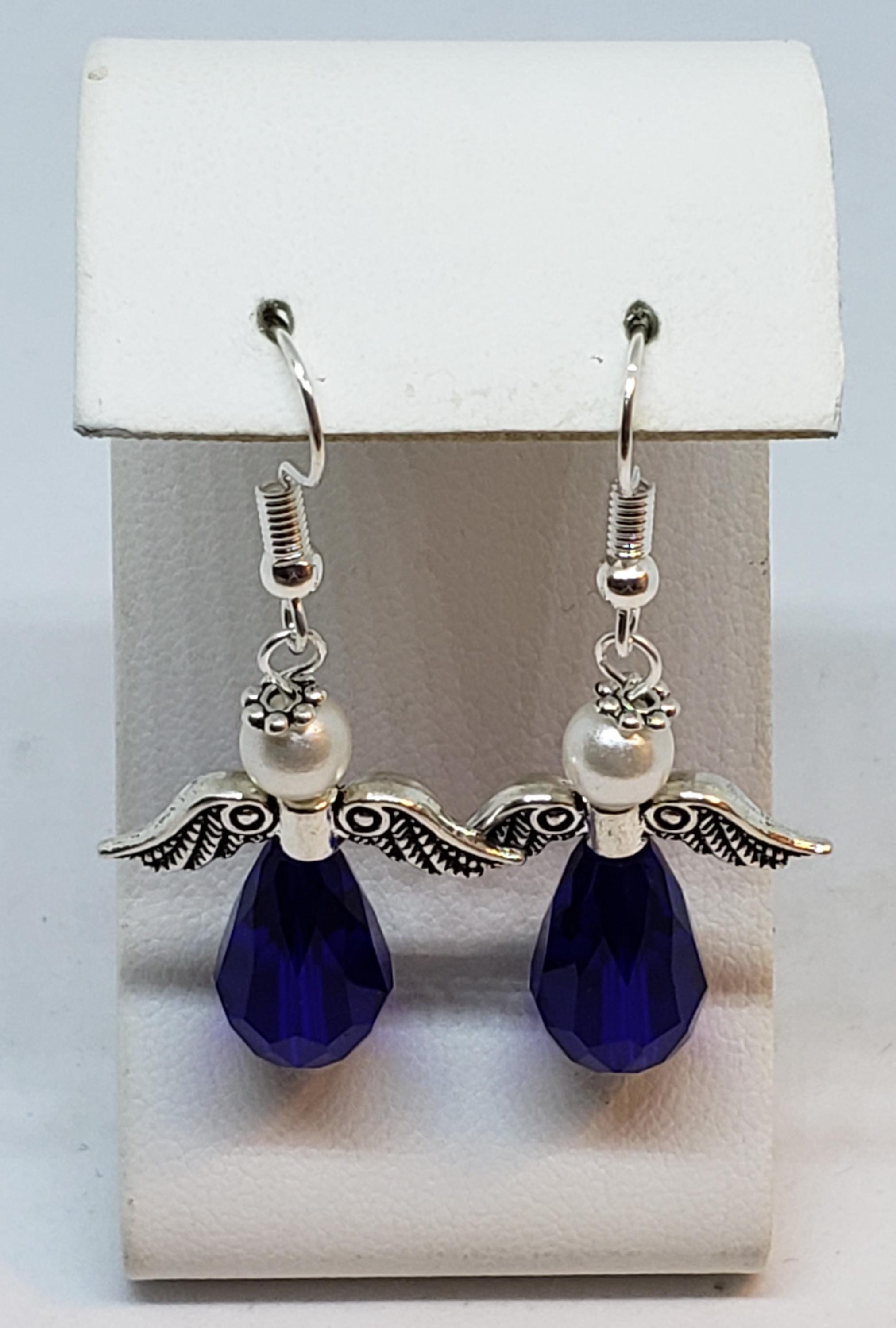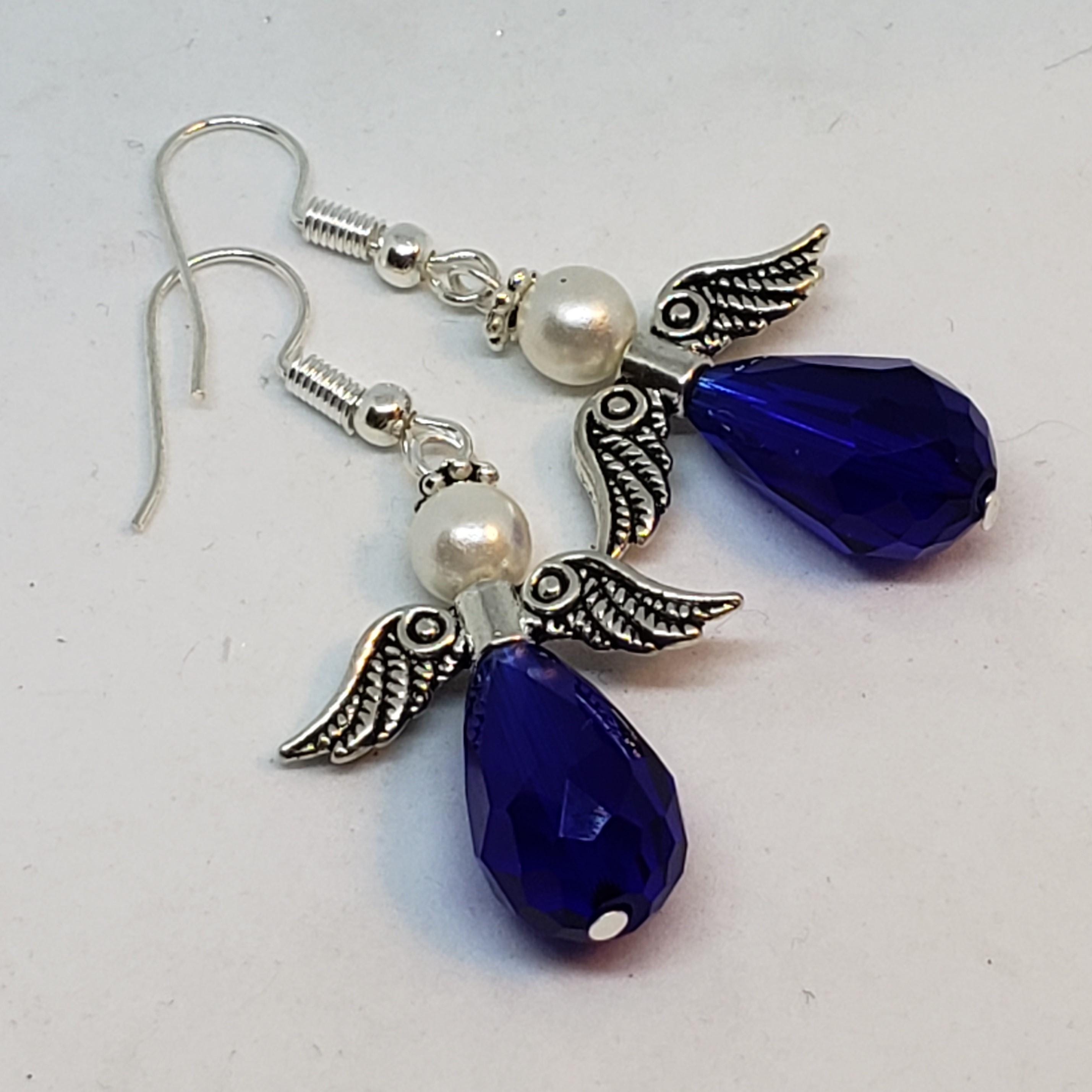 Crystal angels with silver tone wings and halo with faux pearl head-on silver-plated fishhook ear wires. Cobalt Blue