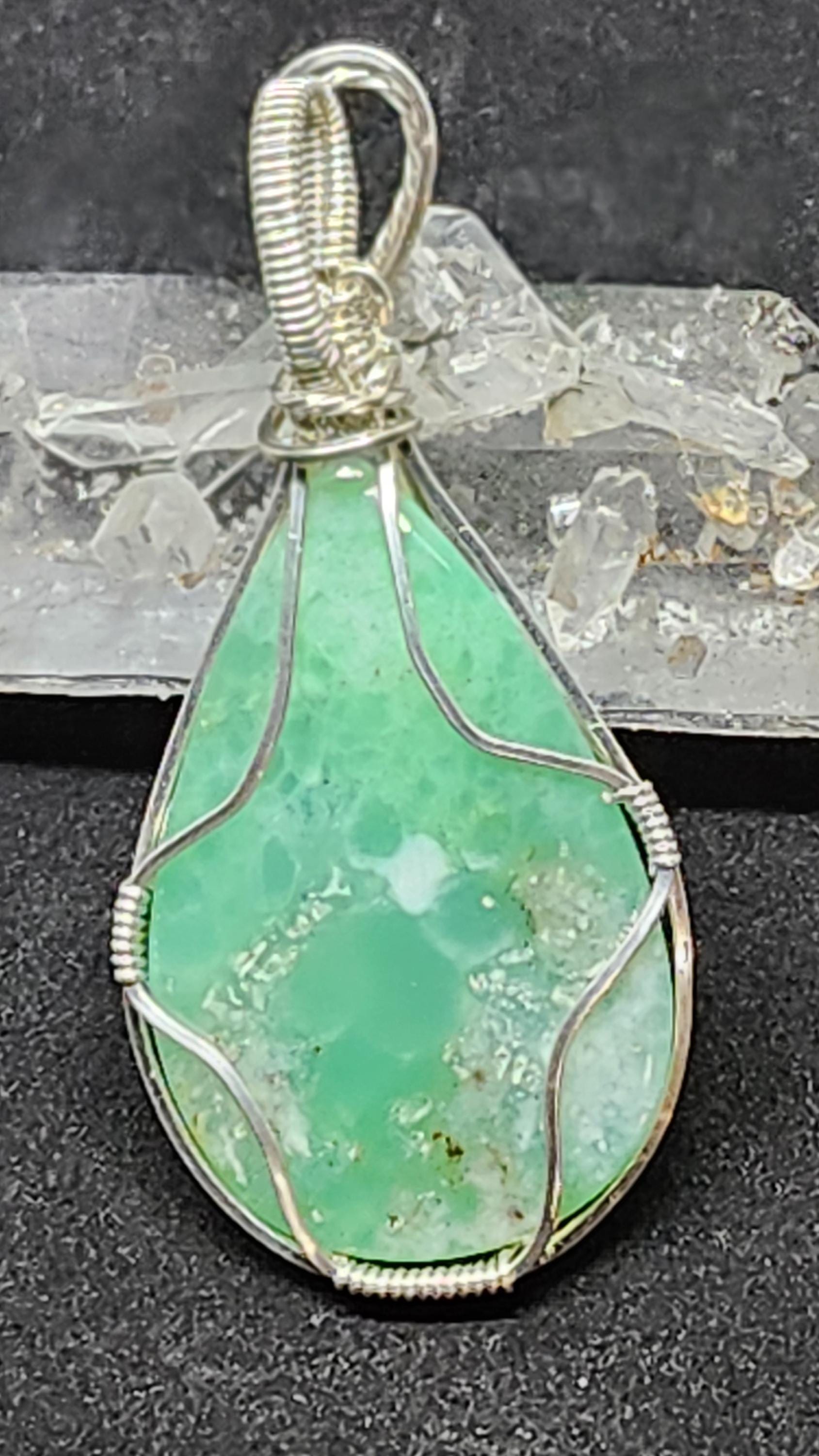 This beautiful green chrysoprase cabochon is wrapped in sterling silver filled wire.