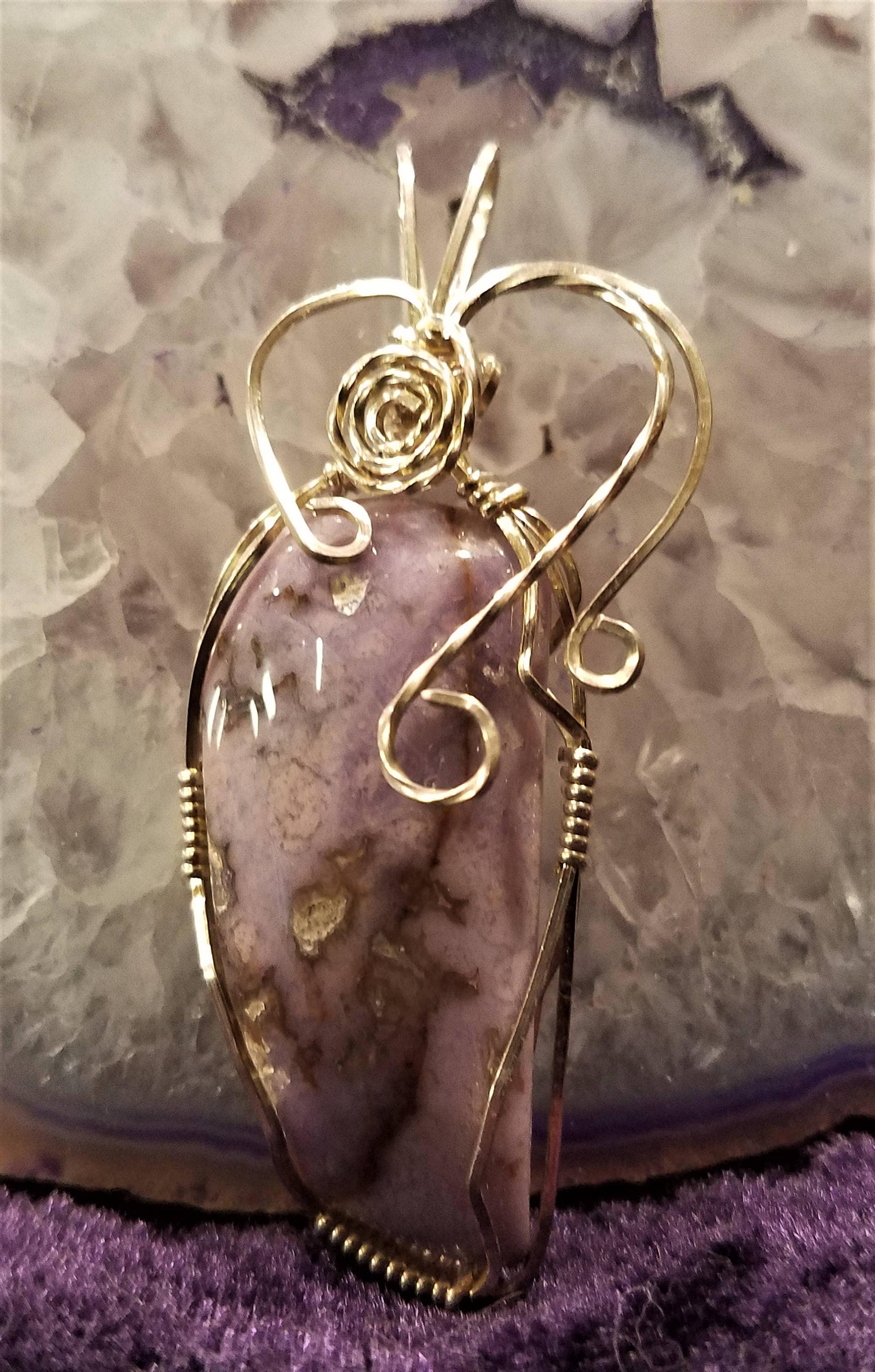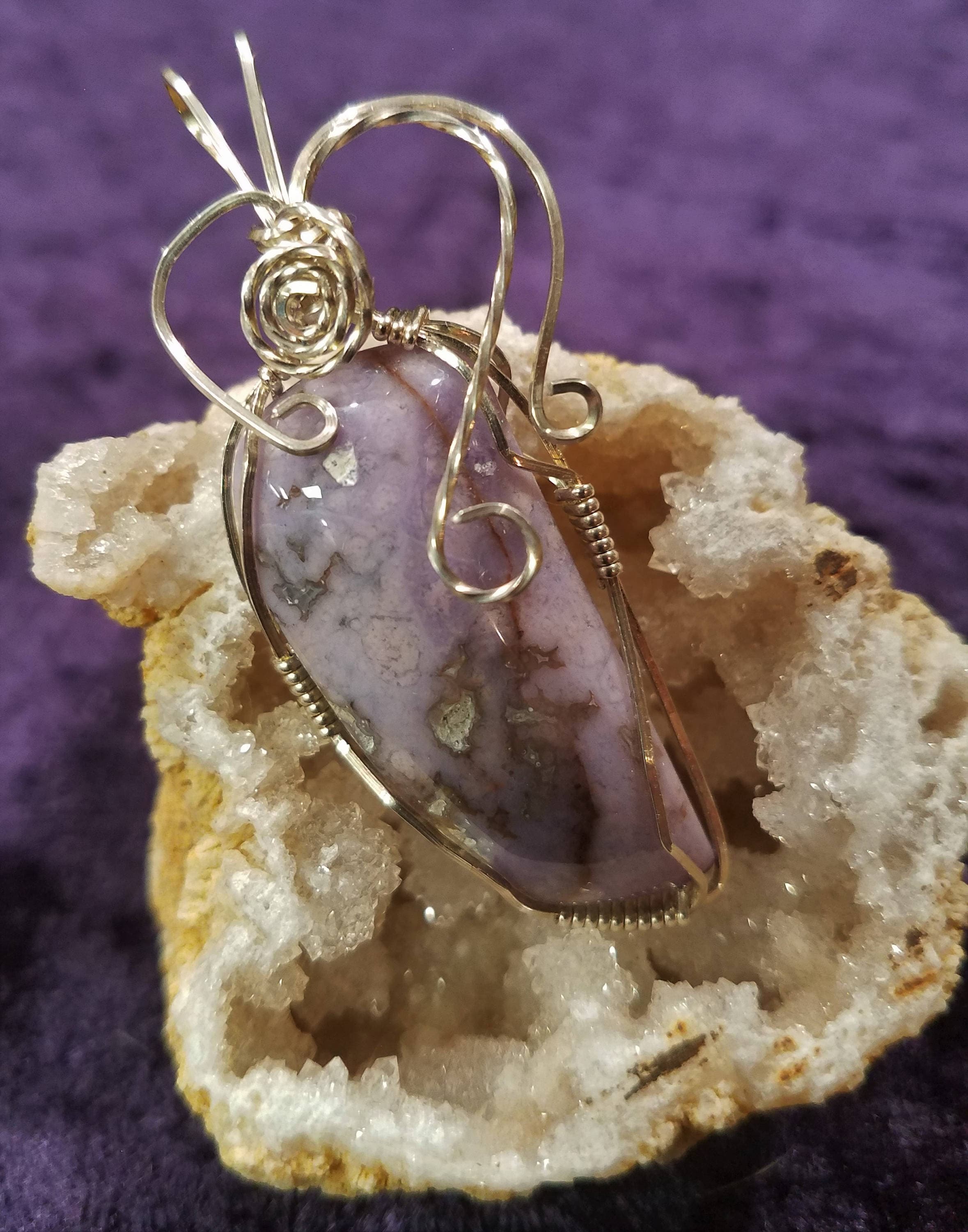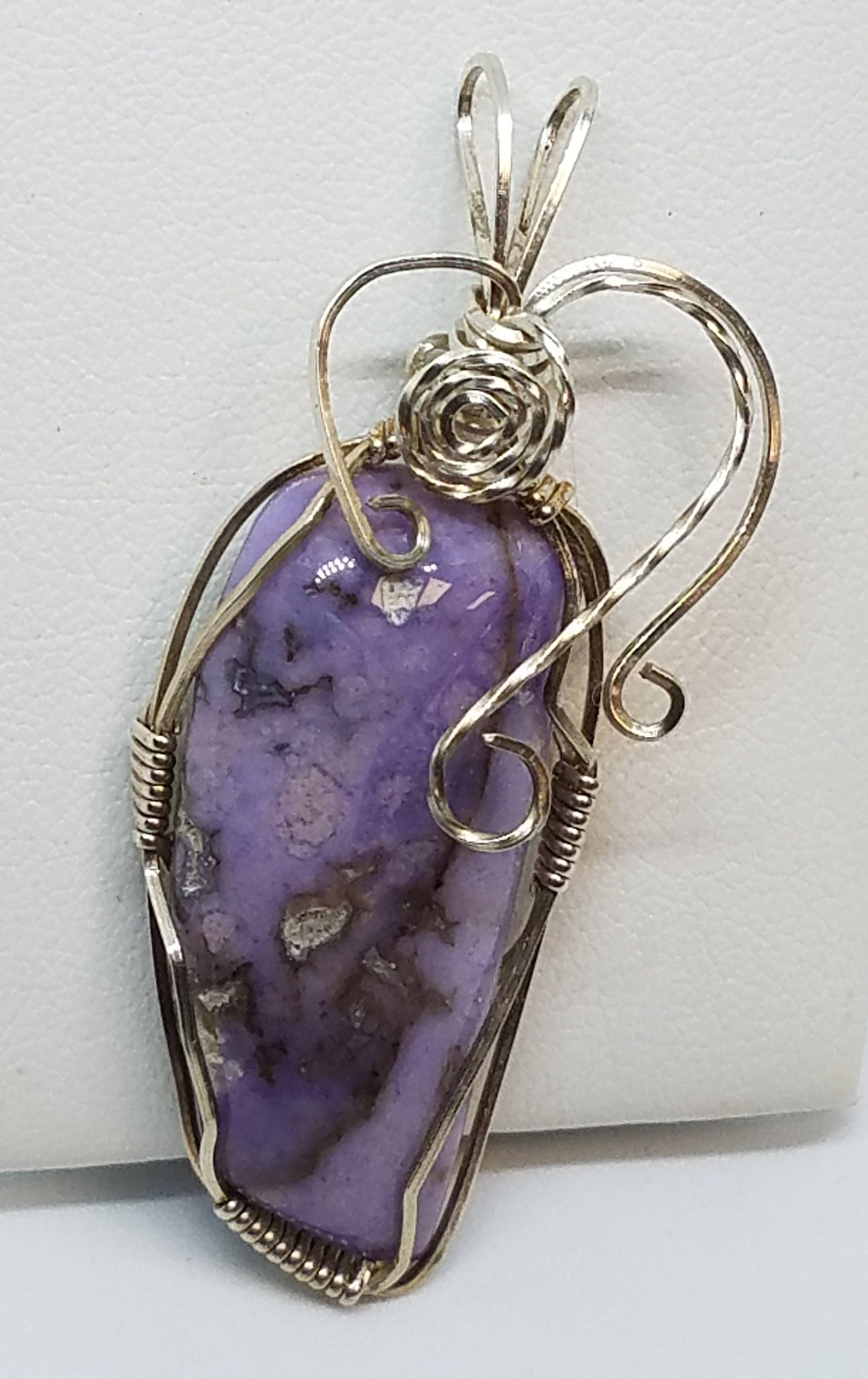 This lovely lavender freeform Burrow Creek Jasper is wrapped in Sterling Silver Wire. The pendant is over 2" long and has a rabbit ear bail large enough form an omega chain.