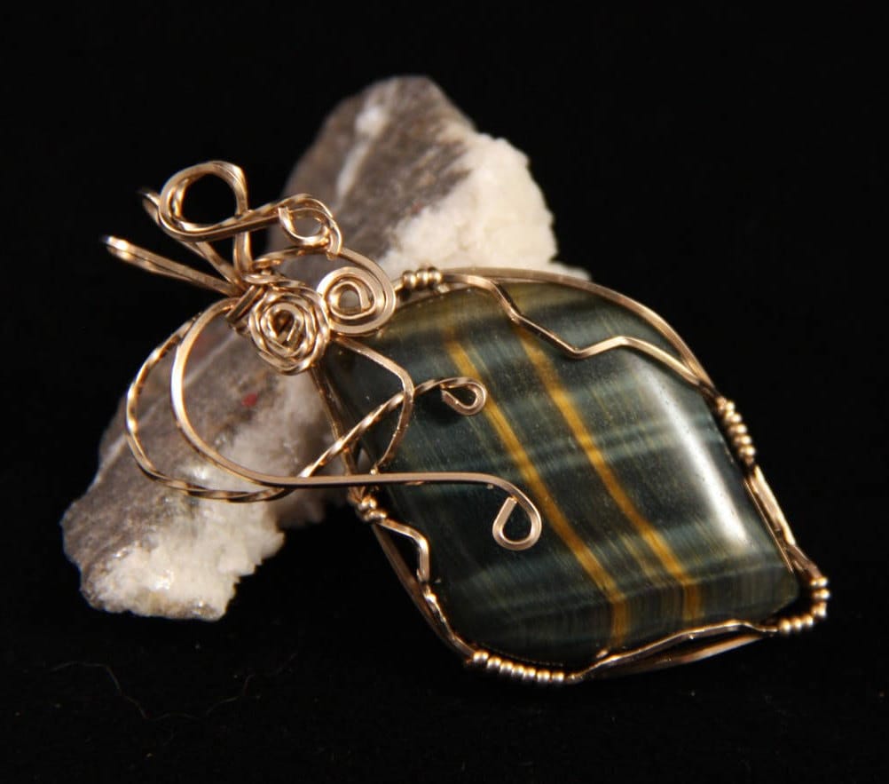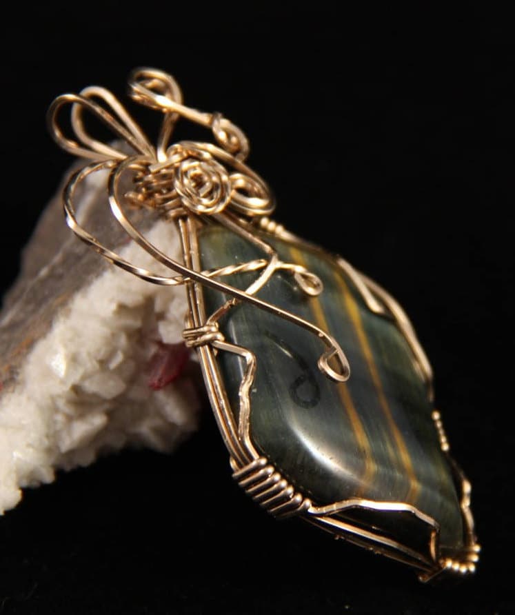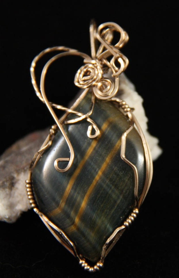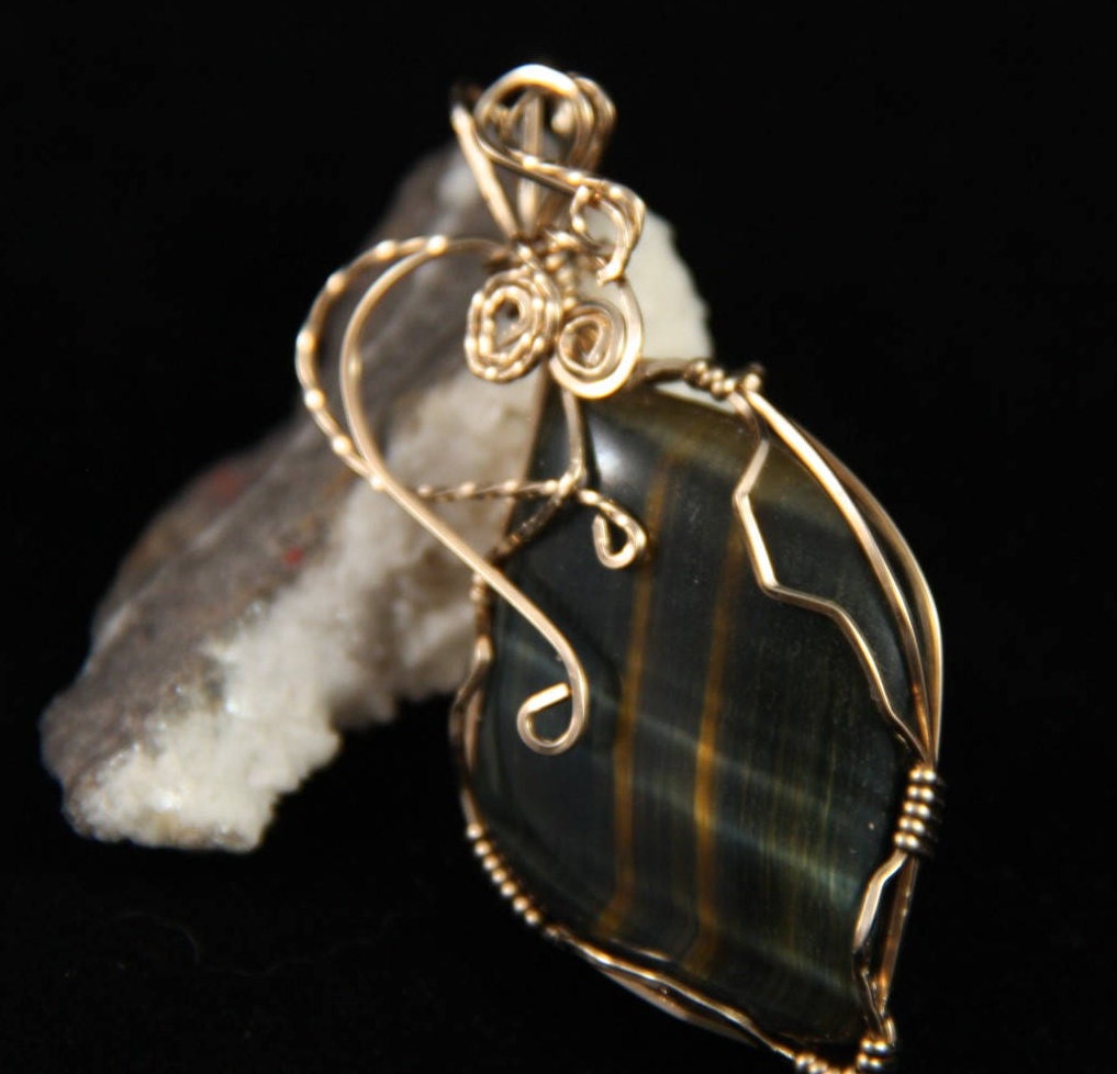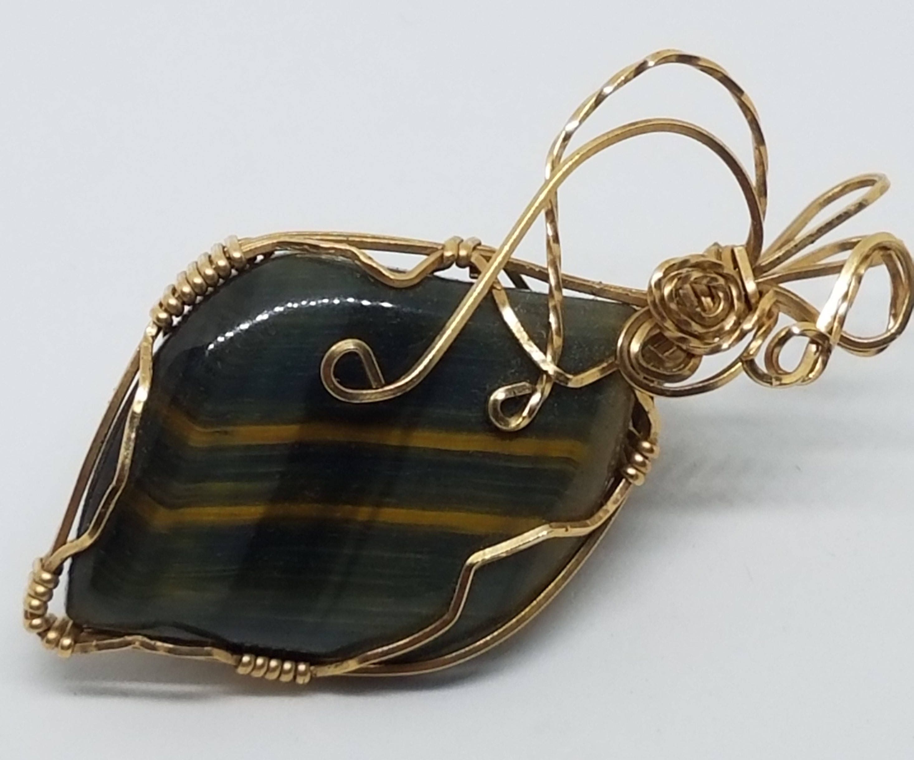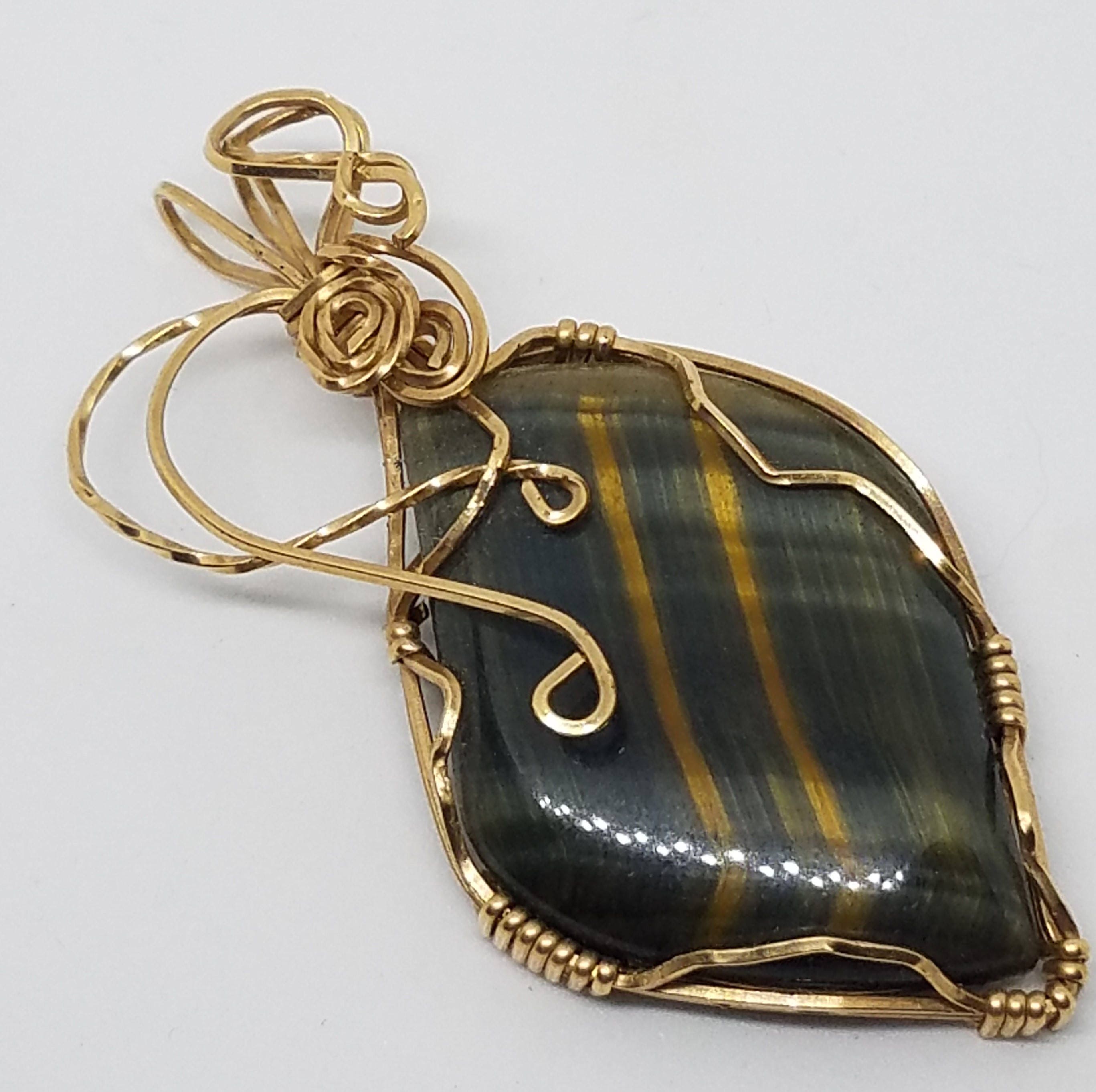 Gold Filled Wire Wrapped Blue Tiger Eye Pendant. Approx 2.3" long.