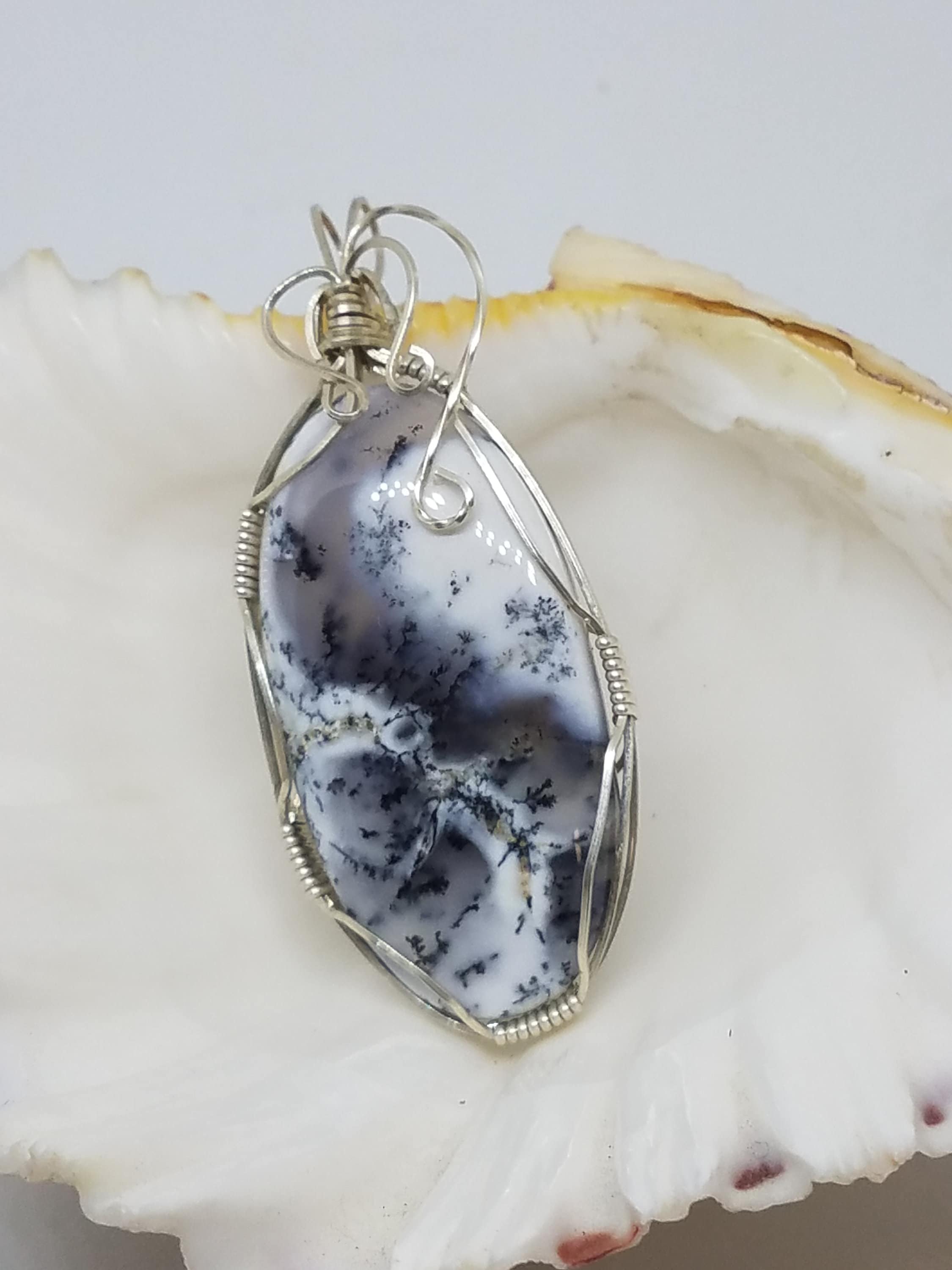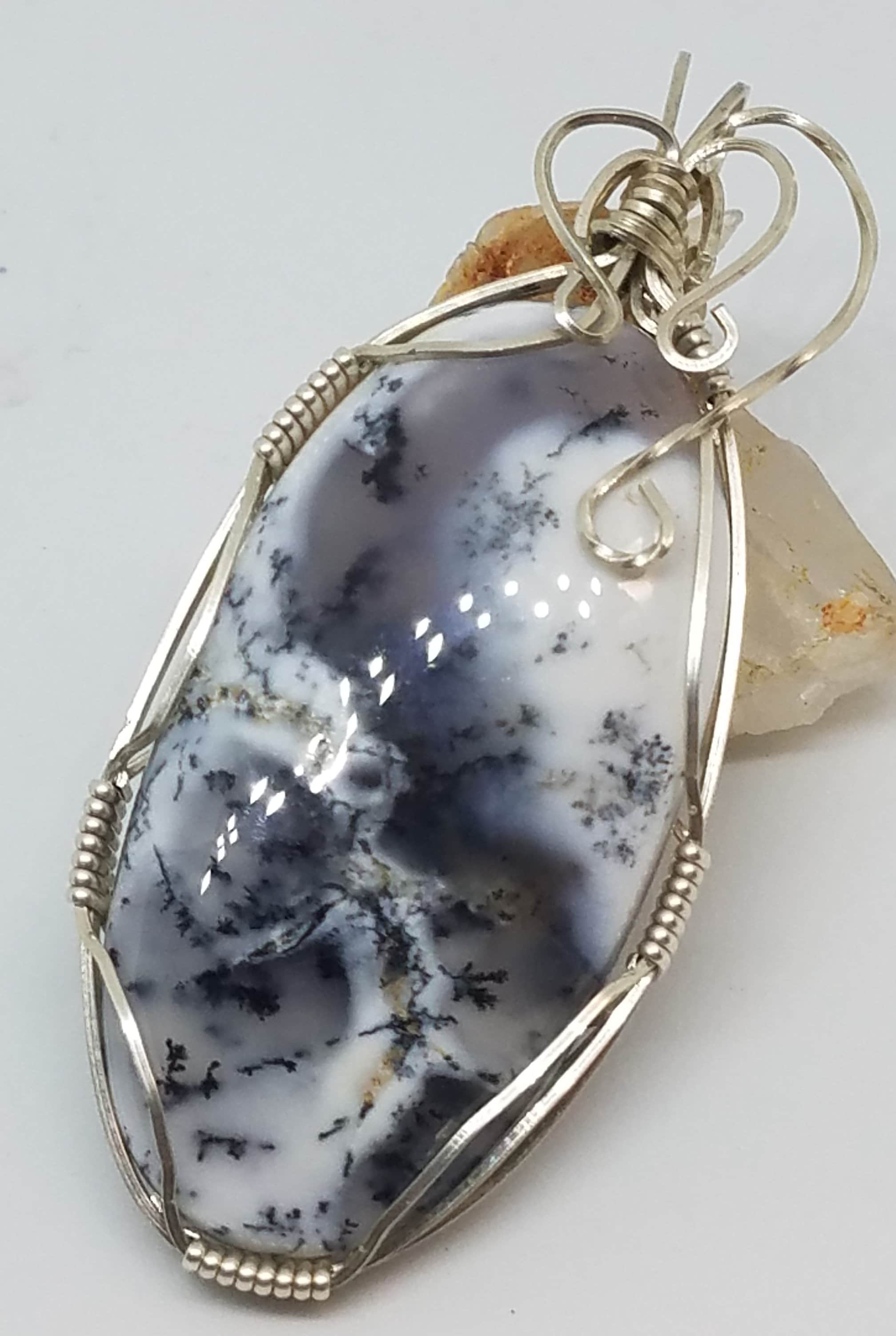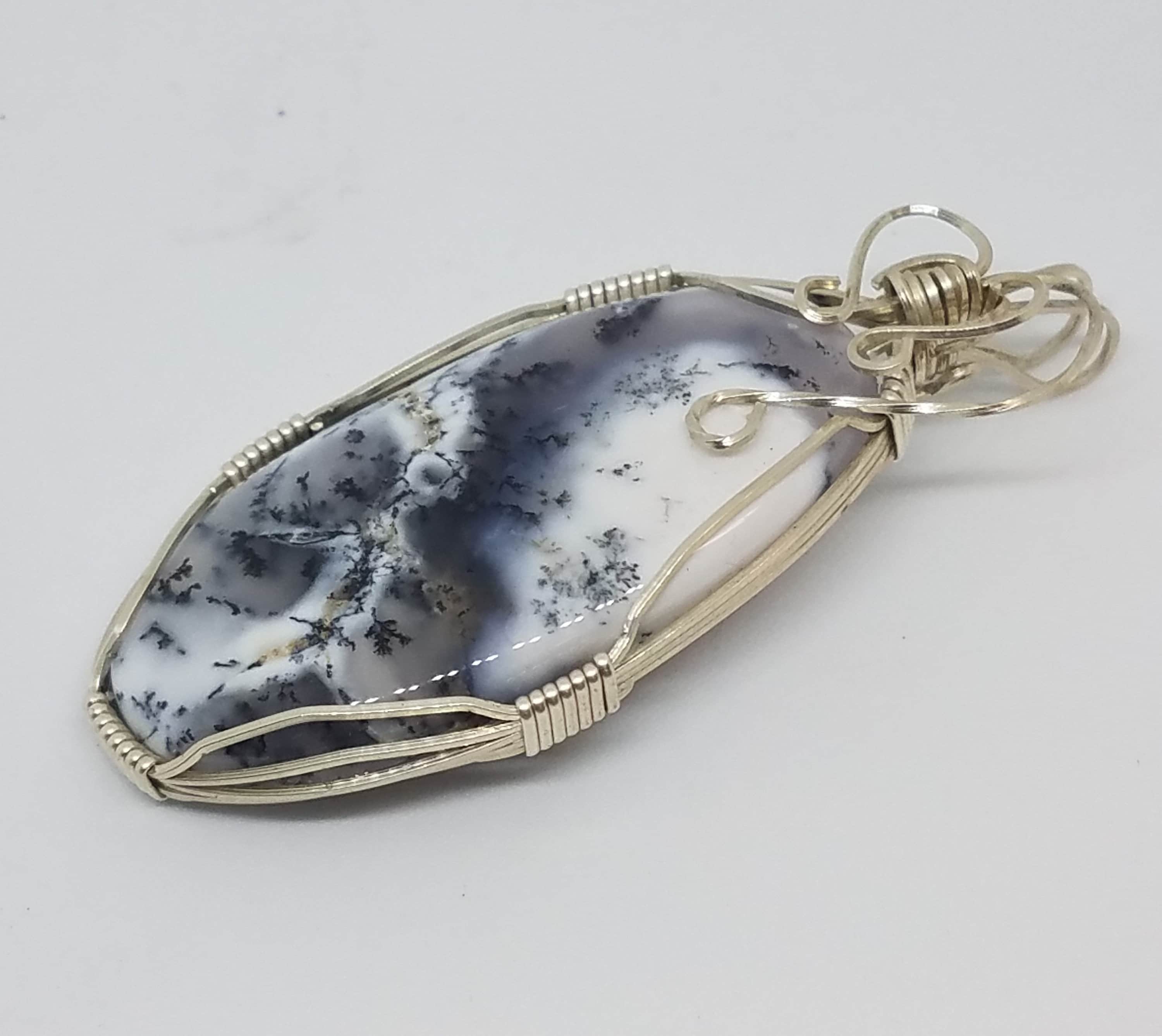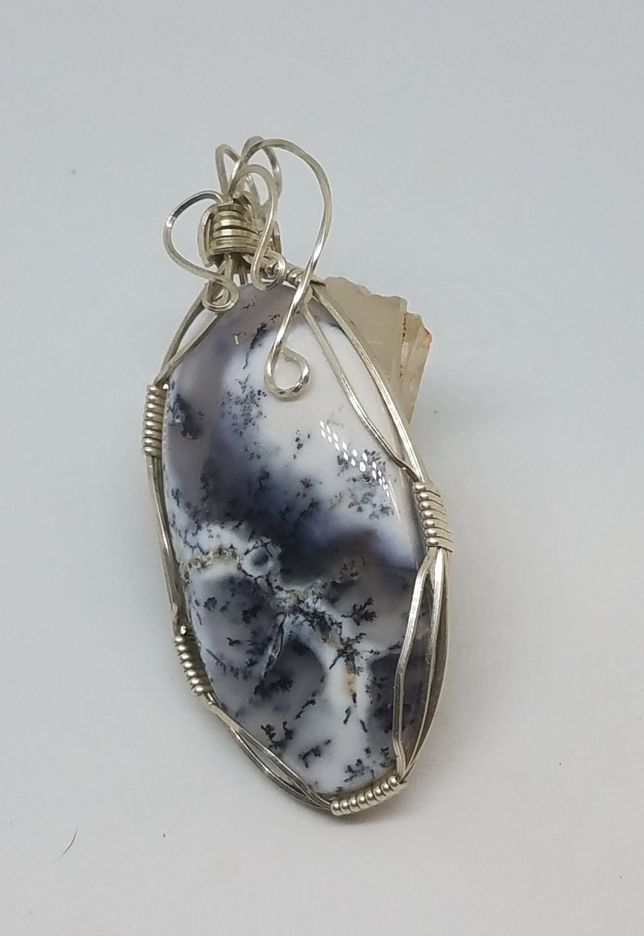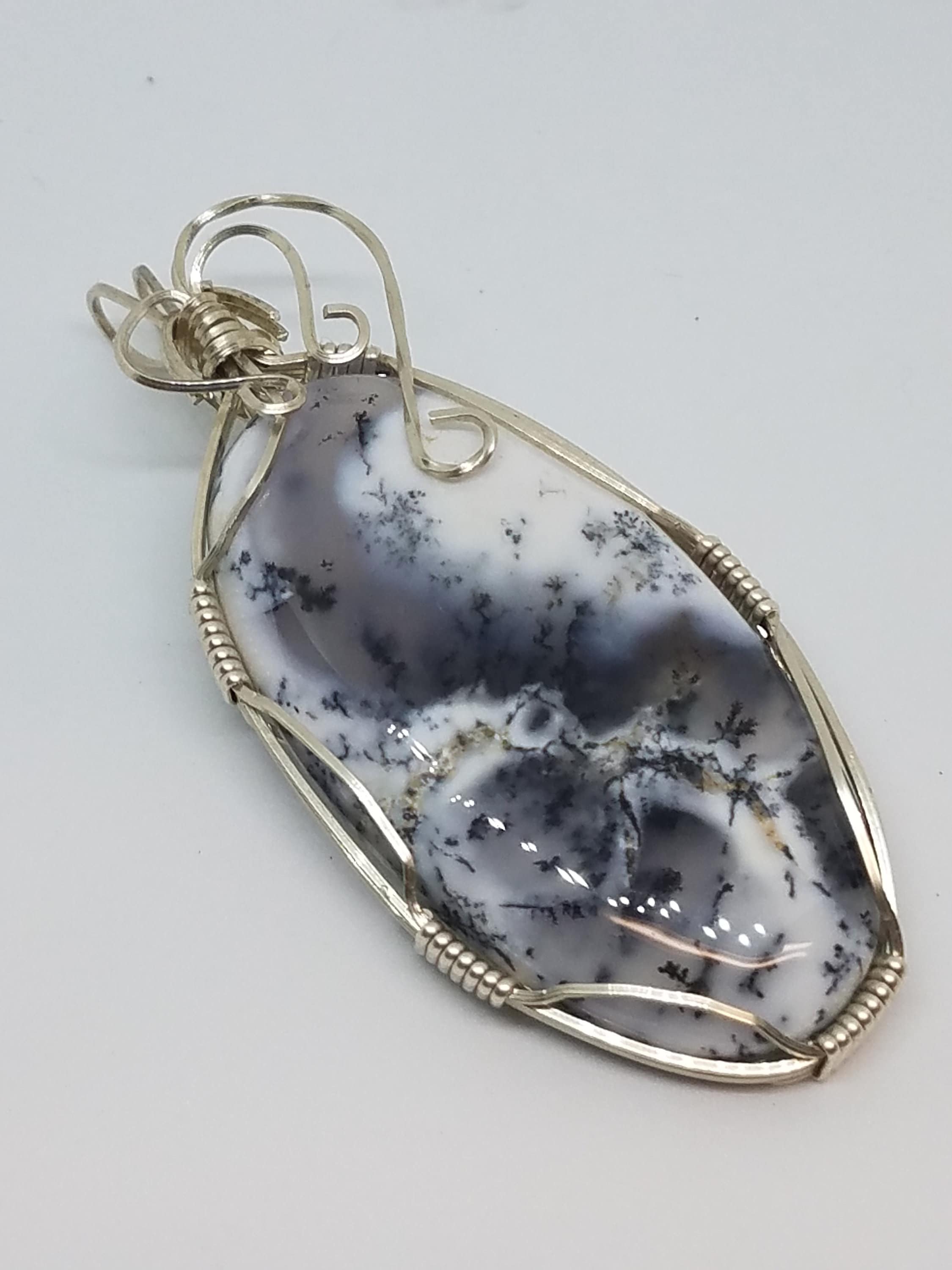 This beautiful dendrite agate is wrapped in sterling silver wire. It is a large piece measuring over 2" long and has a very interesting pattern.