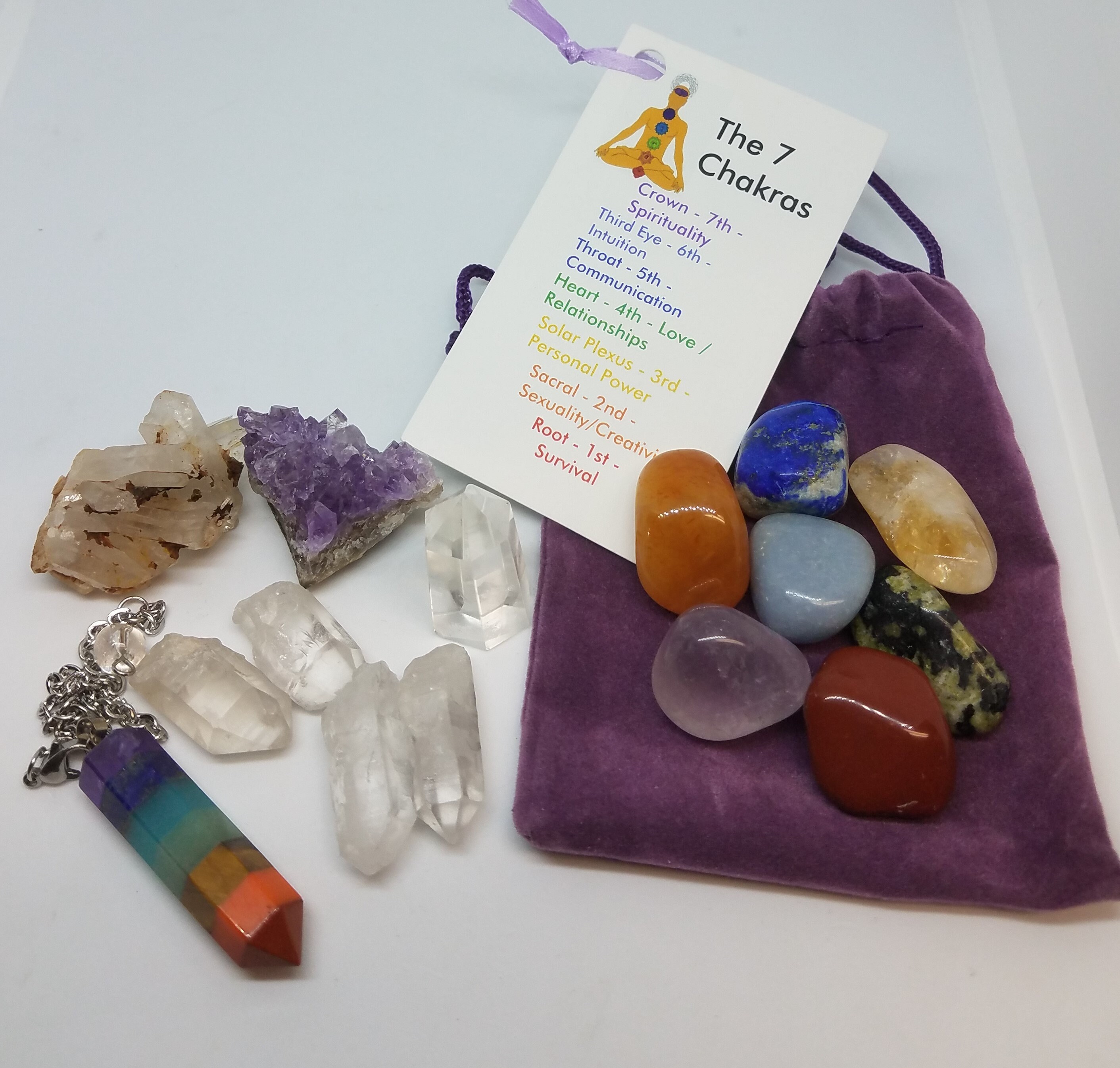 This Chakra Crystal grid kit consists of a 7.25" Seed of Life laser engraved wood grid, Stones to repesent the seven main chakras, a small quartz generator, 4 quartz points, a small Amethyst cluster a small Arizona quartz cluster and a chakra pendulum.
