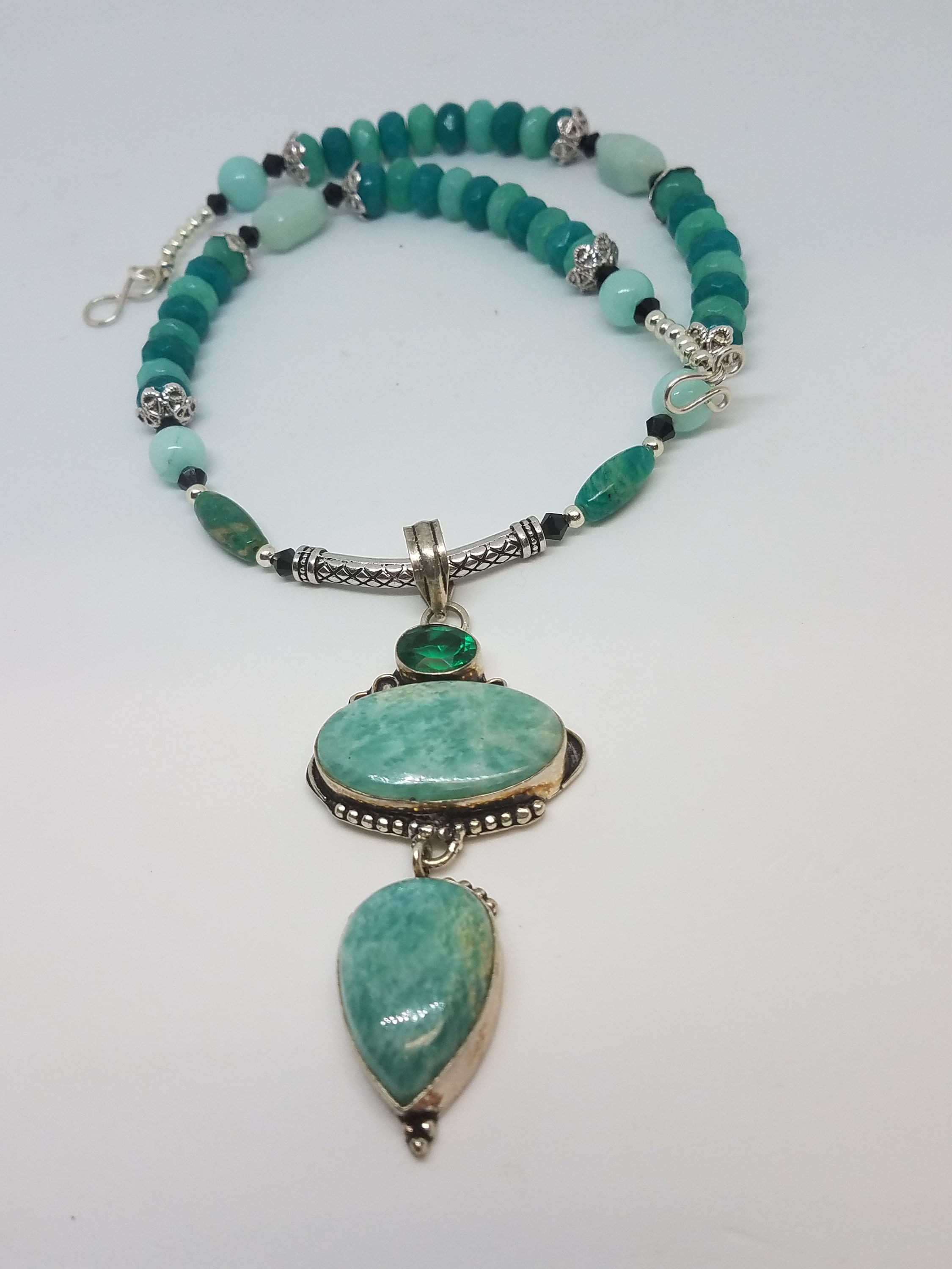 This beautiful Amazonite necklace in varying shades of aqua blue is 17 inches long with a 3 inch focal pendant that brings the total length to 20 inches. It has pewter and silver plated accents beads as well as black bicone crystals and is finished with a hand made hook and figure eight clasp. This would make a lovely gift.