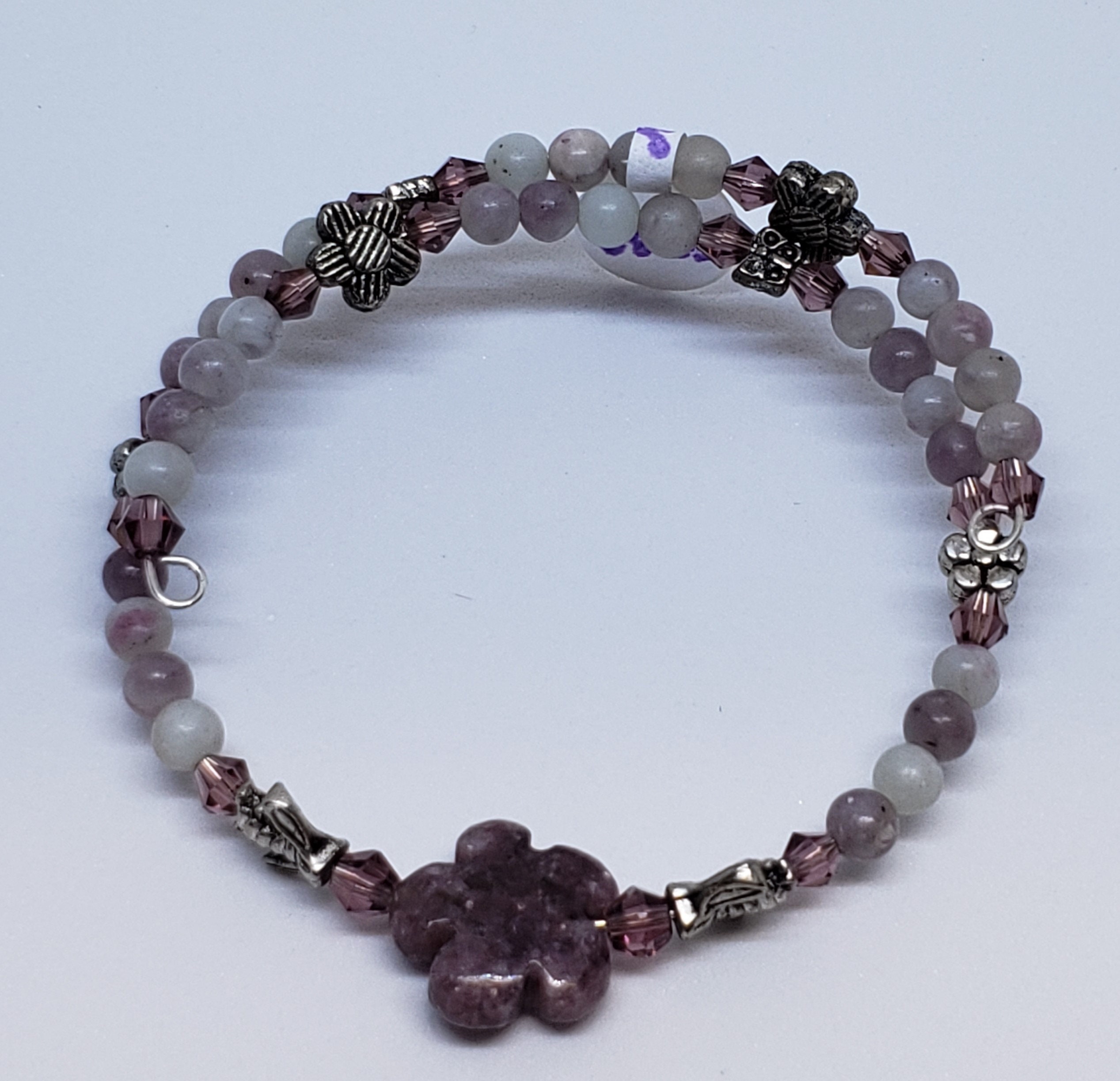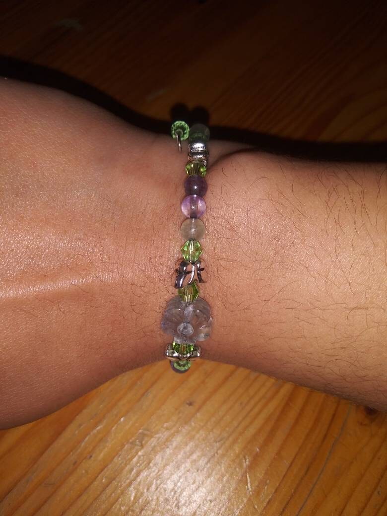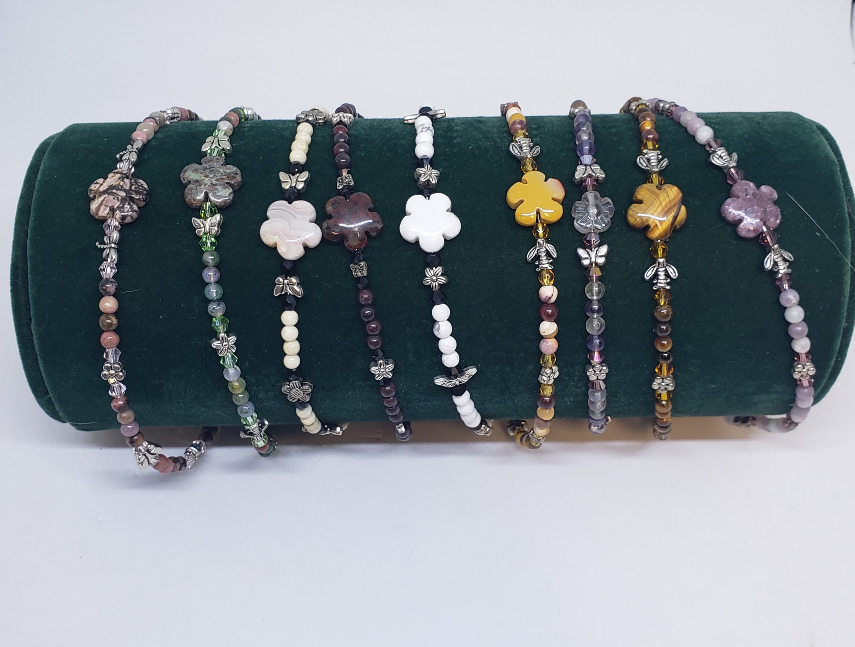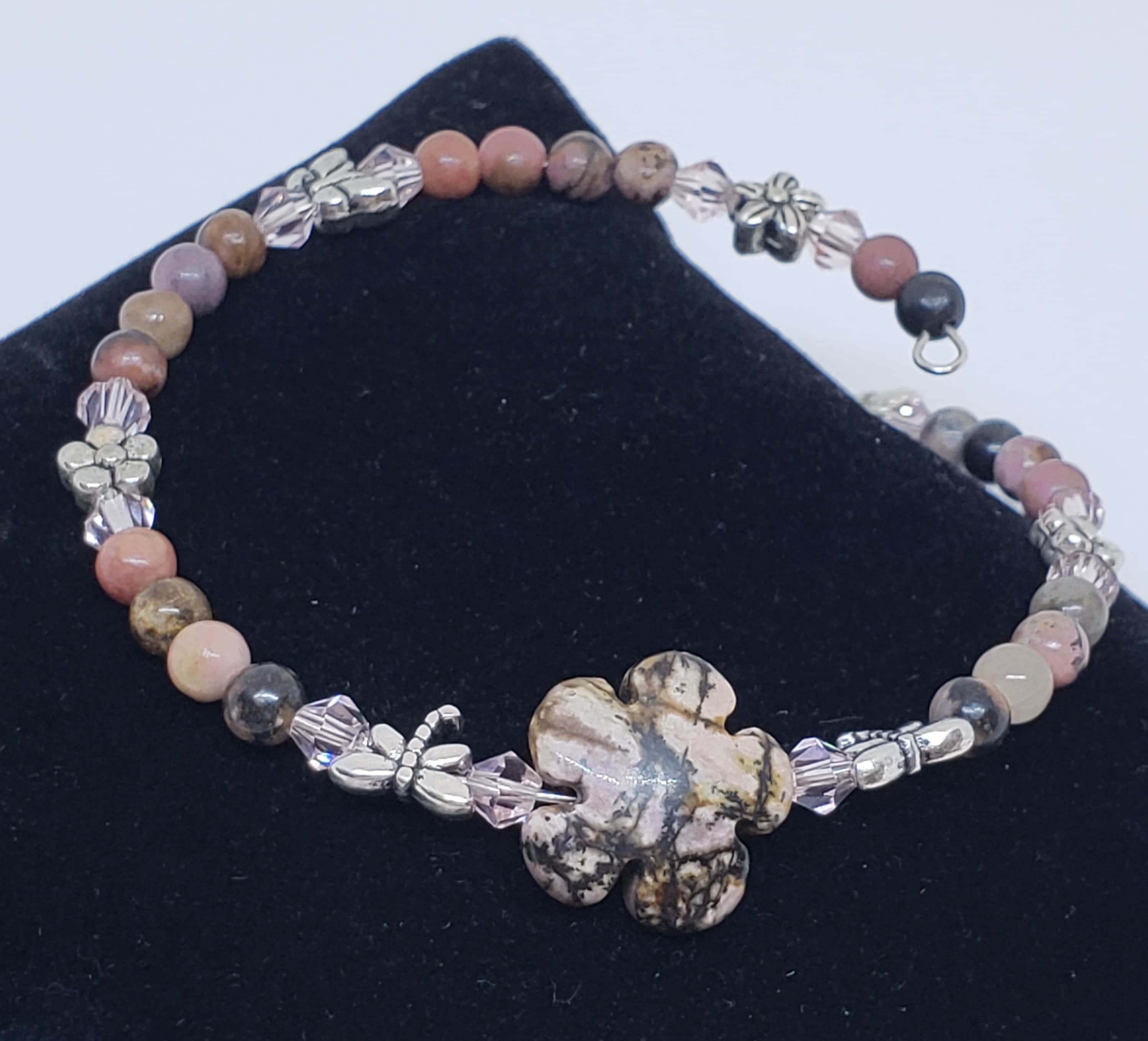 Stones include, rose quartz, red jasper, tiger eye, sodalite, green aventurine, mookite, and amethyst / lepidolite. Please specify stone choice.