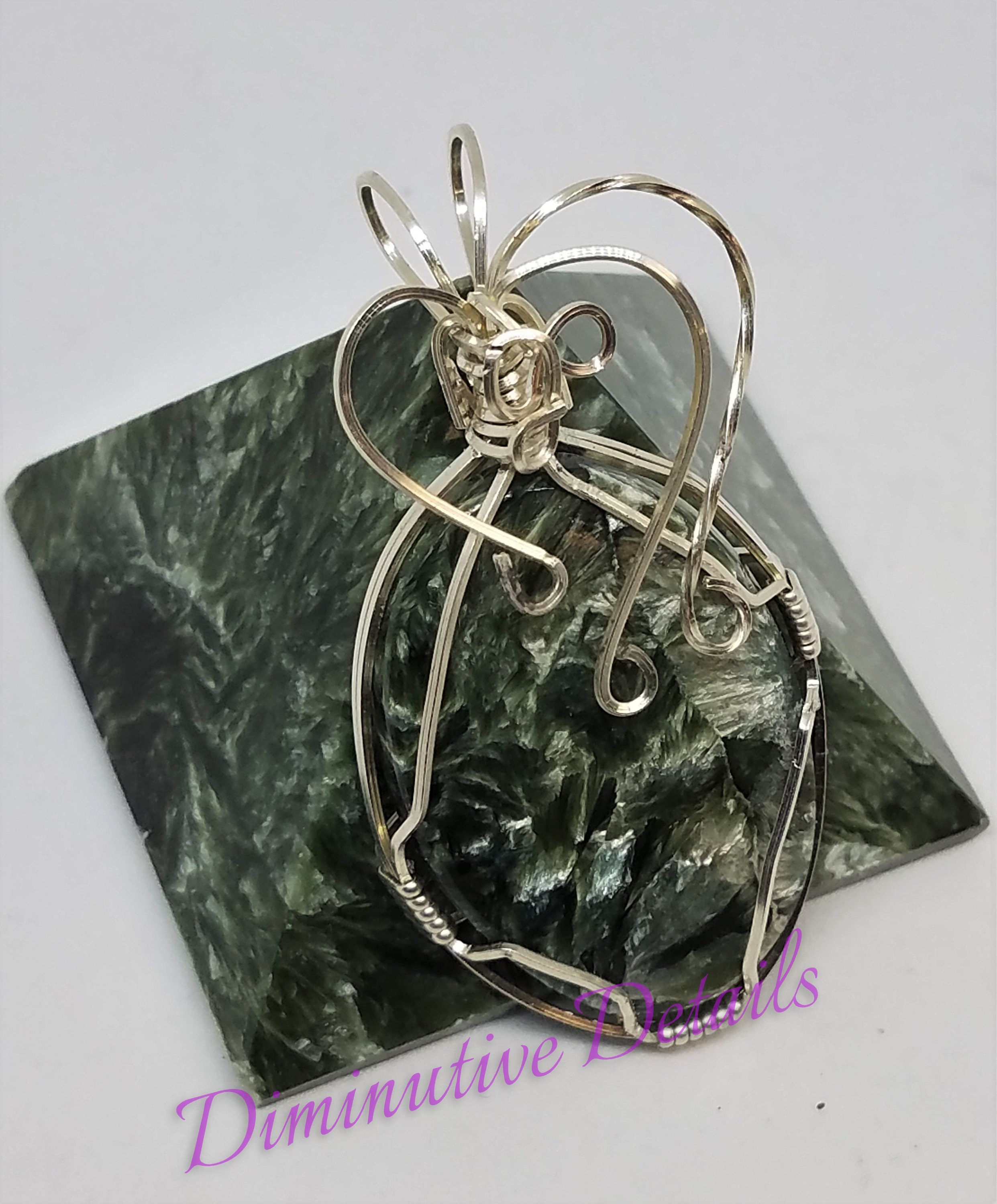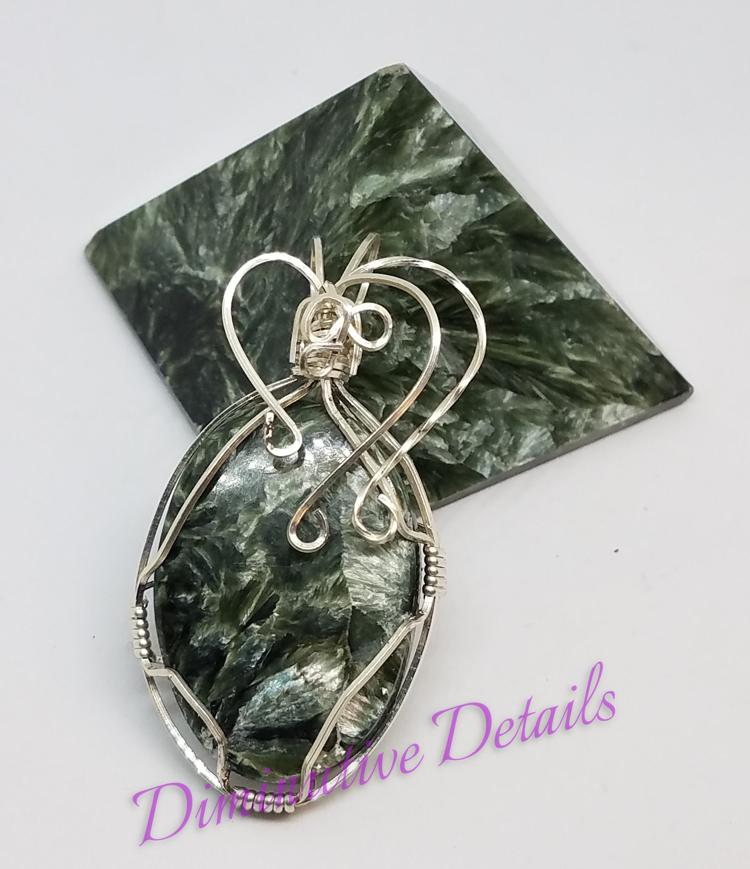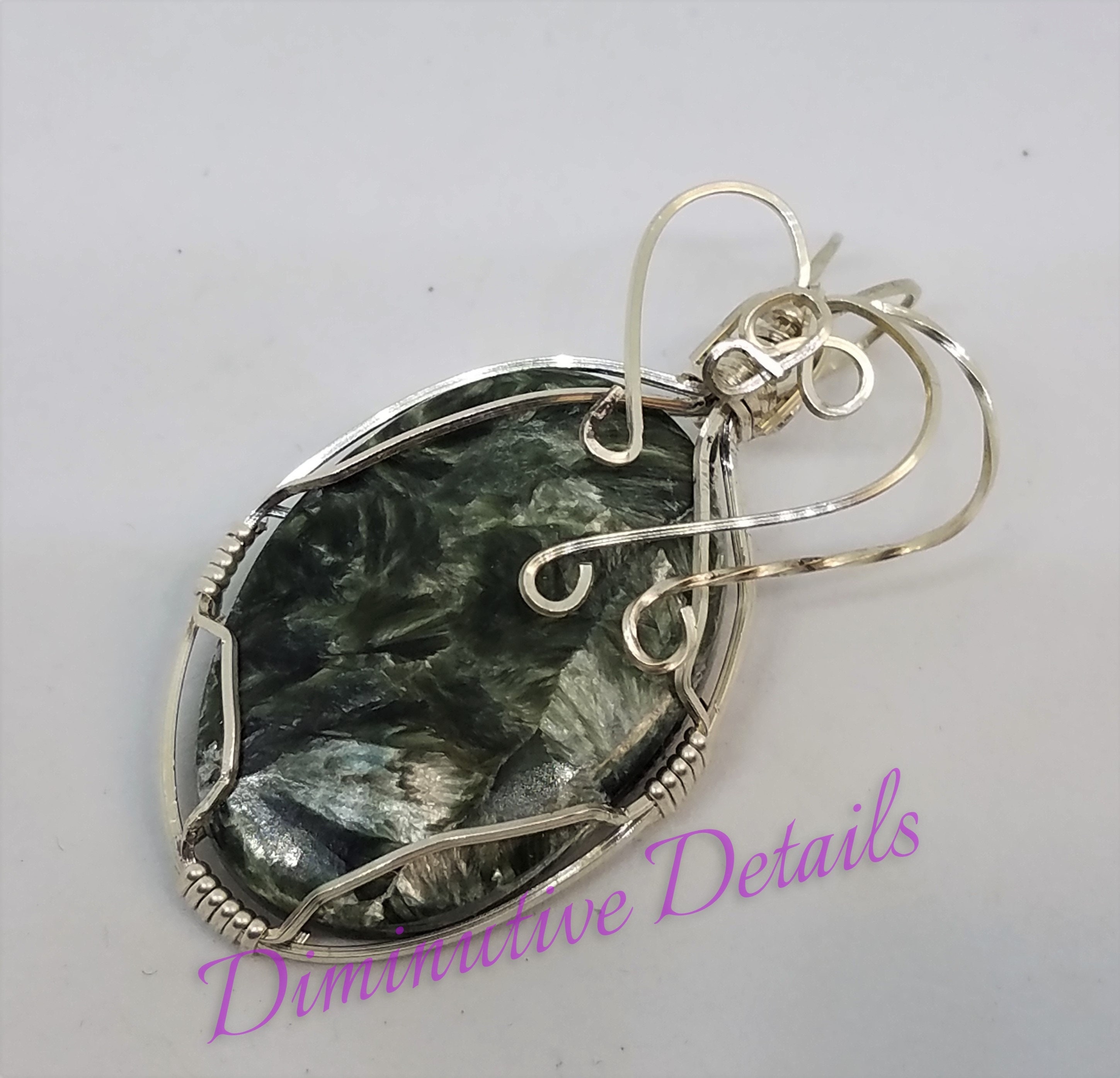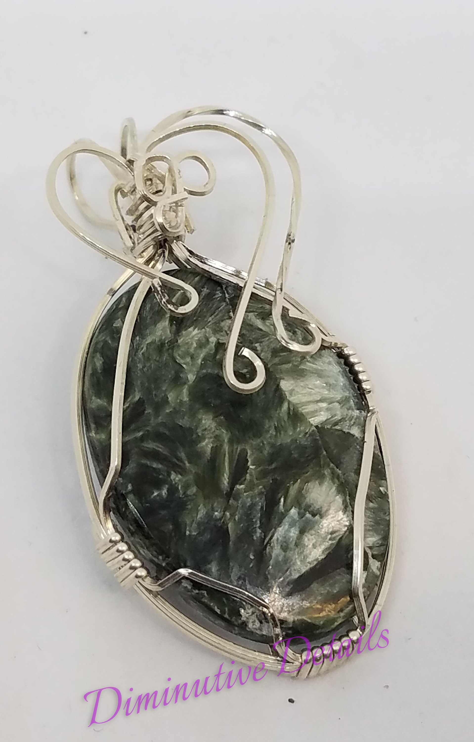 This beautiful green Seraphinite from Russia has a lovely chatoyancy that plays in the light. It is sure to get noticed. The stone is wrapped in Argentium Sterling silver which is a purer form of silver alloyed with less copper which reduces tarnishing. The Piece mesures just over 2 inches long and just over 1 inch wide.