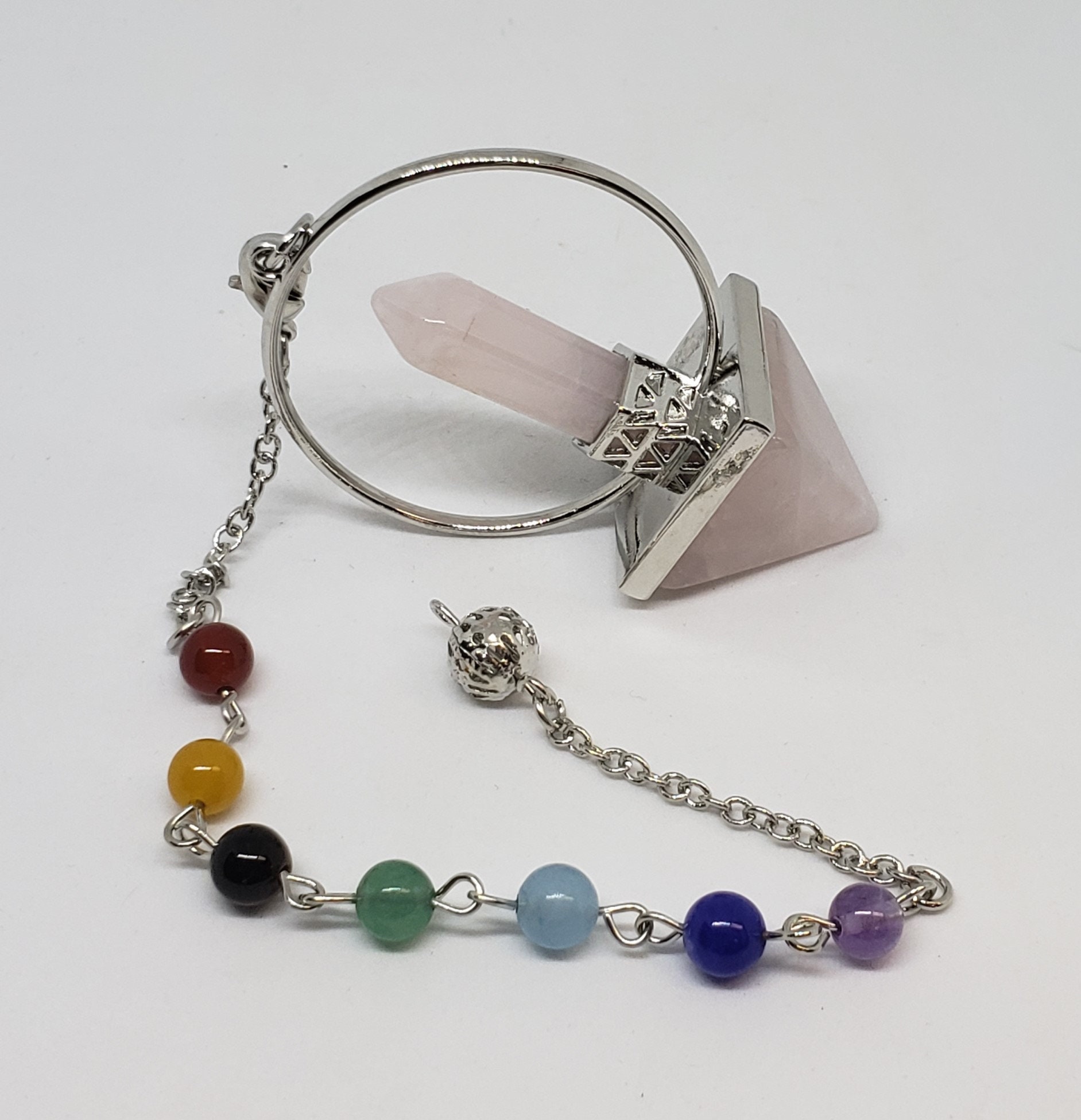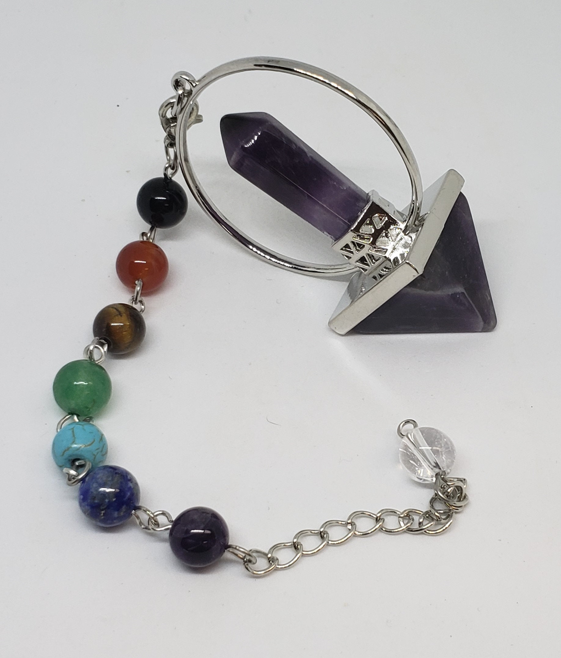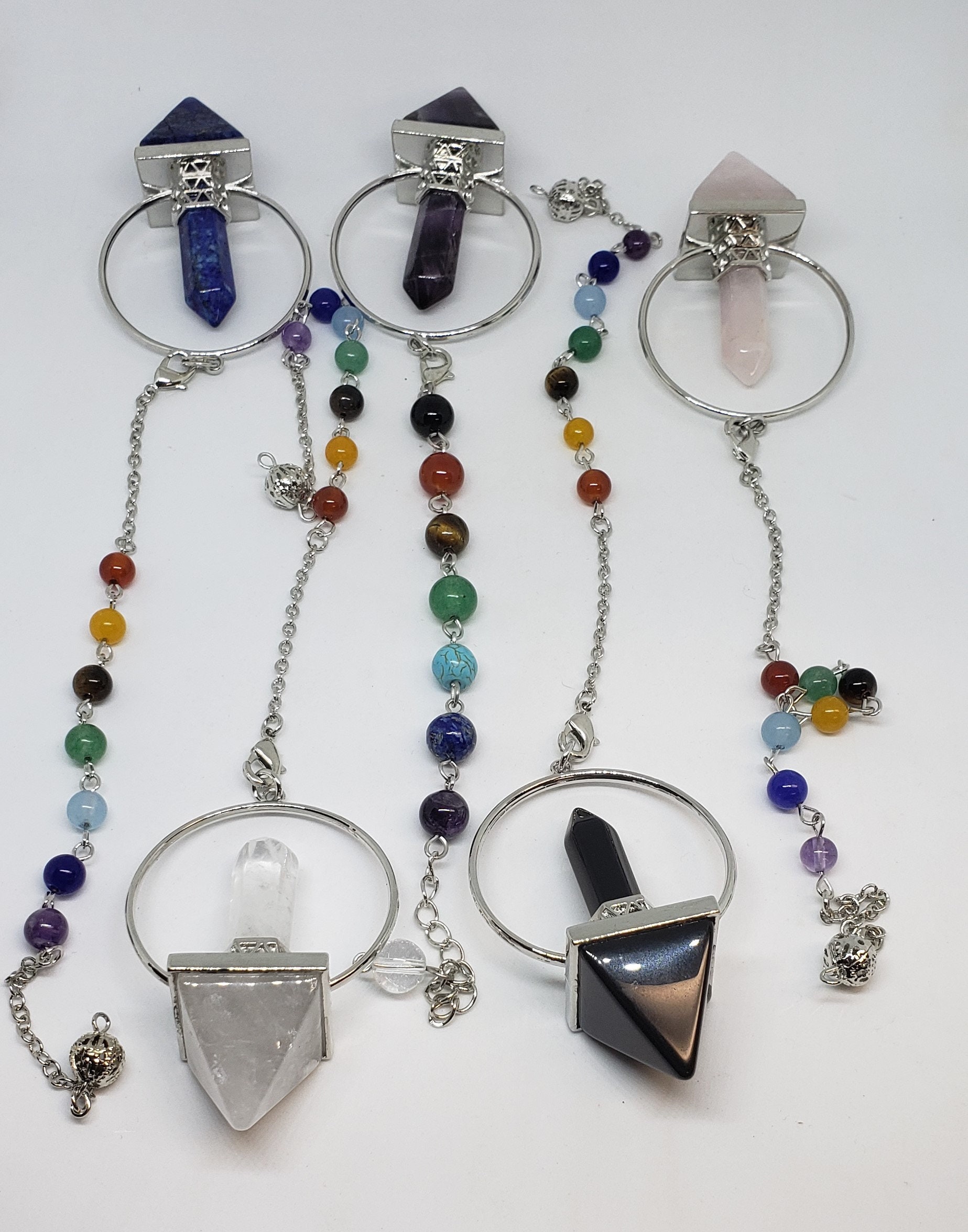Each pendulum is suspended on a beaded chakra chain.