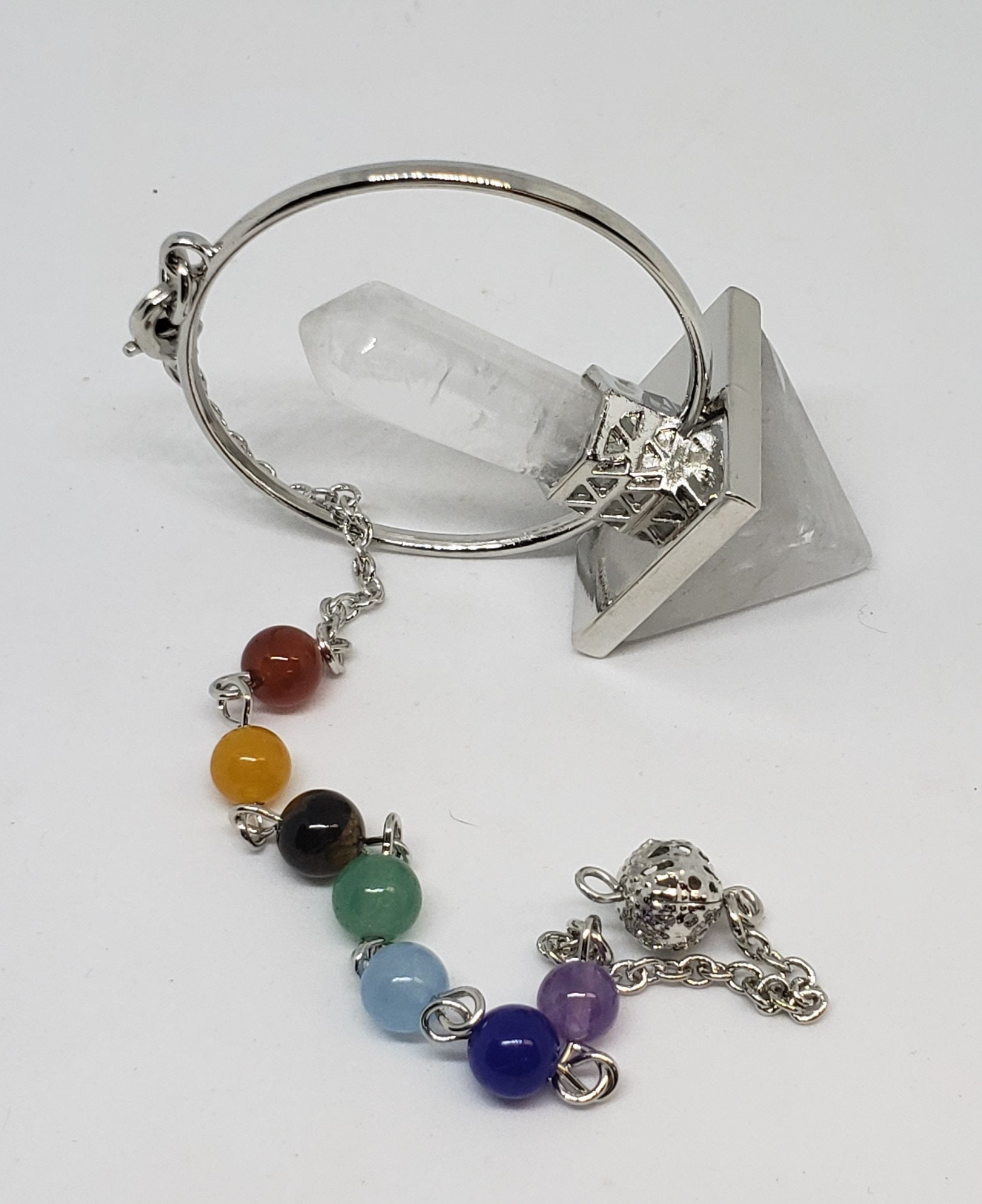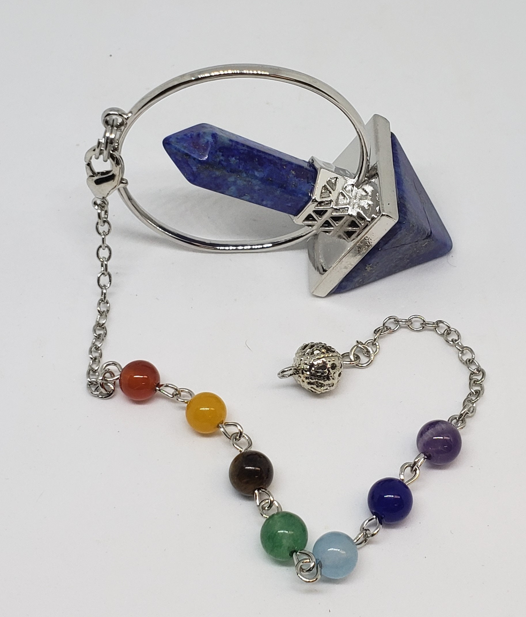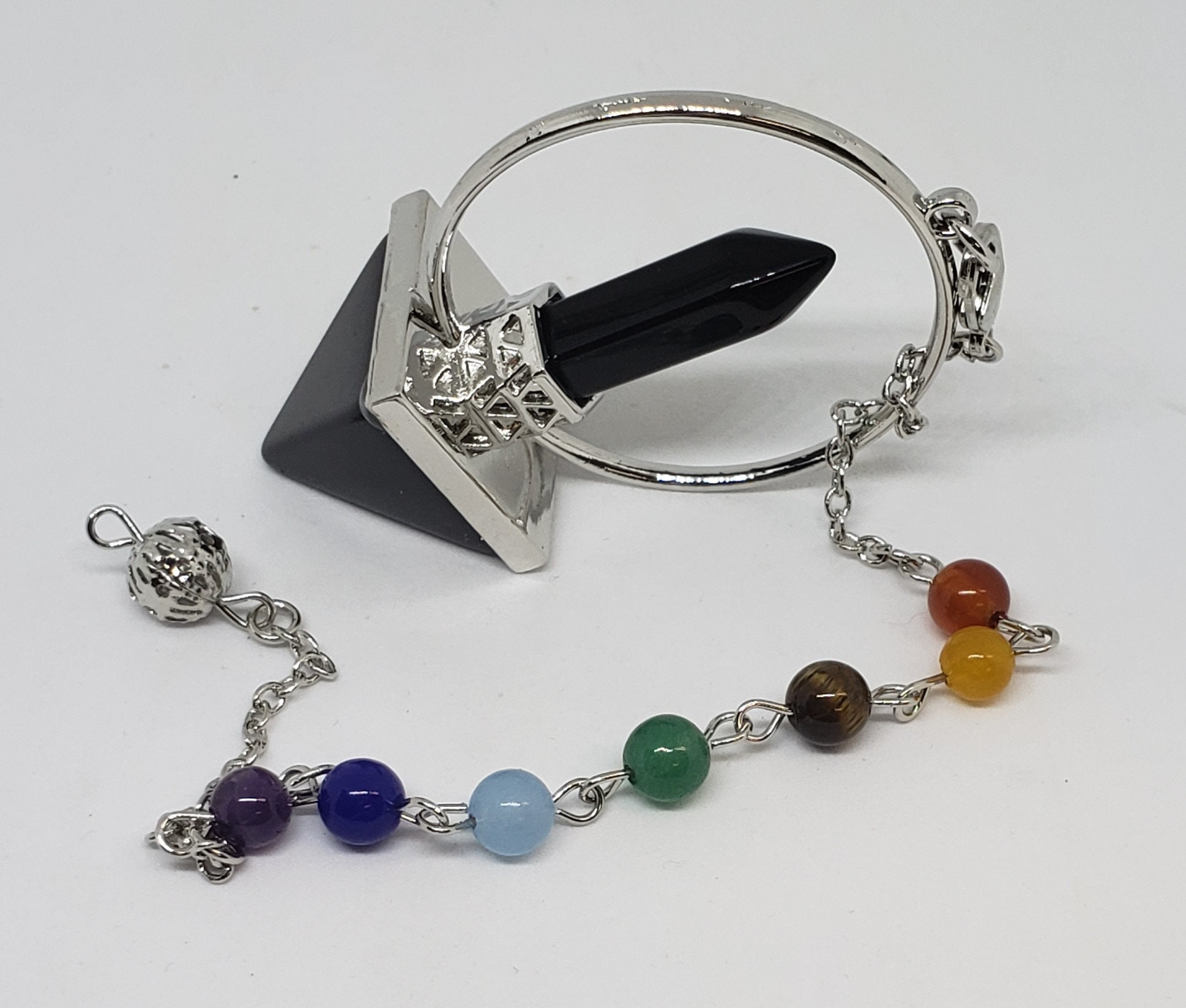 Each pendulum is suspended on a beaded chakra chain.