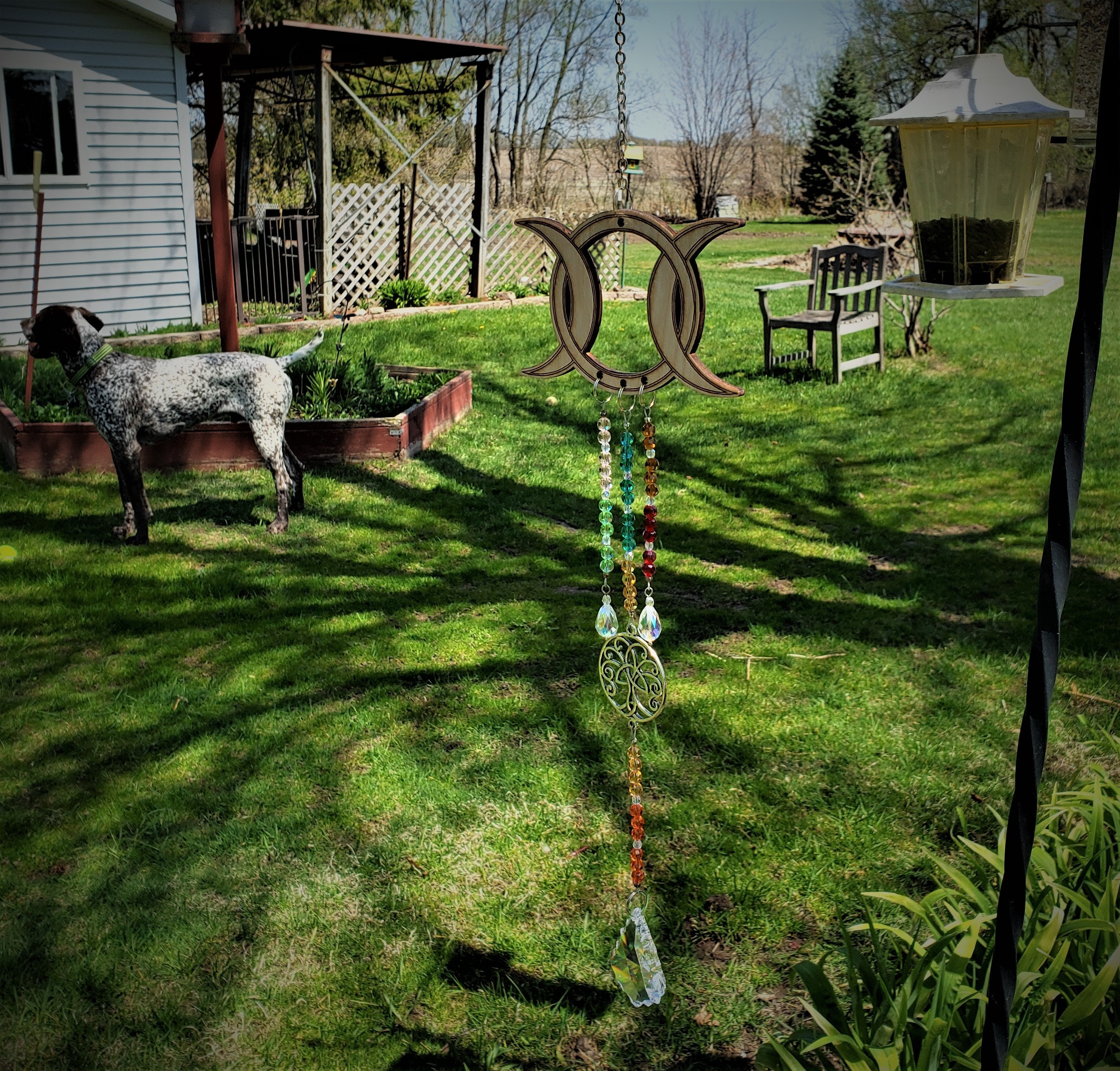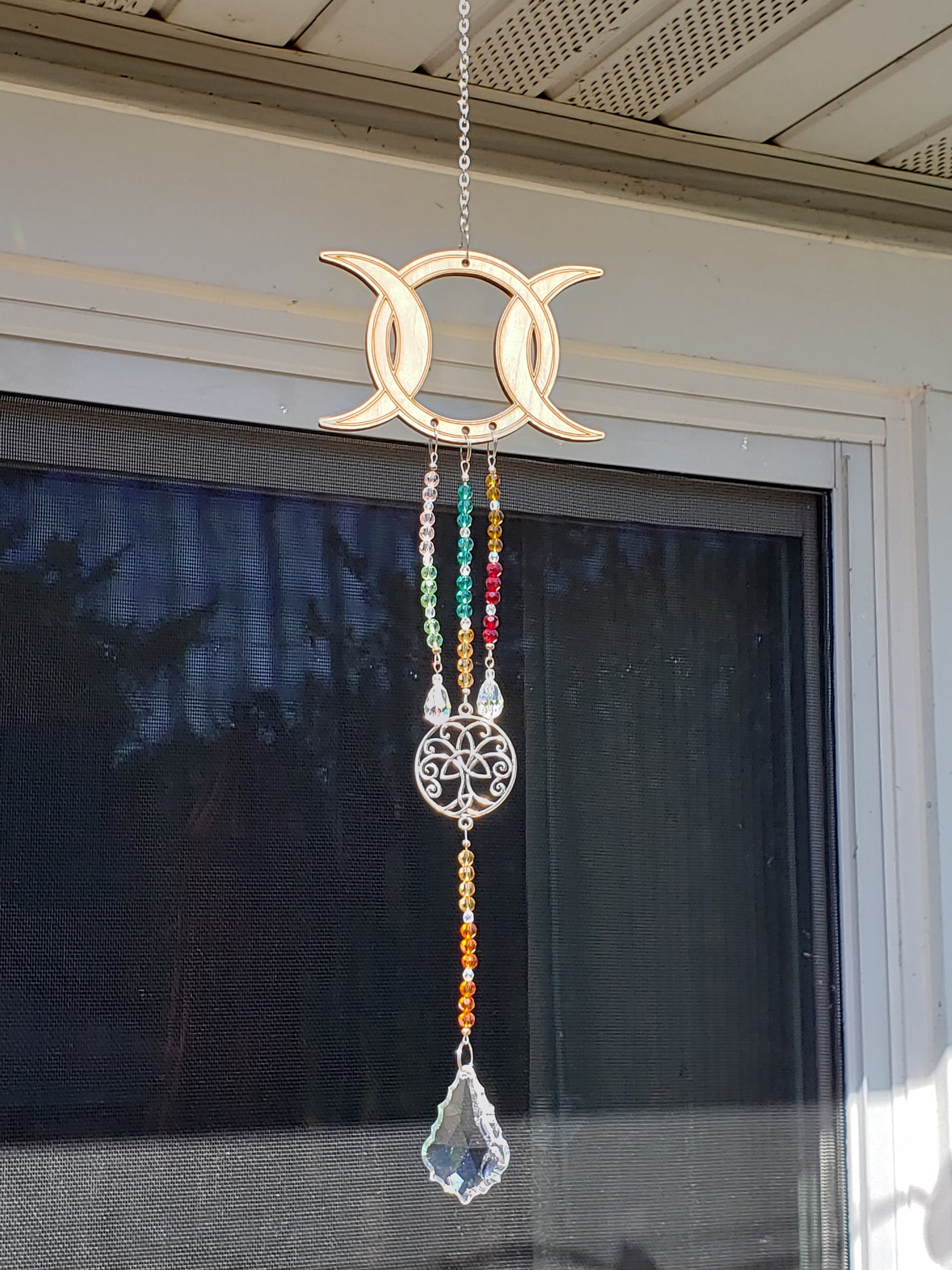Triple moon sun catcher features a large laser cut wooden center piece with multi color crystal beads and tree of life connector charm.