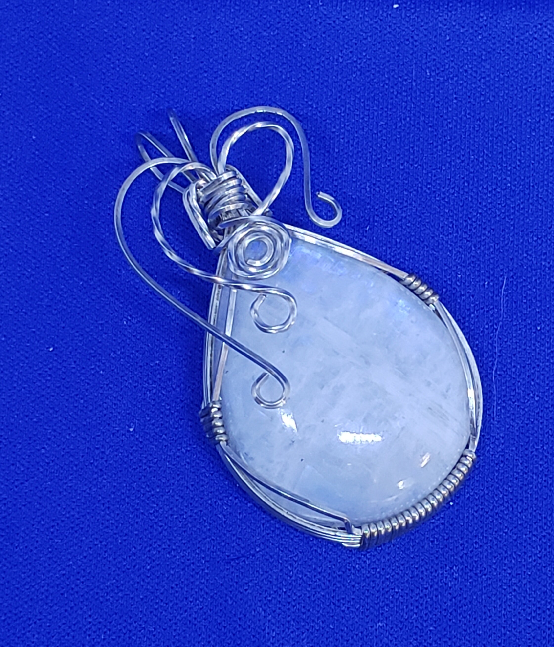 This beautiful Moonstone pear shaped cabochon is delicately set in sterling silver wire, with a bail large enough to accommodate most omega necklaces.